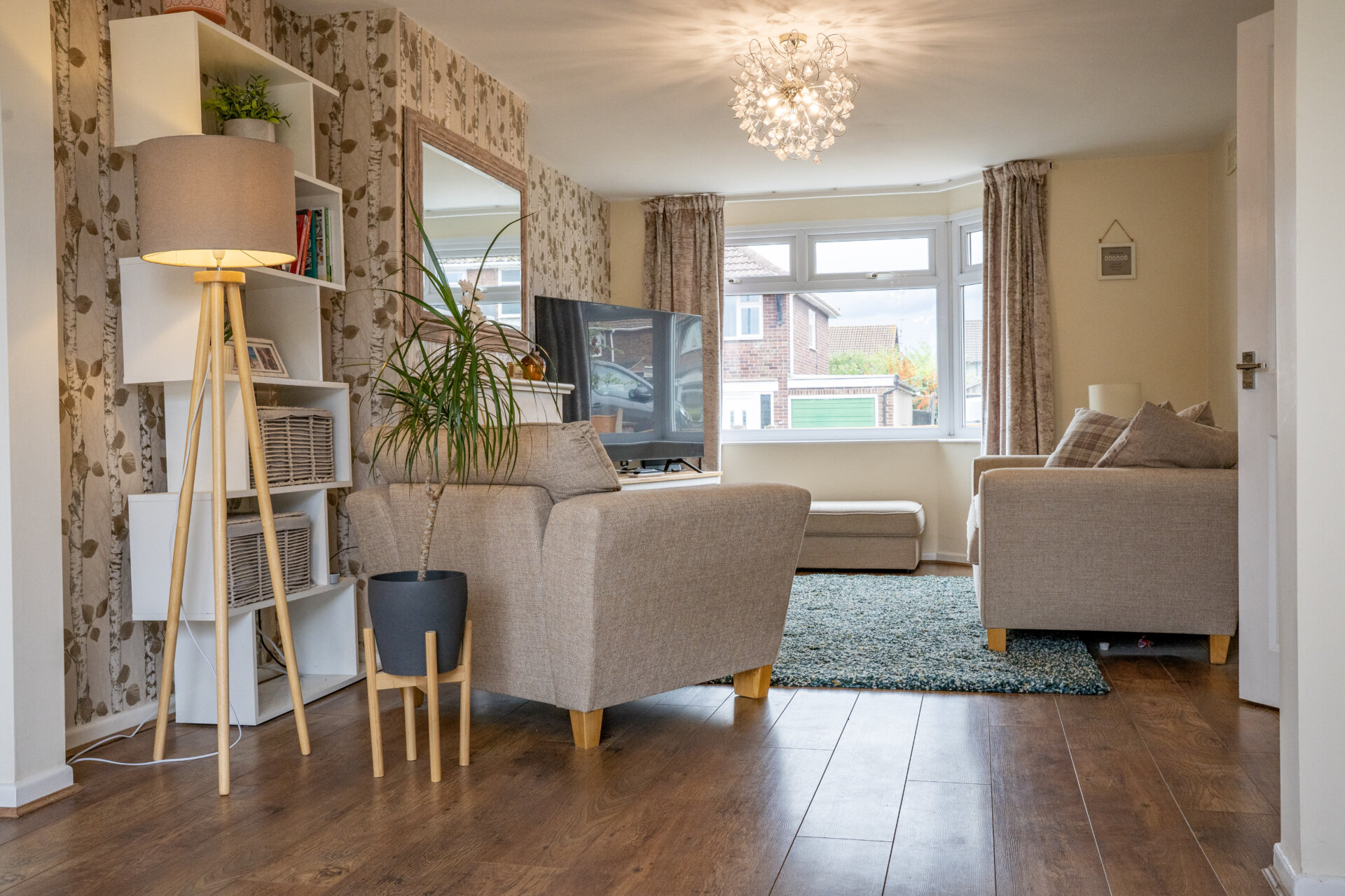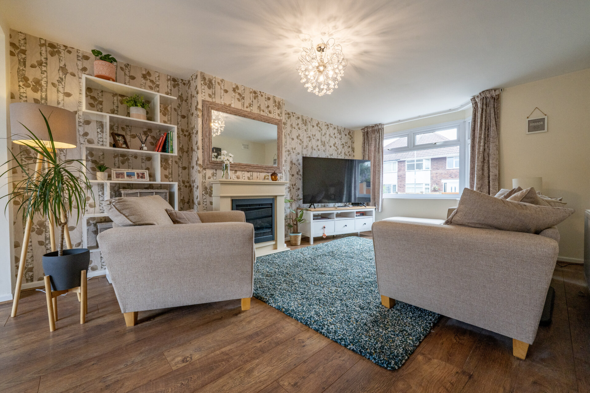 UPVC double glazed bay window to the front, wood effect laminate floor, feature fireplace with a flame effect fire, radiator and open to