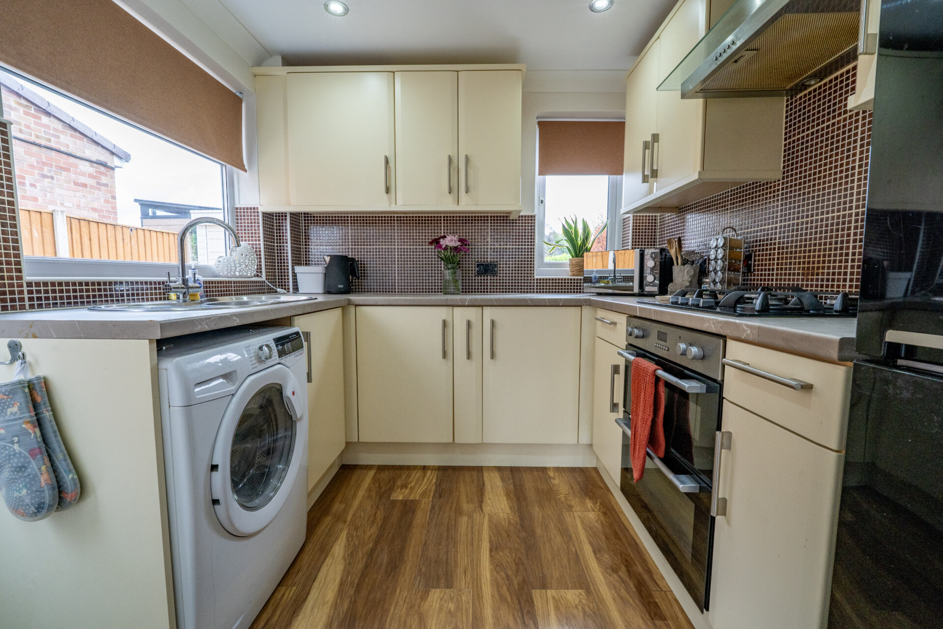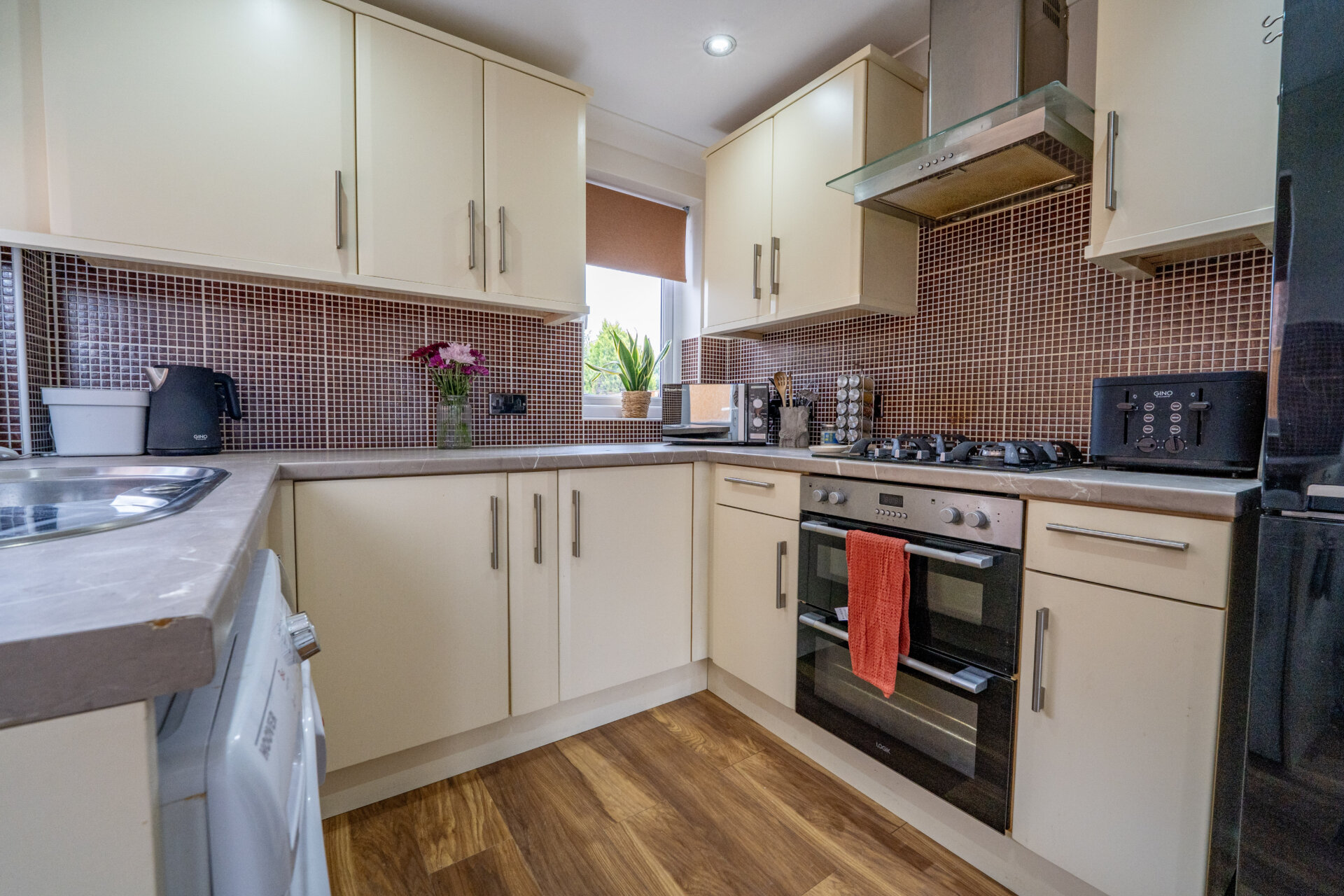 Wall, base and drawer unit with work surface over, stainless steel sink and drainer unit with swan mixer tap over, tiled walls and splashbacks, built-in oven, grill, gas hob and extractor hood over, coving to the ceiling, appliance space, plumbing for automatic washing machine, door to understairs storage/pantry, UPVC double glazed window and rear exit door.
