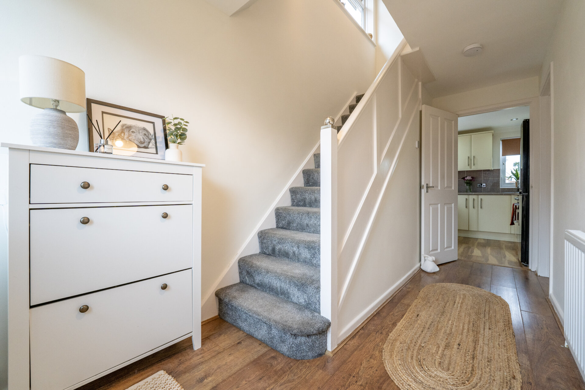 UPVC double glazed front entrance door, wood effect laminate floor, stairs to the first floor landing and doors to
