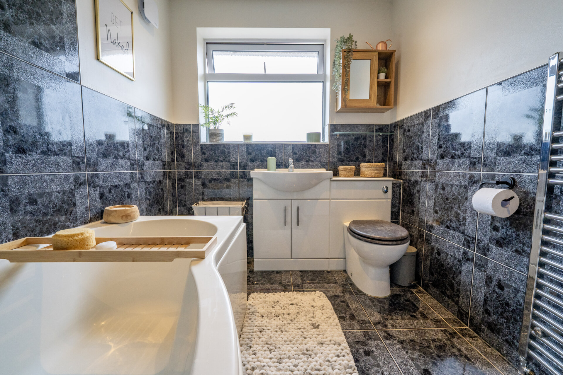 P-shaped bath with shower from the mains, vanity unit with low flush w.c, and sink, tiled walls and splashbacks, tiled floor, extractor fan, spotlights, chrome heated towel rail, UPVC double glazed window.
