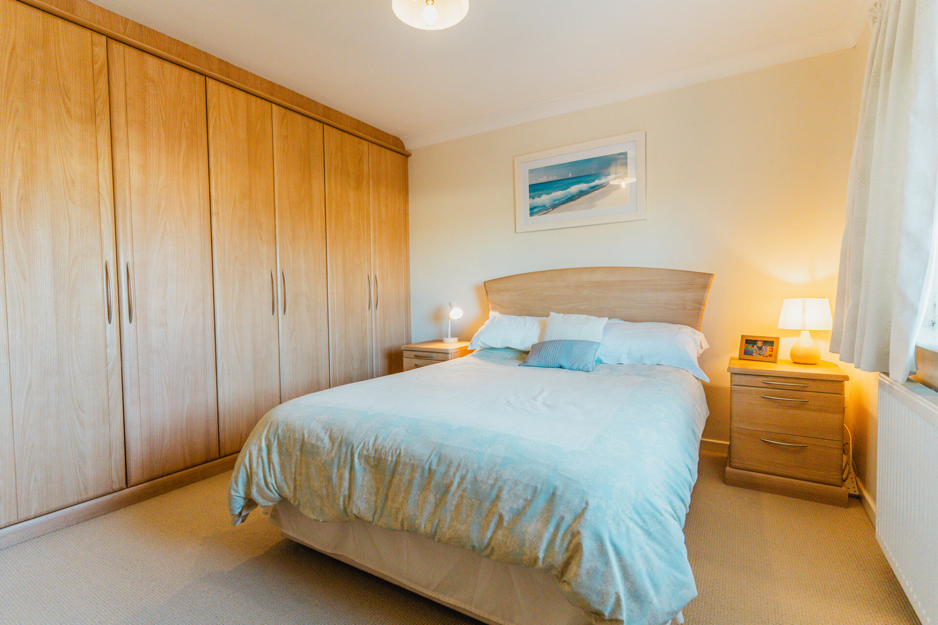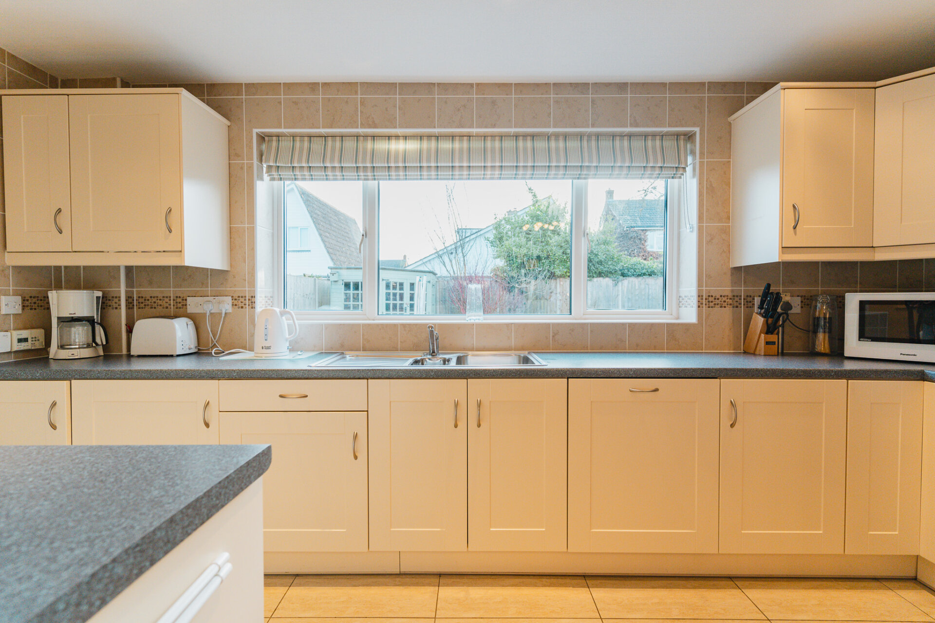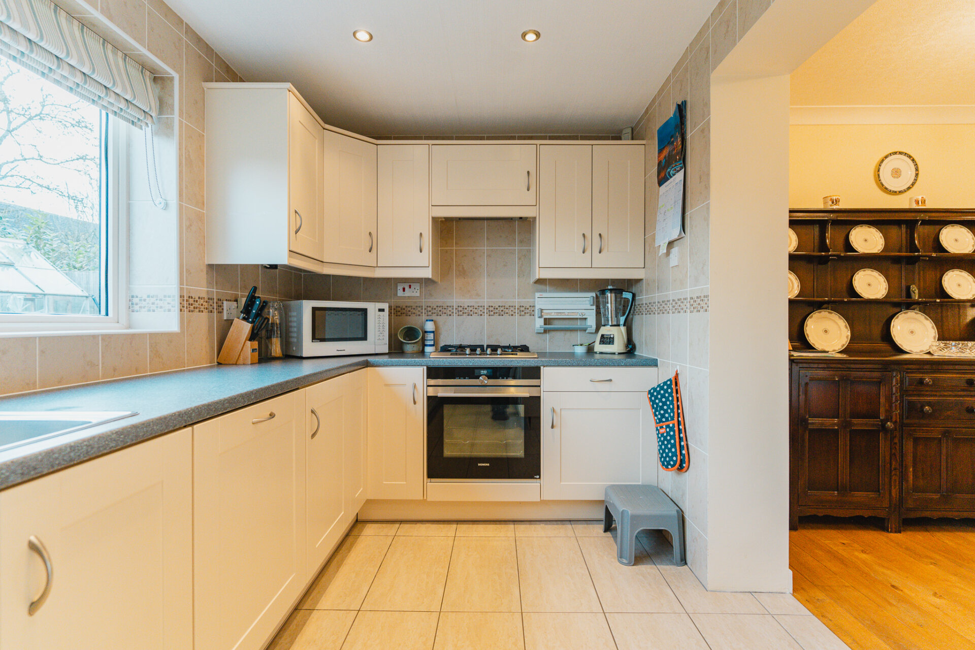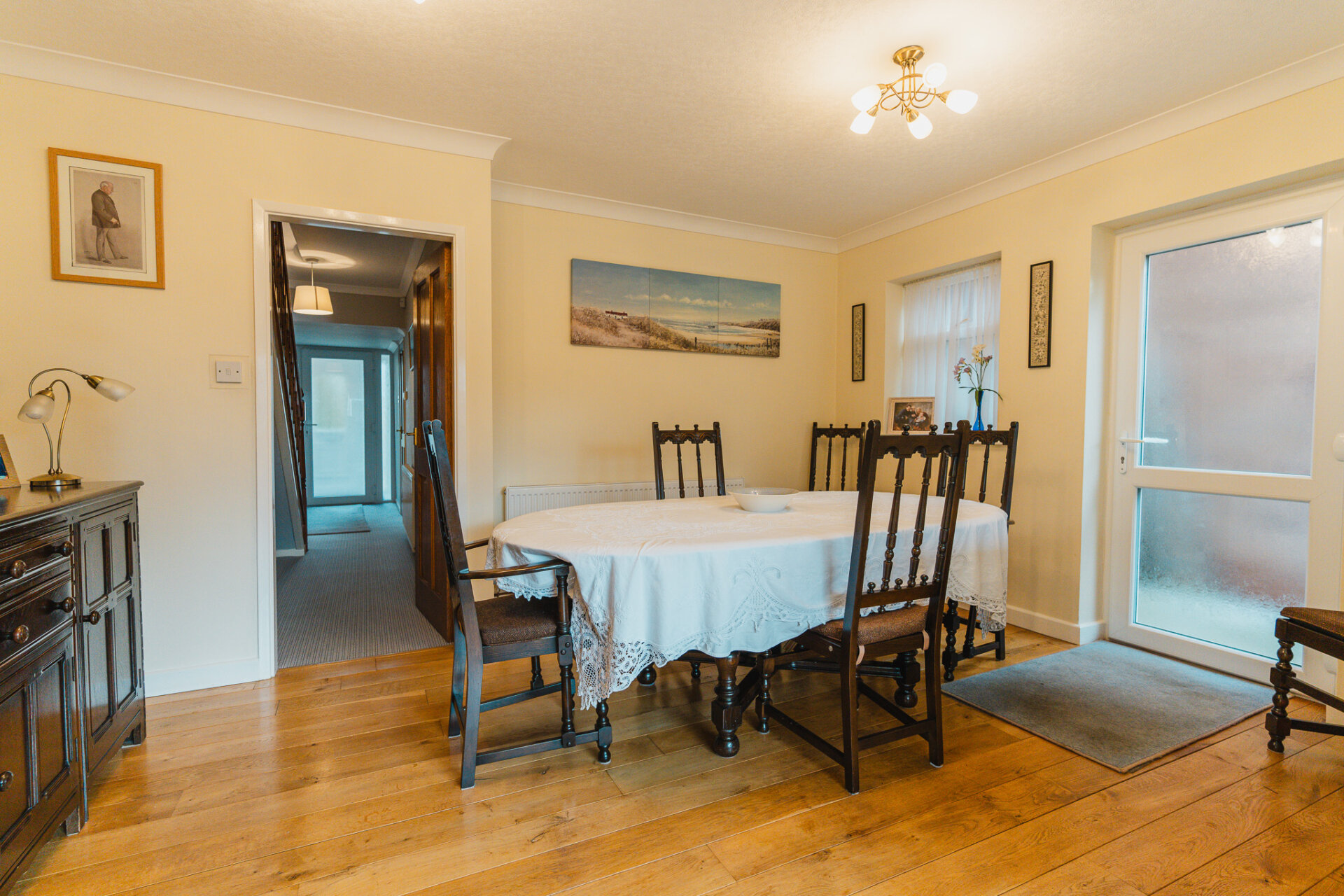 Continuing through the entrance hall, past the convenient (and recently refitted) WC, the heart of family life unfolds in the open Kitchen/Diner. Adorned with oak flooring, the dining area accommodates an 8-seat dining table and dresser. The removal of the original exterior wall has seamlessly connected the kitchen which is fitted with a matching range of base and wall-mounted cabinets and drawers, ample worktop space, a fitted fridge/freezer, dishwasher, and Siemens oven and hob.