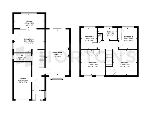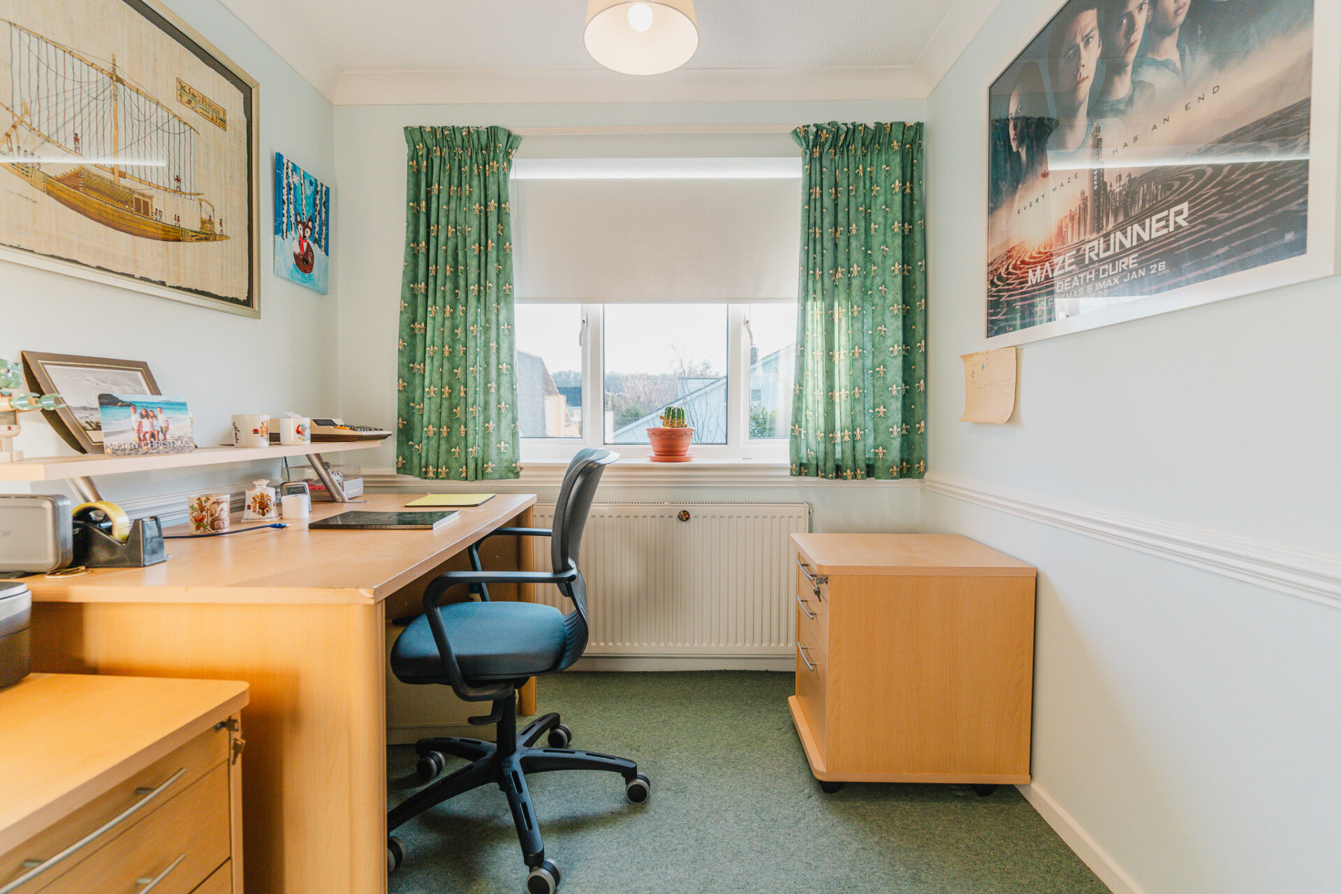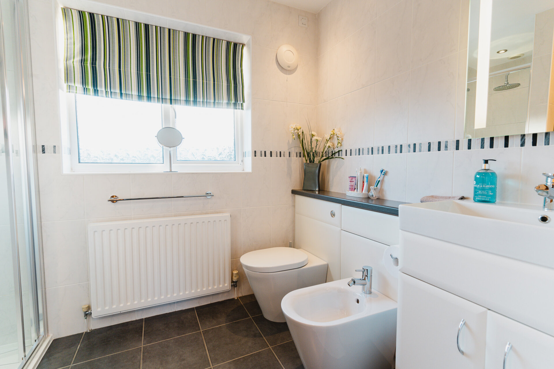 Venturing upstairs reveals four well-proportioned bedrooms and the family bathroom. The first two bedrooms, overlooking the front aspect, boast fitted wardrobes. Bedrooms three and four offer peaceful views of the rear garden, with the fourth bedroom currently serving as a versatile home office. The family bathroom showcases a modern four-piece suite, complemented by contemporary tiling, comprising a shower enclosure, WC, bidet, and vanity basin.