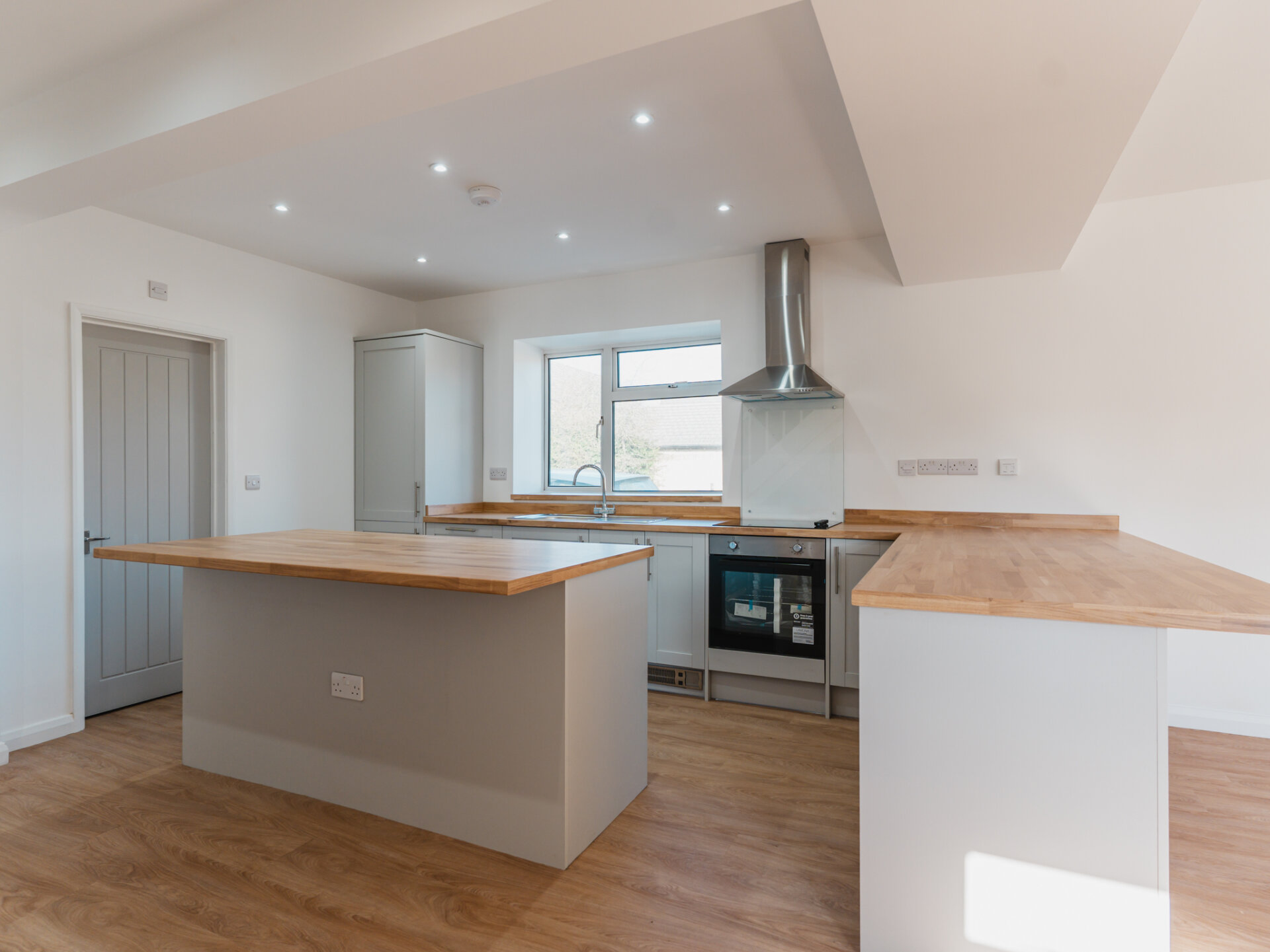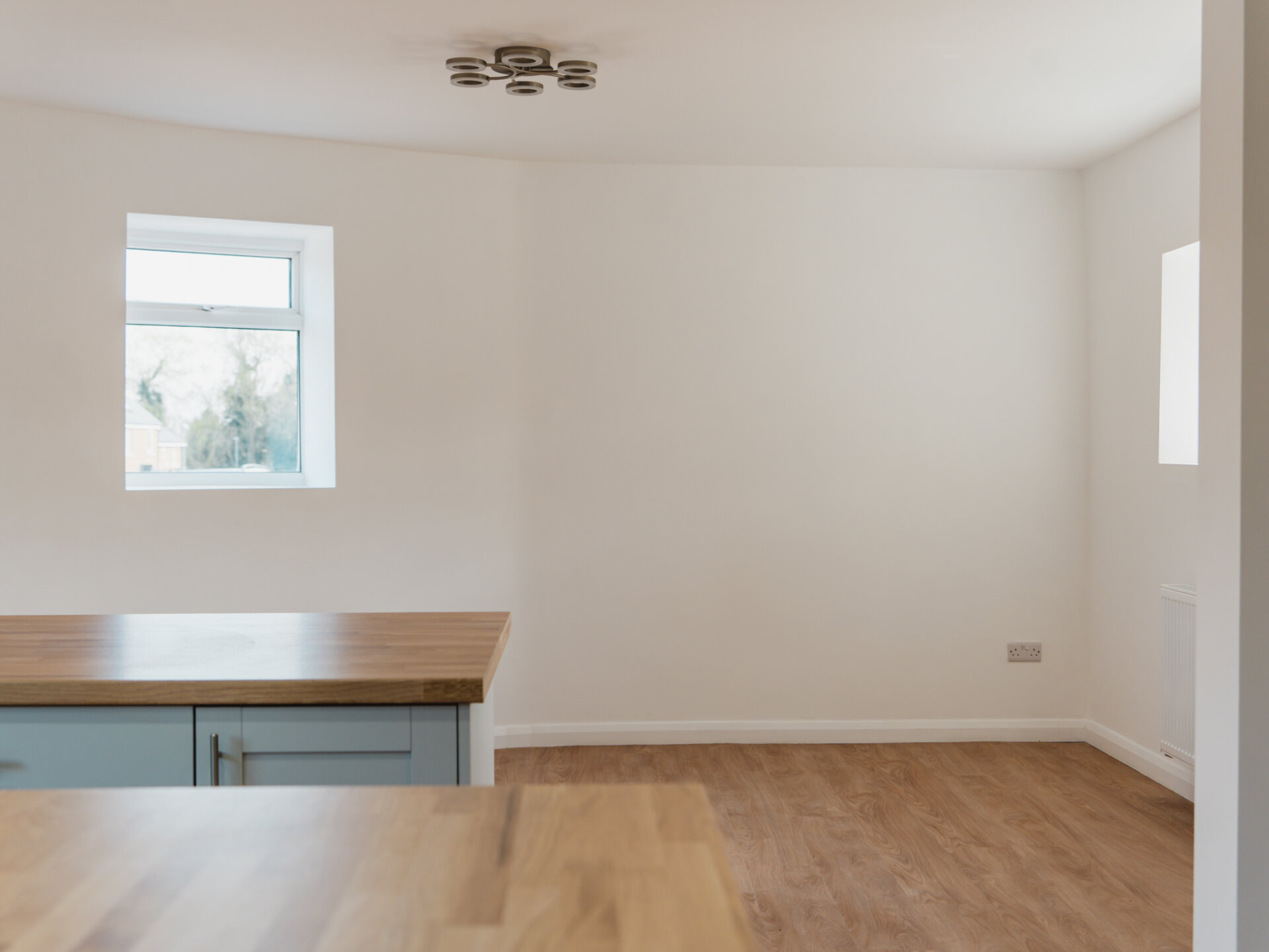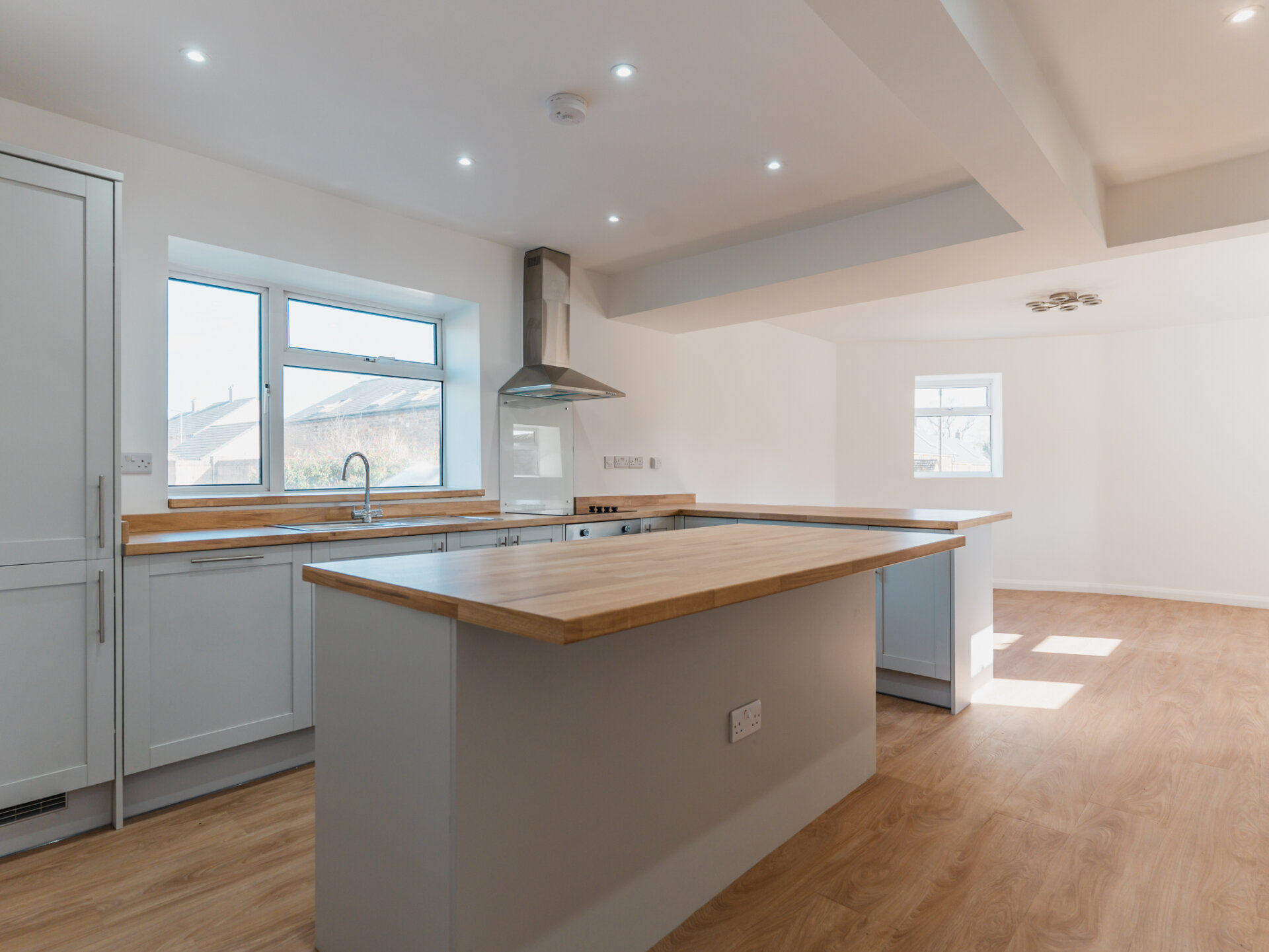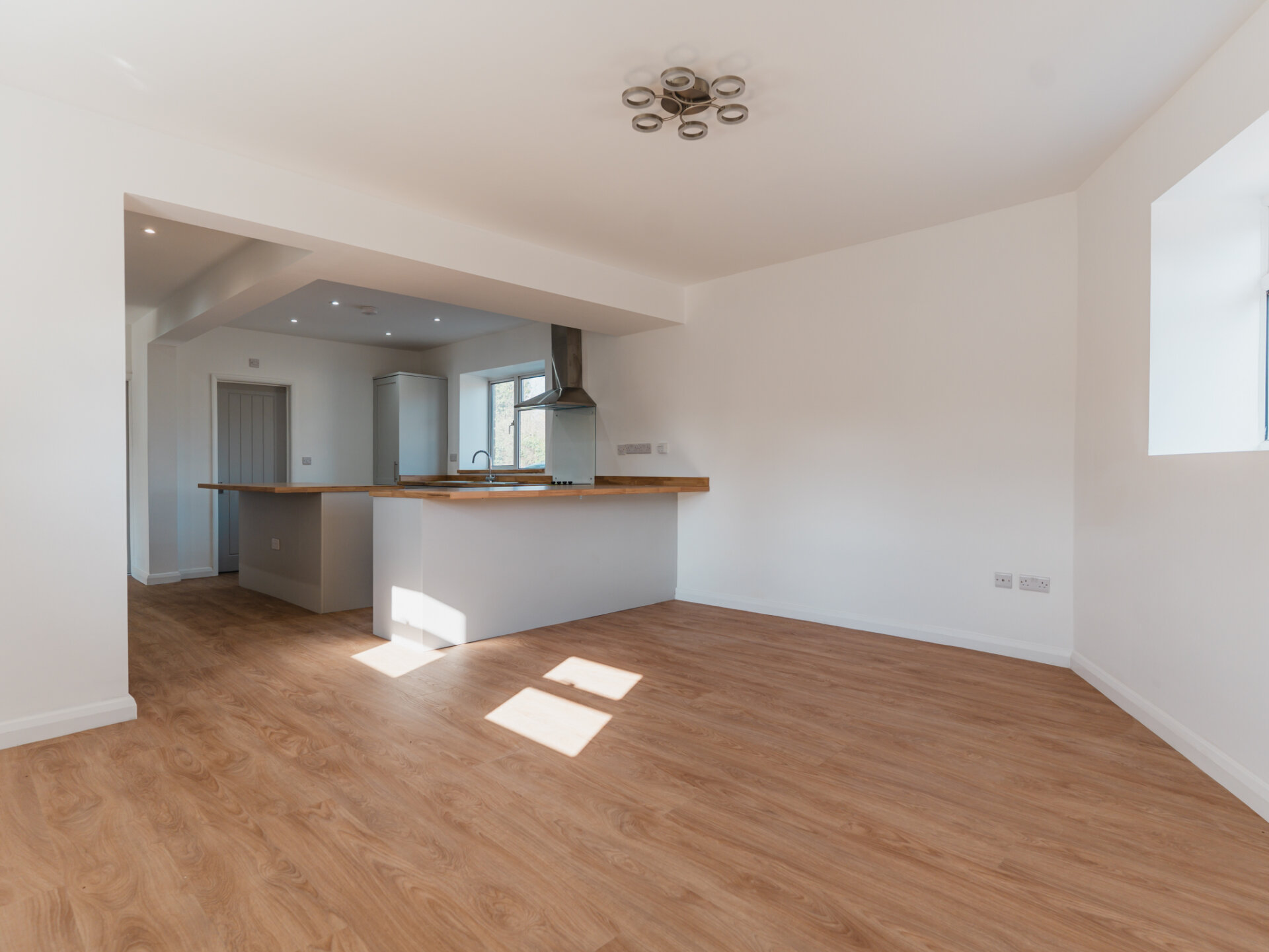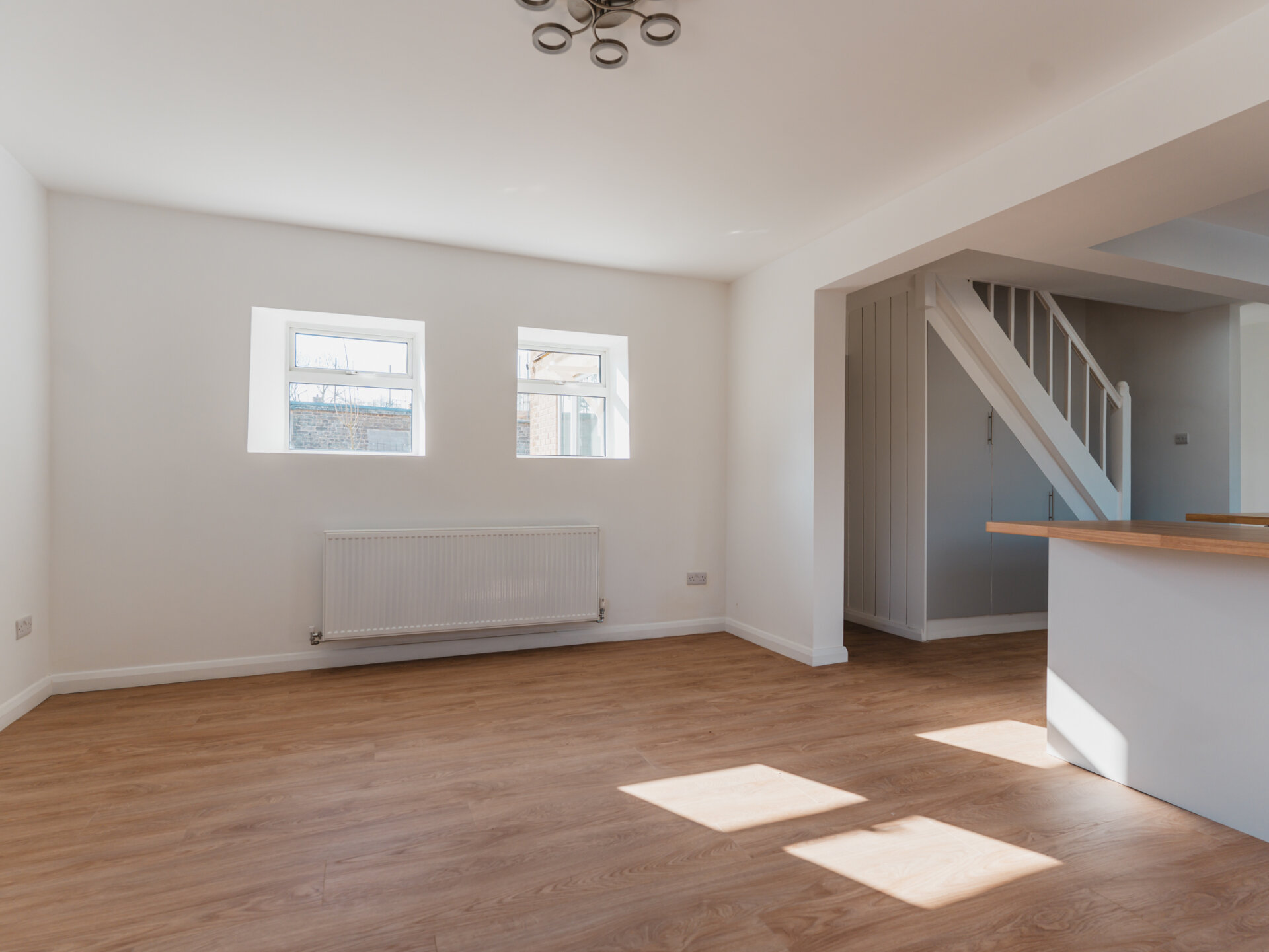 Stepping inside from the rear, you are welcomed into a small yet practical entrance hall, leading into the heart of the home – a breathtaking open-plan kitchen and dining space. Once two separate rooms, this area is now a bright and sociable space, perfect for entertaining. The brand-new kitchen boasts modern shaker-style units, oak-effect worktops, and a central island providing one of two breakfast bars. Fully equipped with integrated appliances, including an electric oven, induction hob, fridge/freezer, and dishwasher, this kitchen is both stylish and functional.