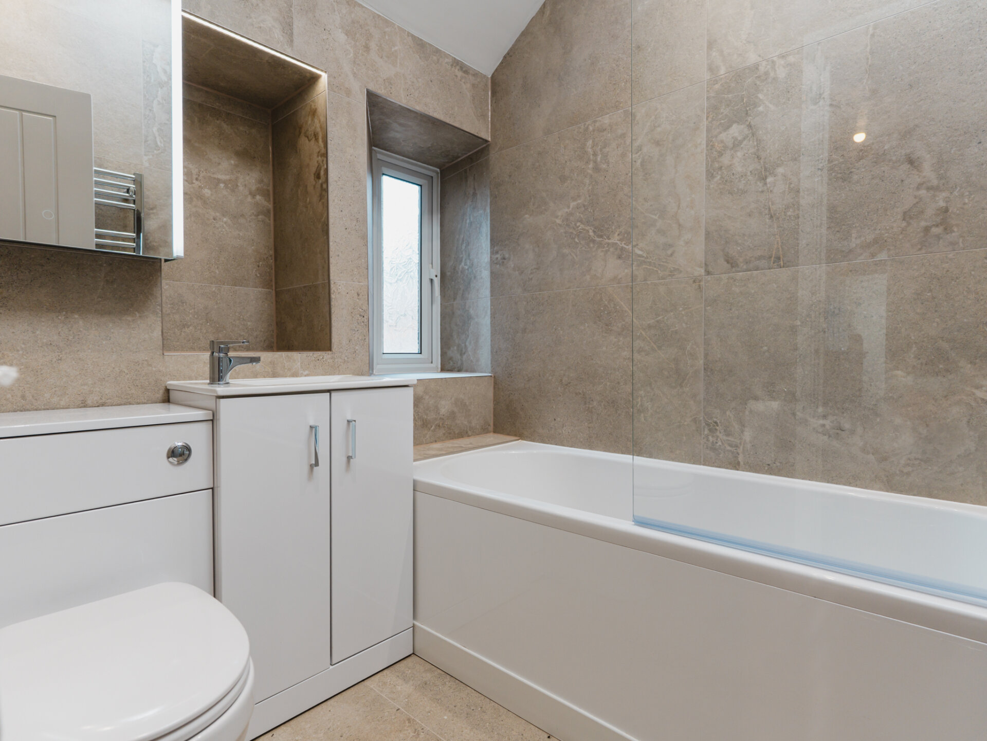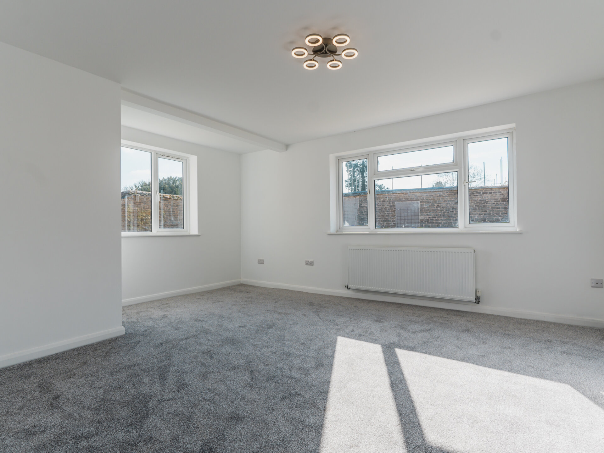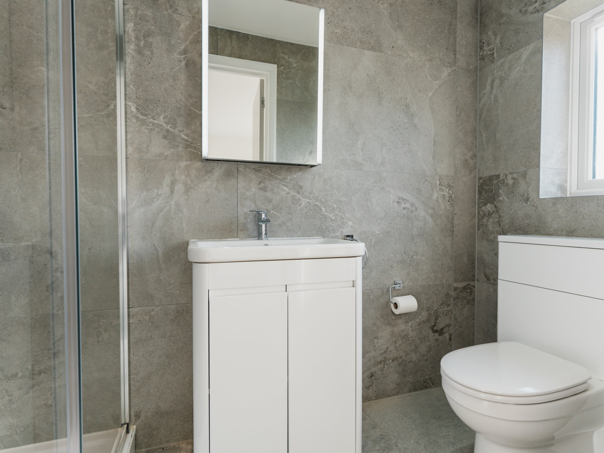 Upstairs, the master suite is a true retreat. This generously sized bedroom enjoys dual-aspect views and features a luxurious ensuite shower room, complete with a white three-piece suite, including a double-width shower enclosure, vanity handwash basin, and hidden cistern WC. The ensuite is fully tiled with elegant large-format grey stone tiles.