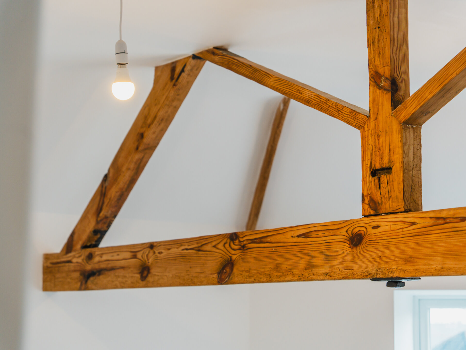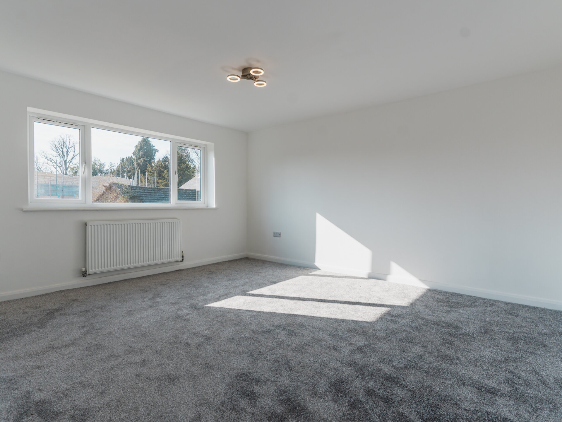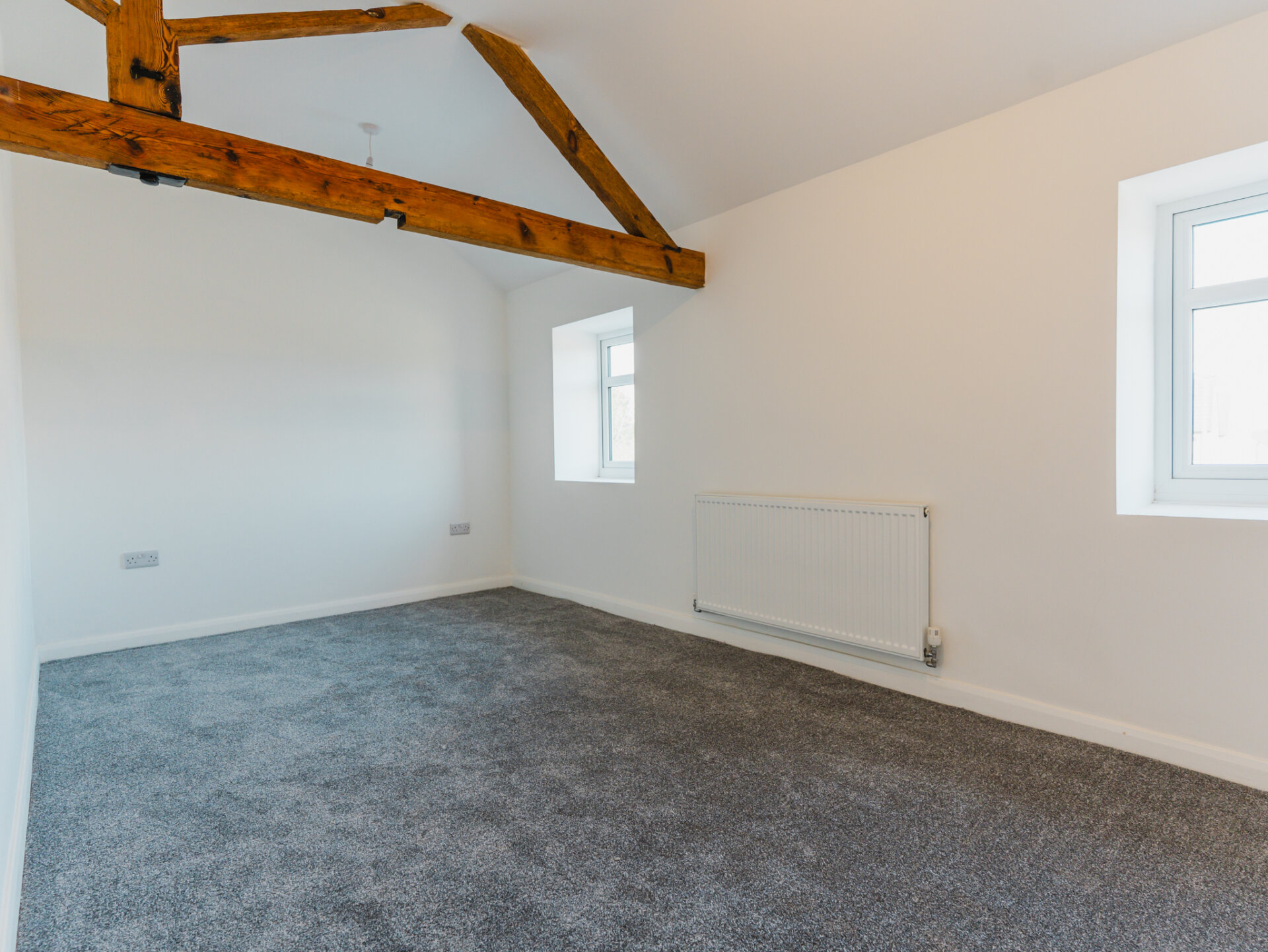 Bedrooms two and three are both spacious doubles, filled with natural light thanks to multiple windows to the front and side aspects. Partially vaulted ceilings with exposed trusses add a touch of character to these charming rooms, and contrast wonderfully with the fresh plasterwork. Both are serviced by a stunning family bathroom, which, like the ensuite, is fully tiled and fitted with a modern white three-piece suite, including a bath with an overhead shower, a vanity handwash basin, and a hidden cistern WC.