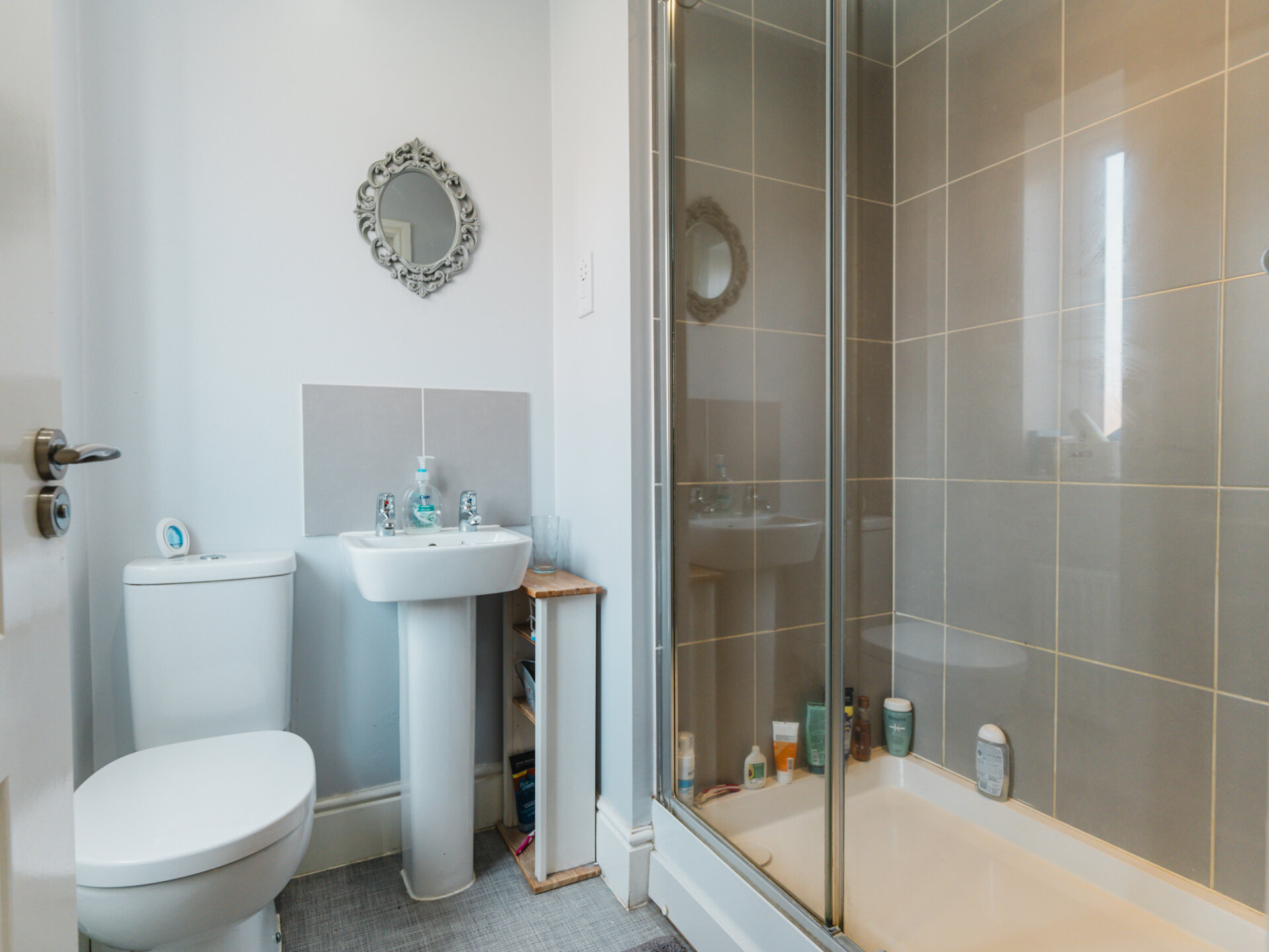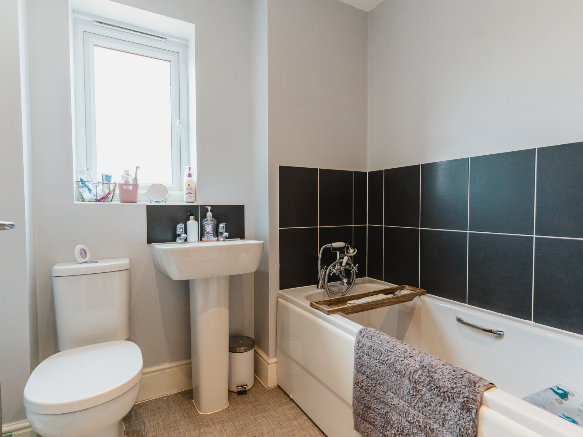 Ascending the stairs to the first floor, you'll discover three generously proportioned bedrooms. The main bedroom, positioned to the front, exudes comfort and convenience with its fitted wardrobes and a shower room ensuite. Bedrooms two and three share access to the well-appointed family bathroom, complete with a three-piece suite for utmost relaxation.