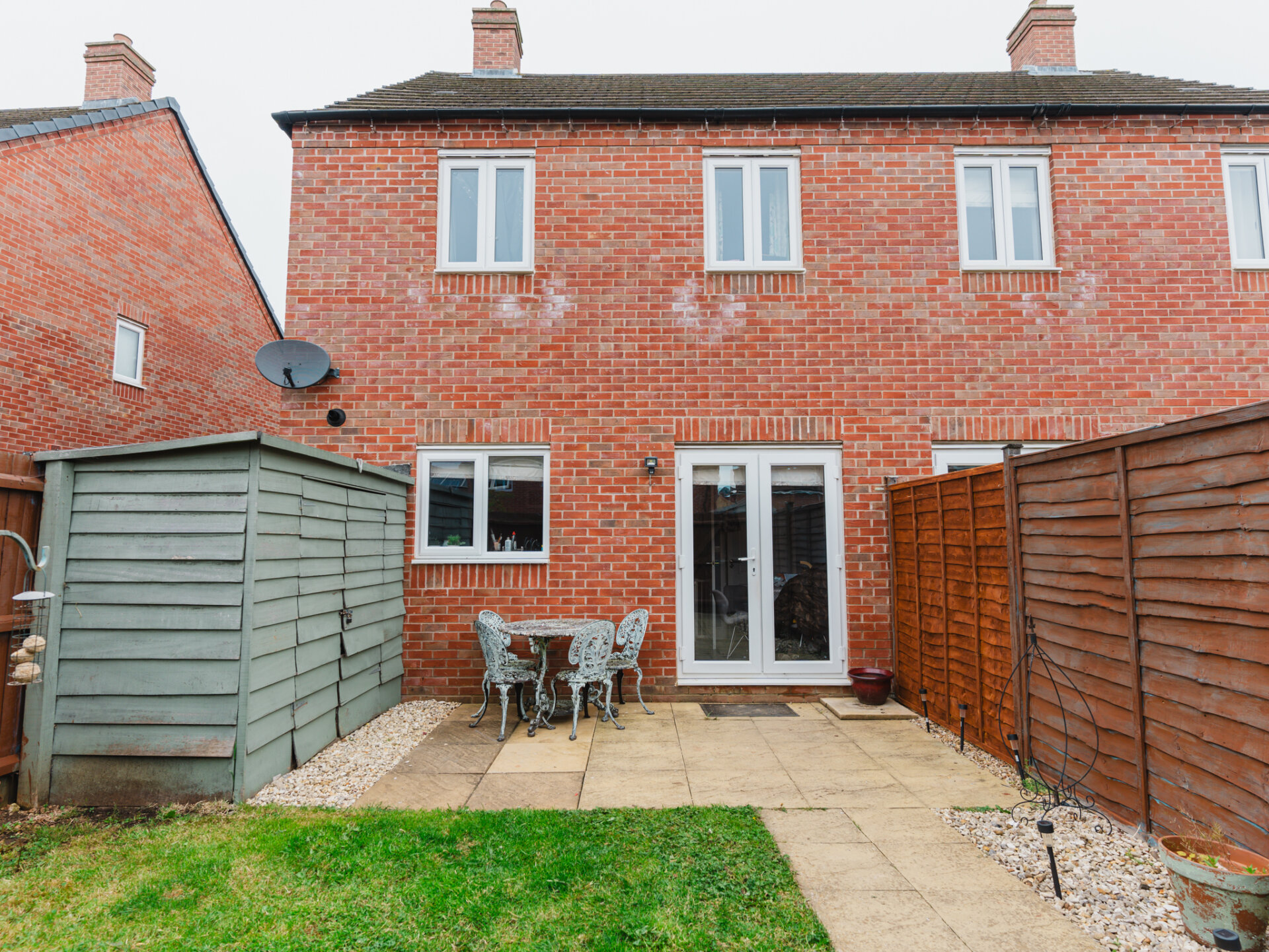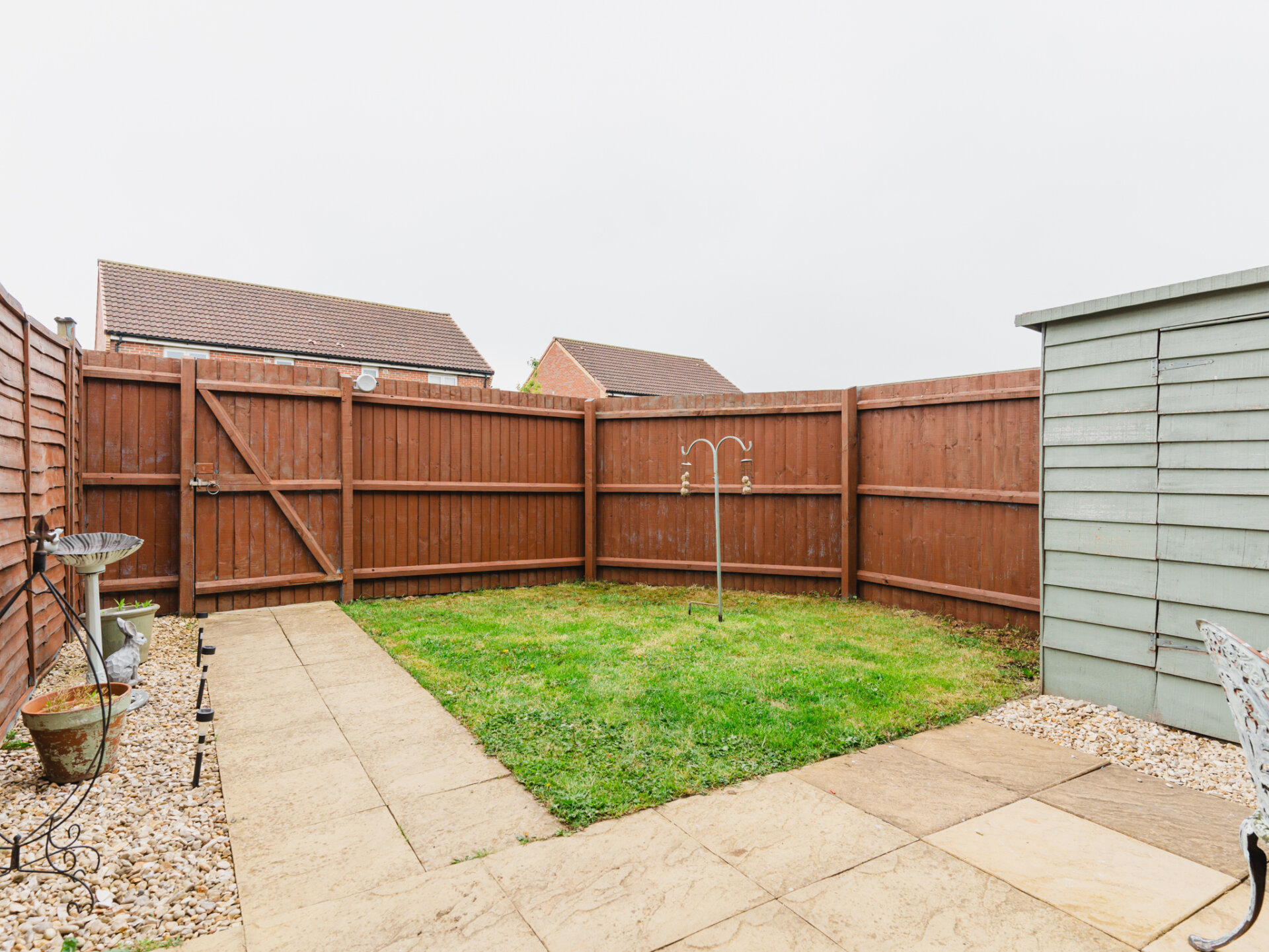 Outside, the allure continues with a south-facing garden offering a serene retreat. A large patio seating area extends from the kitchen, ideal for alfresco dining or simply unwinding in the sunshine. Beyond lies a neatly kept lawn, accompanied by a timber shed for additional storage needs. A pathway leads to a gate granting access to the two designated parking spaces, conveniently situated behind the home.