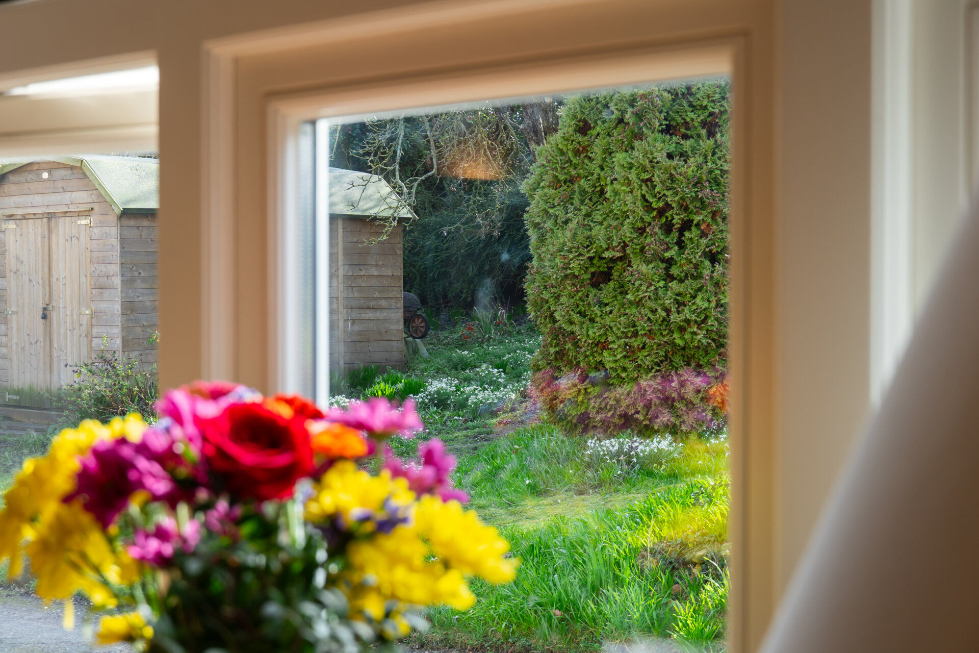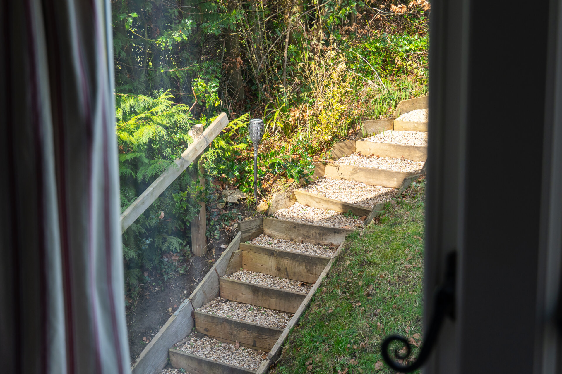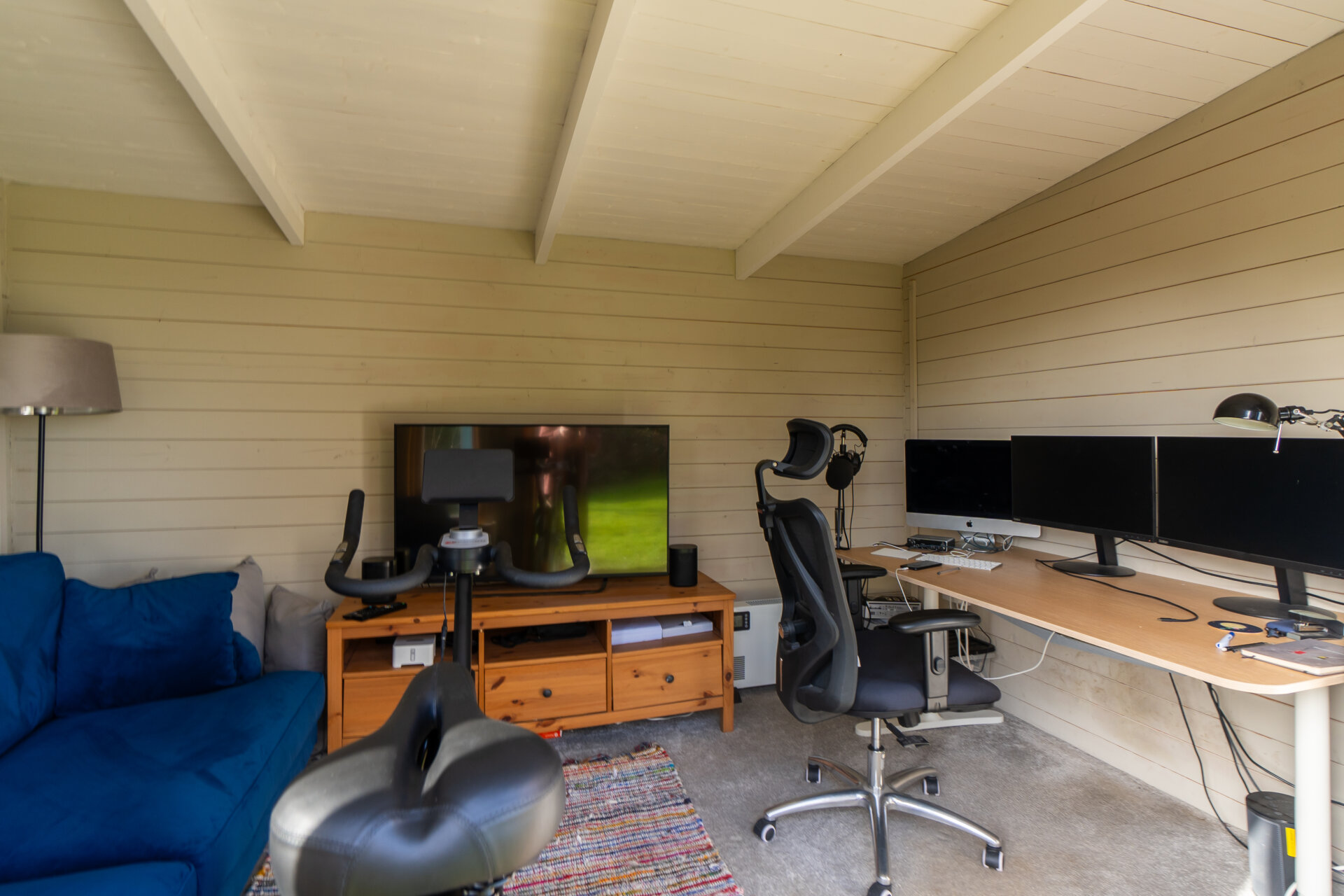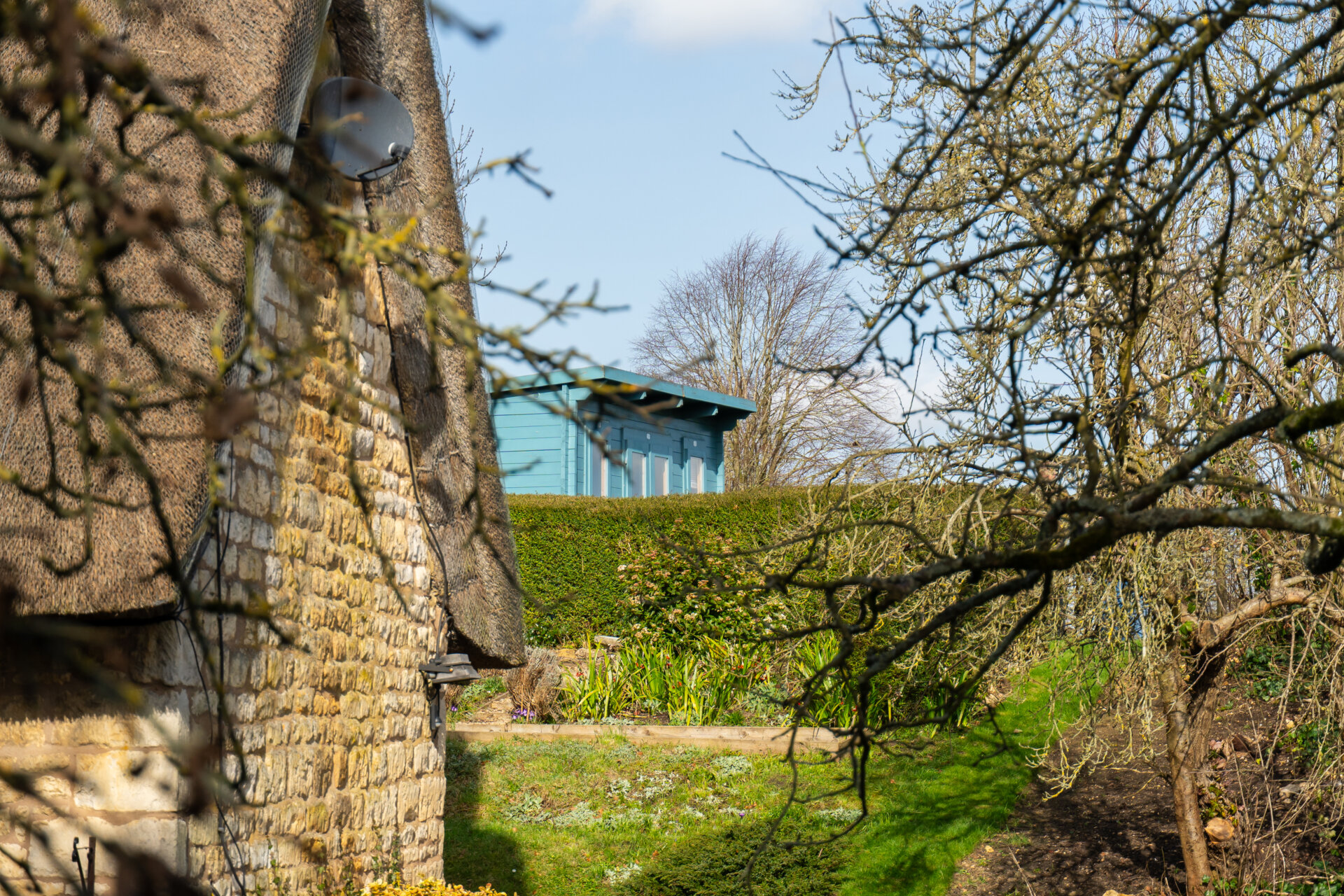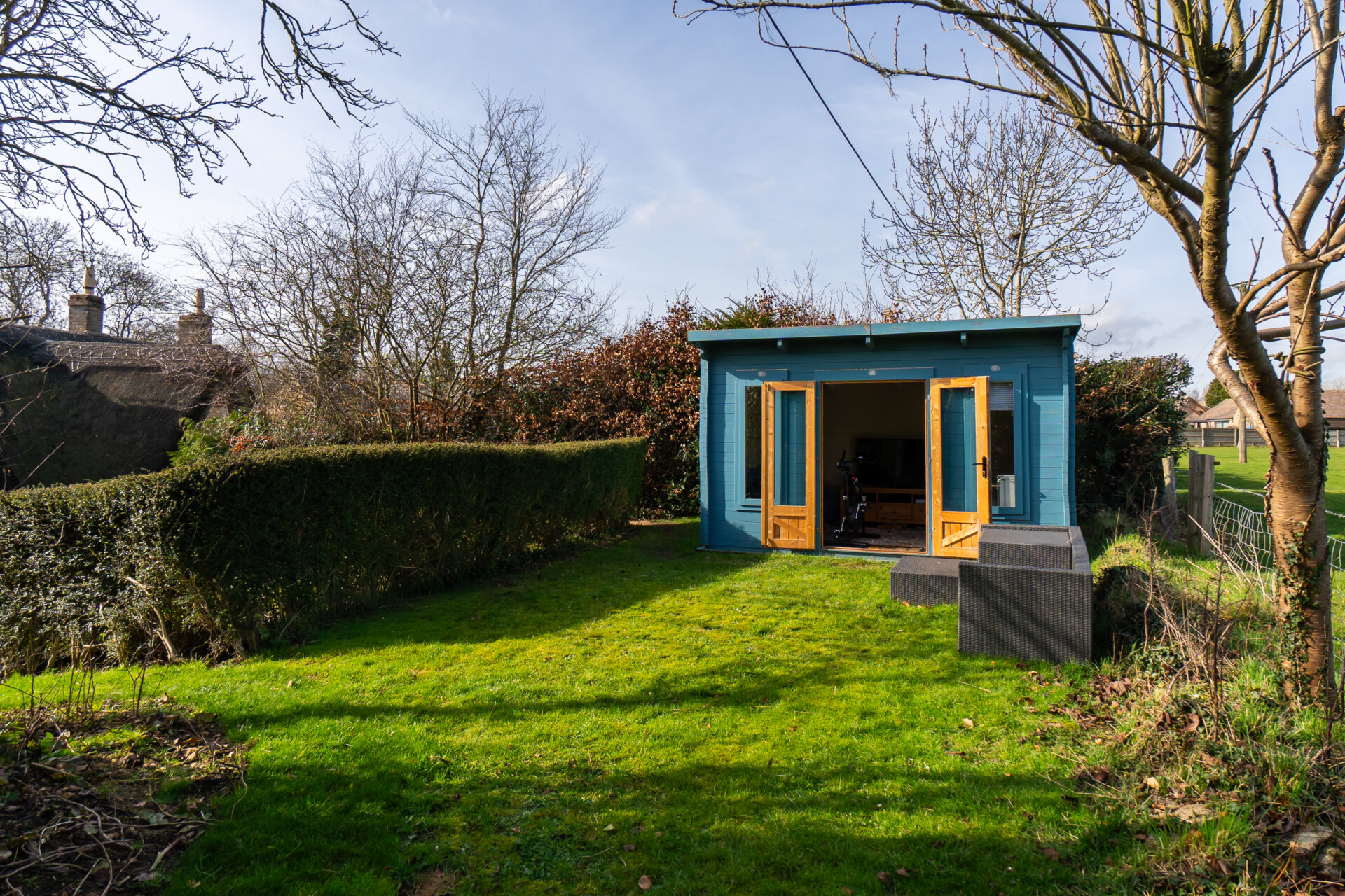 A timber home office garden room sits at the top of the garden, taking in the best views and also looking back towards the cottage.
