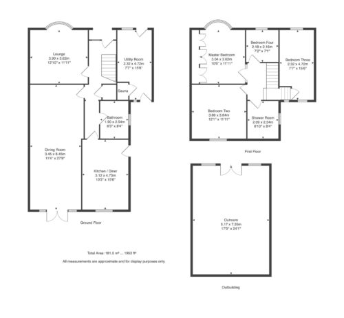 The ground floor features a welcoming lounge, a separate dining/family room, and a well-appointed kitchen diner—perfect for modern family life and entertaining and a downstairs bathroom. Additional benefits include a utility/sauna room providing convenience and wellness, as well as a versatile outbuilding that can be used as a home office, gym, or studio.
