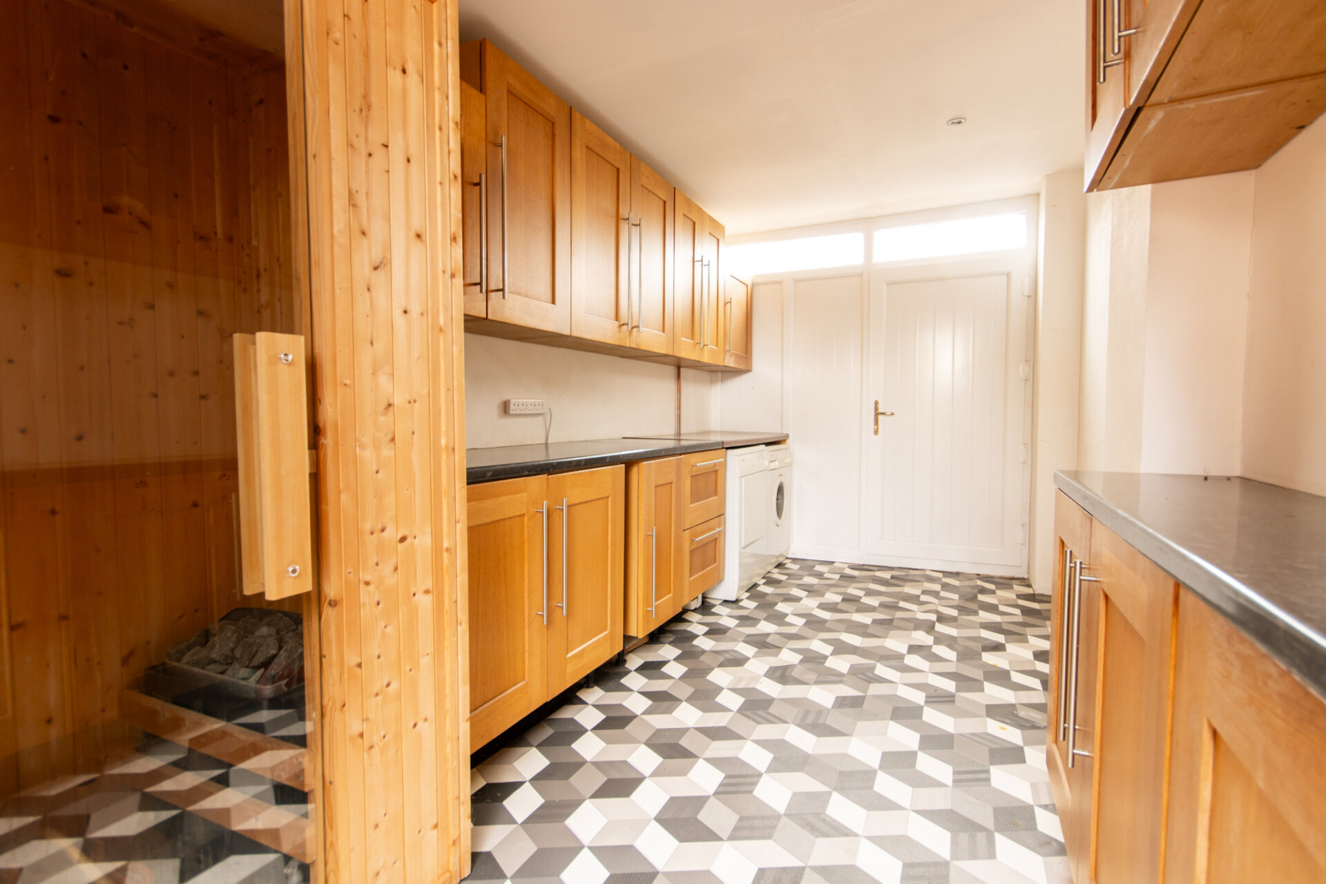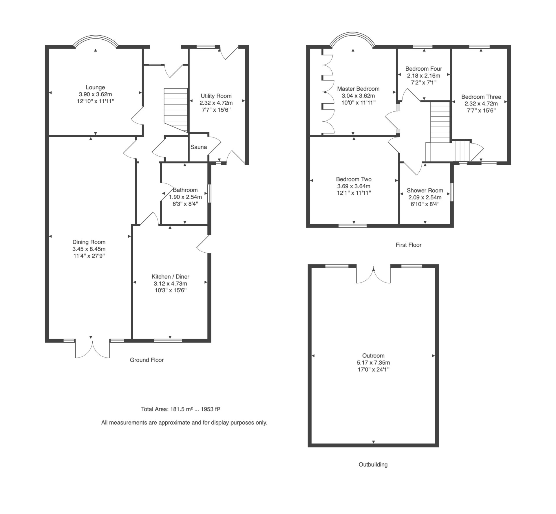The ground floor features a welcoming lounge, a separate dining/family room, and a well-appointed kitchen diner—perfect for modern family life and entertaining and a downstairs bathroom. Additional benefits include a utility/sauna room providing convenience and wellness, as well as a versatile outbuilding that can be used as a home office, gym, or studio.