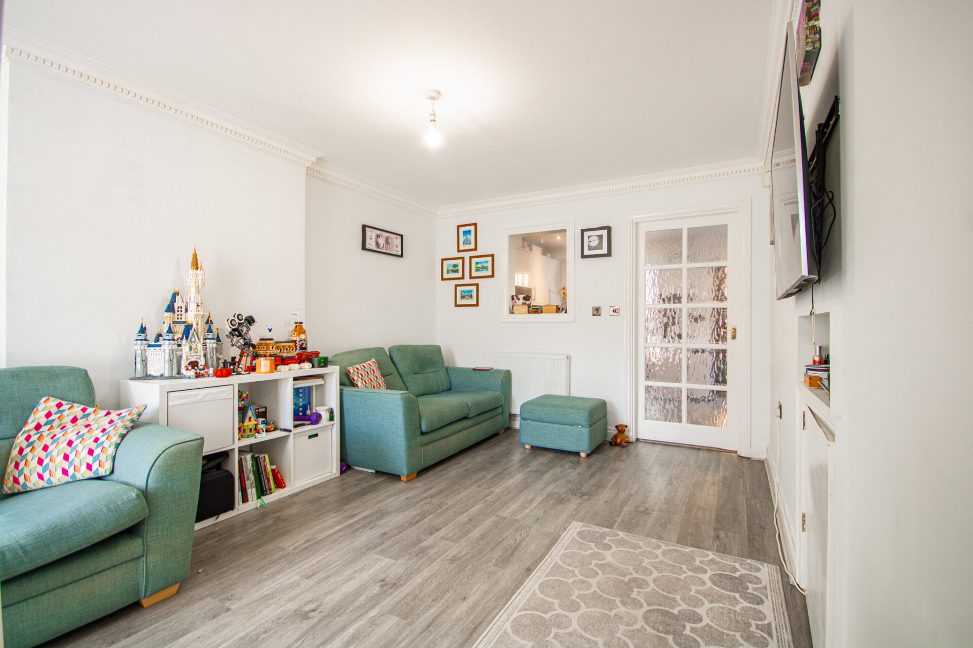 The ground floor offers an inviting entrance hall, a spacious lounge with understairs storage, a WC, and a modern kitchen-diner with French doors opening onto the rear garden.