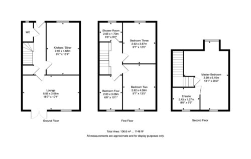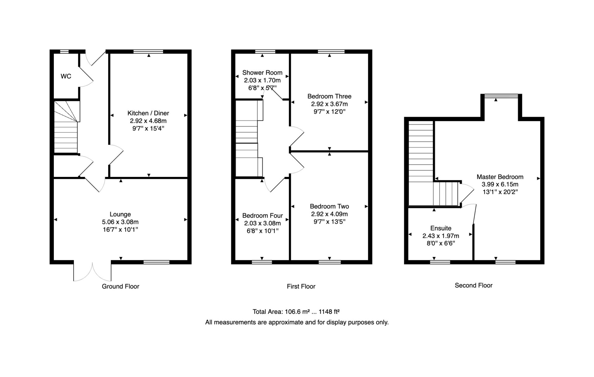 Spread across three floors, the home includes four generous bedrooms, with the master suite occupying the top floor complete with an en-suite shower room, offering a private retreat.