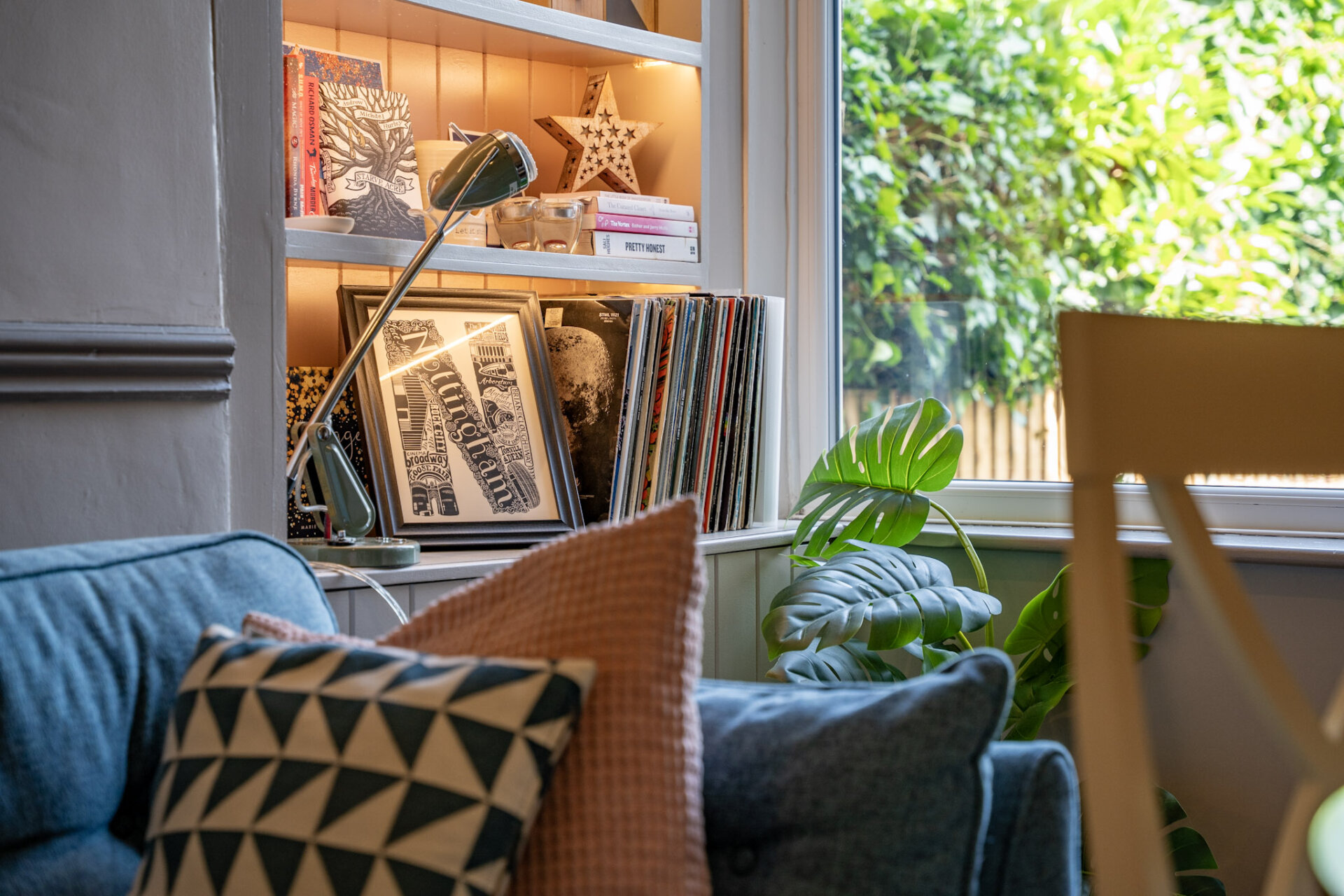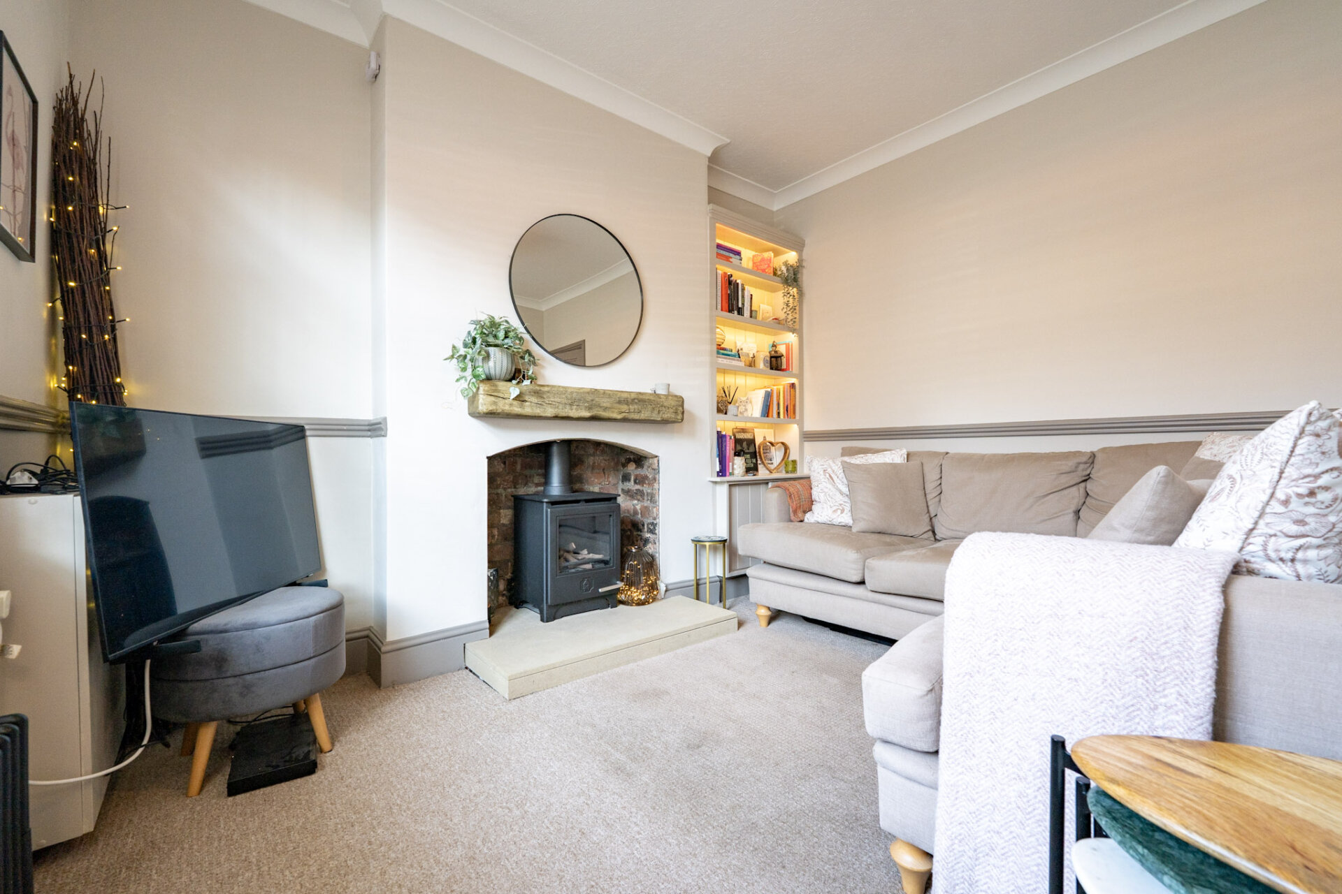 Double glazed composite door to enter into front reception room currently used as a lounge, double glazed window to the front elevation, carpet flooring, column style radiator, chimney breast, with gas effect log burner, recess alcoves to either side, carpet flooring.