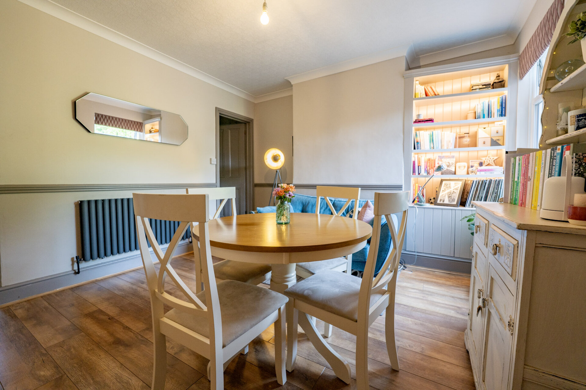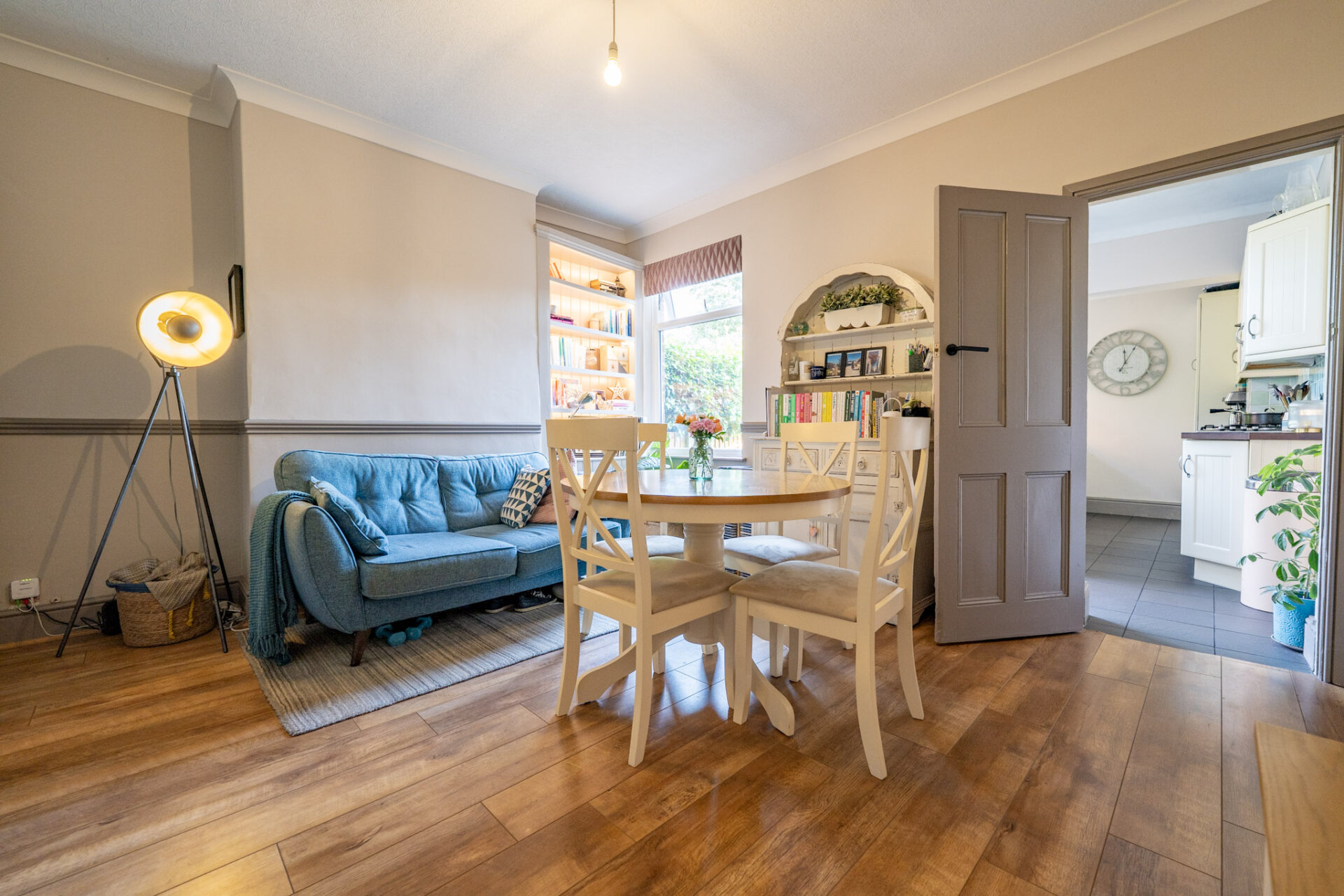 Great size reception room with wood effect flooring, understairs storage