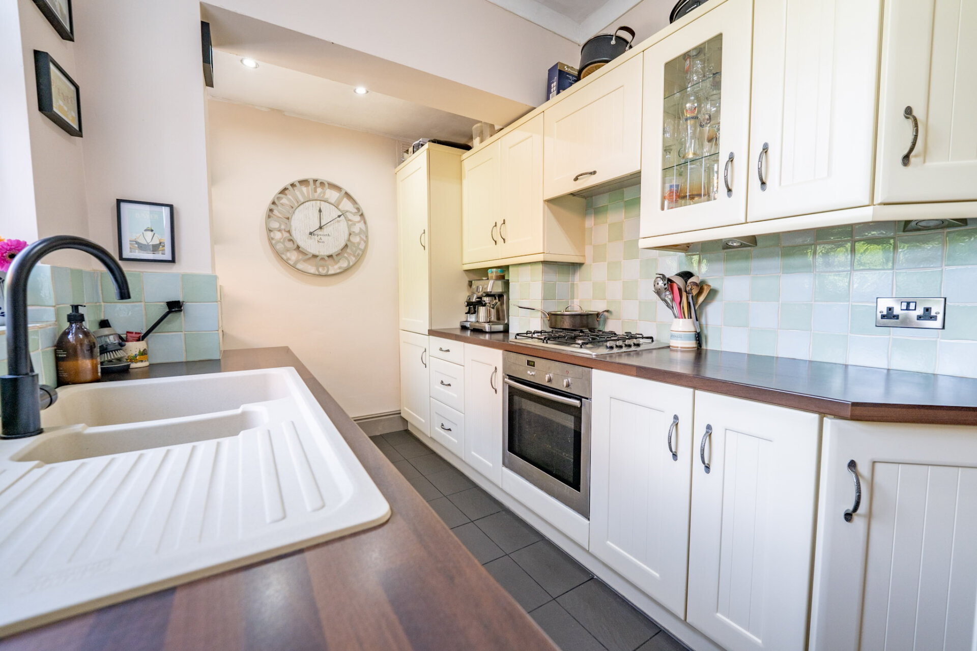 A refitted modern kitchen with a range of wall and base units, square top work surfaces, integrated dishwasher washer, fridge freezer, washing machine, one and a half sink and drainer with mixer , electric over gas hobs, x2 double glazed windows to left elevation, tiled flooring, Double glazed door to left elevation.