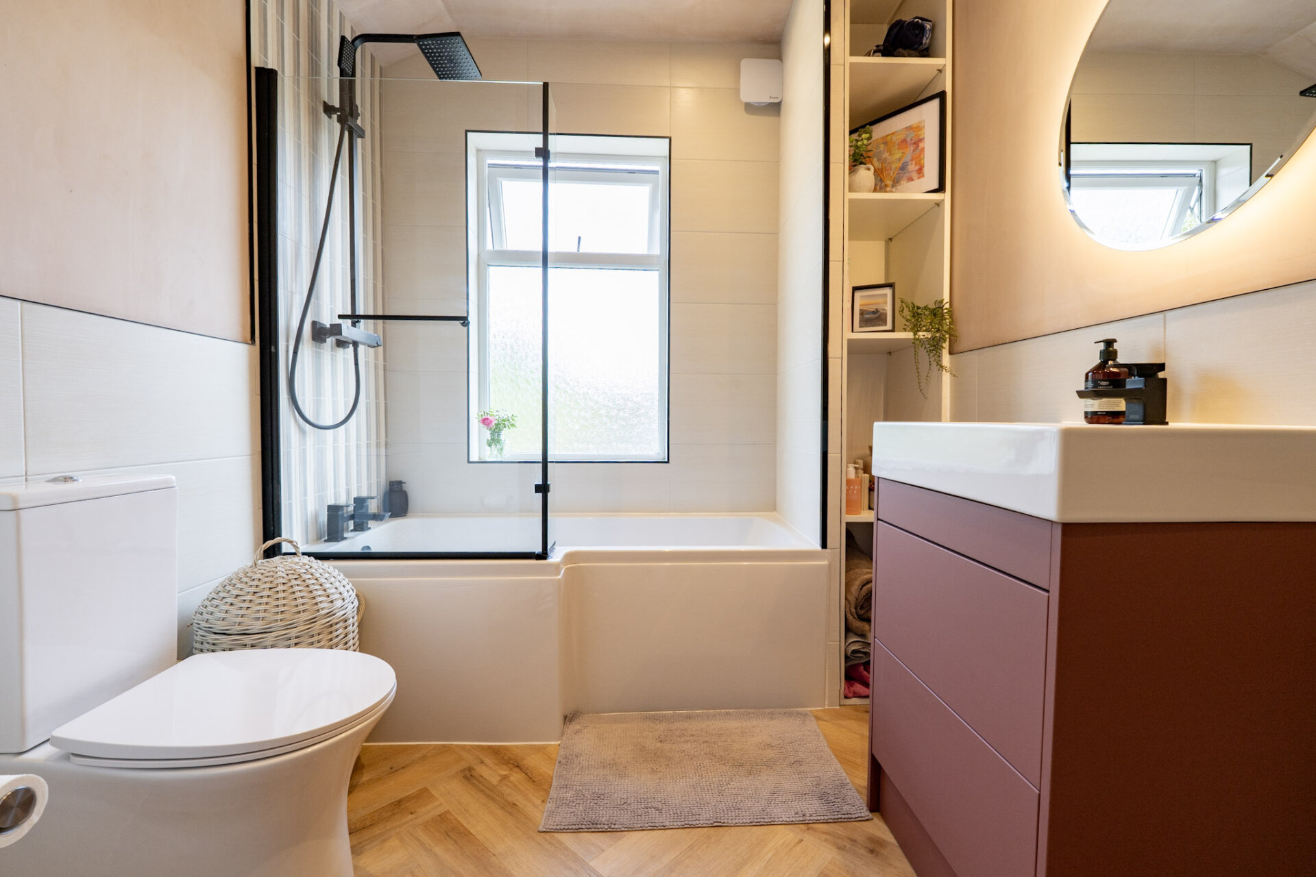 A stunning refitted three piece bathroom suite comprising, Shaped bath with waterfall and mixer tiled splashbacks backs, low flush wc, vanity unit with wash hand basin, cupboard housing combination boiler, double glazed window to rear.