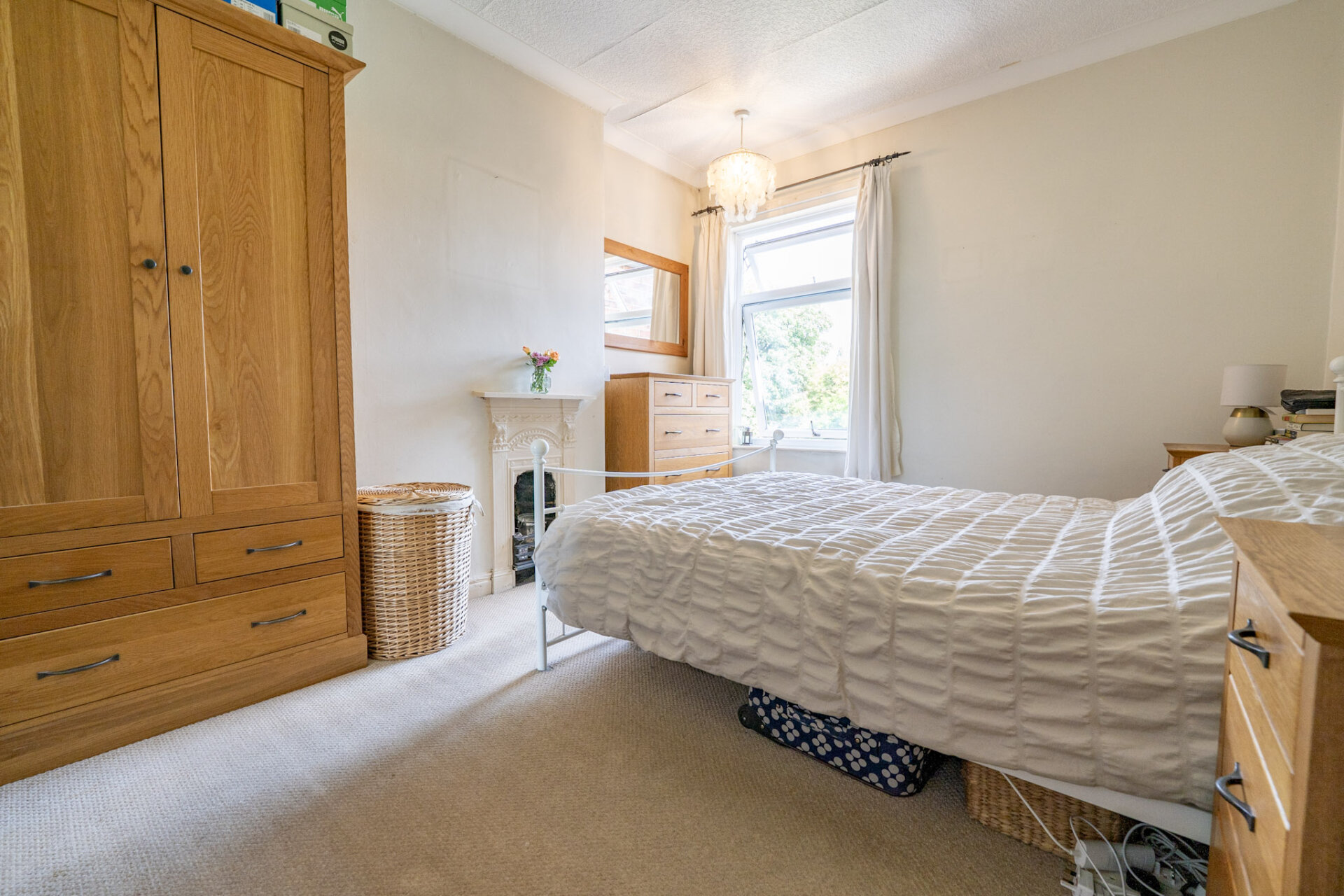 A great double bedroom with large double glazed window to front, column radiator, carpet flooring and over stairs cupboard and original feature fire