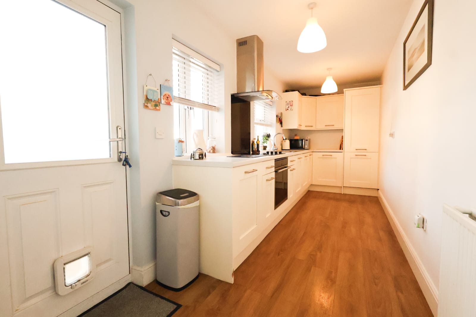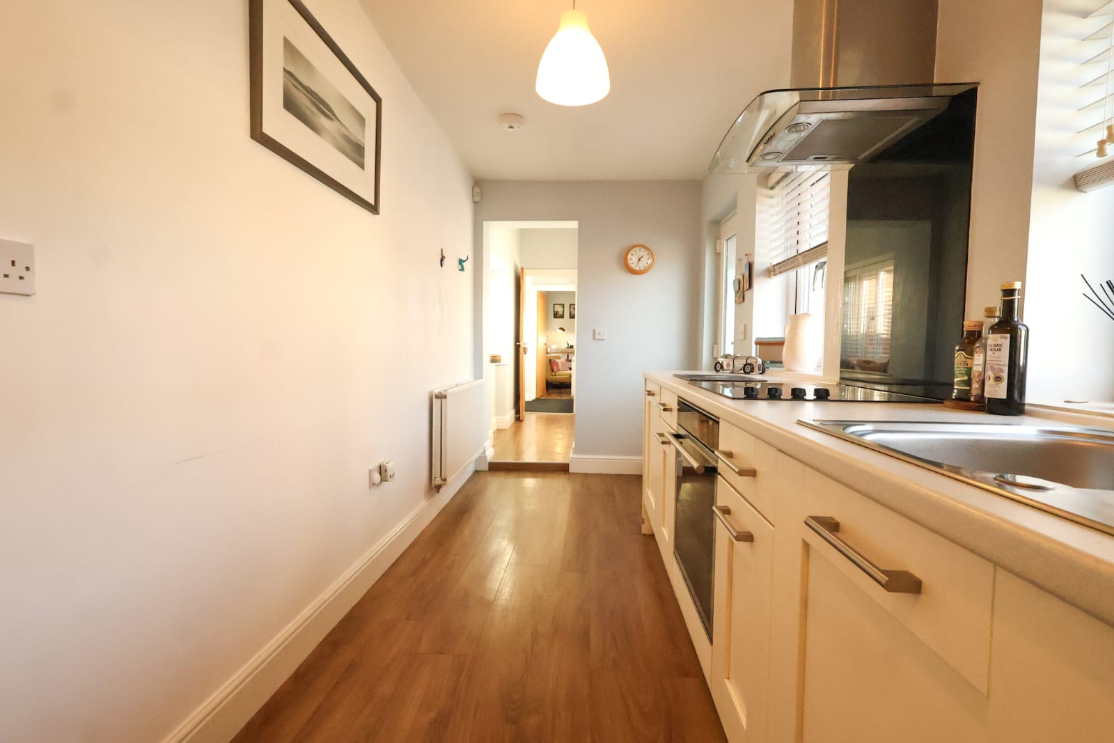 As you enter the property you will find a really good sized hallway, the property benefits from wooden flooring and solid wooden doors throughout with high ceilings really making the space feel open and light. Leaving the hallway to the right you follow the corridor to a well equipped kitchen with space for a table or breakfast bar. The kitchen is fitted with a mix of high and low level cabinetry, a sink, ceramic hob and electric oven. You also have a built in dishwasher and washing machine and fridge freezer. With wooden flooring, two windows and door to the rear garden.