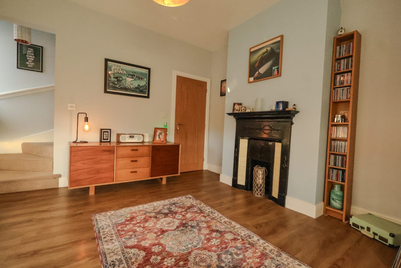 Back through the hallway you enter into the dining room, with fireplace, dual aspect windows, wooden flooring, stairs to the first floor. This room can be really flexible and could be used as an office or additional seating space. You will also find an understairs storage cupboard with light.