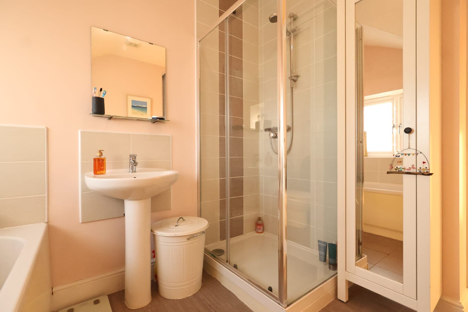 The bathroom is equipped with a bath, seperate shower, low level wc and sink. A double window allows for plenty of light, with tiled flooring and a radiator.