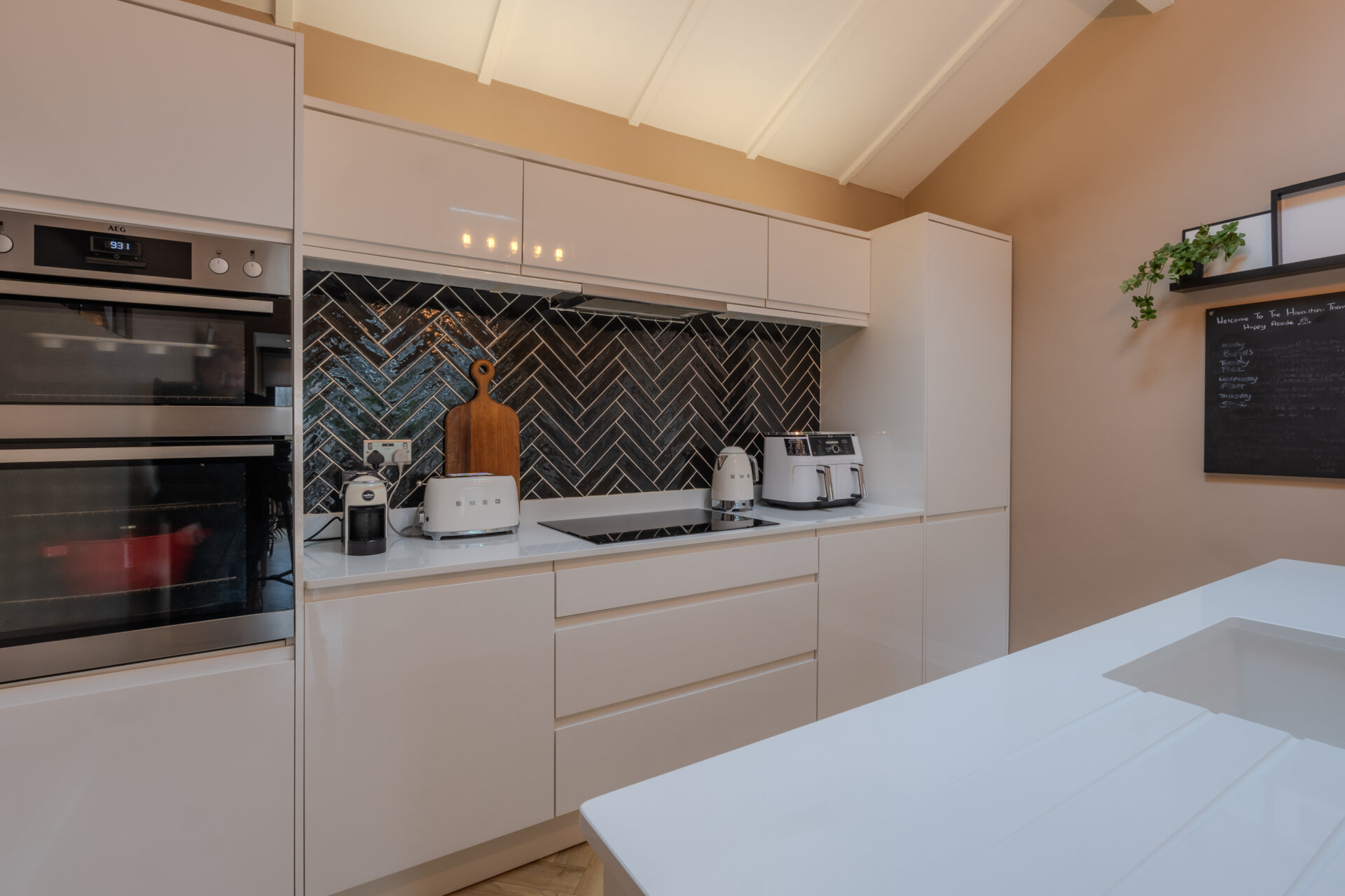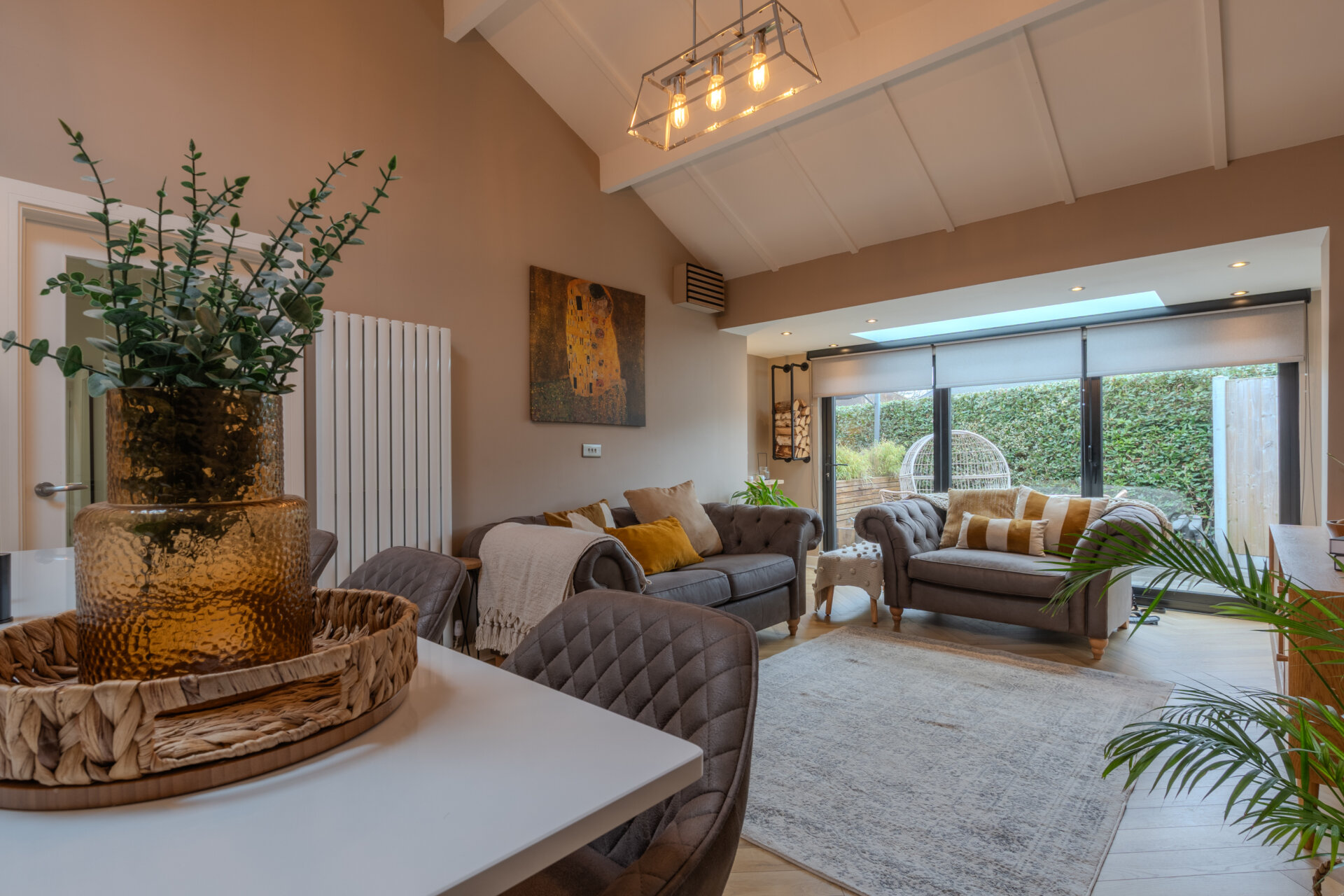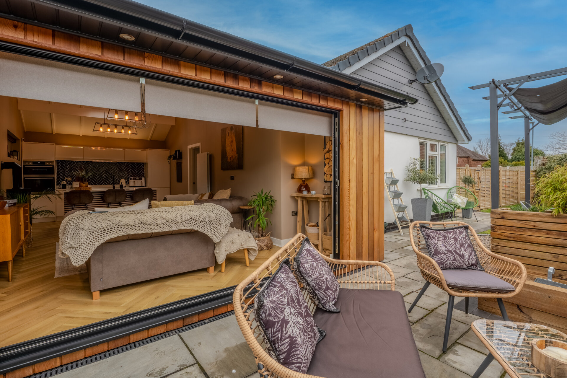 The property is accessed via the side. On entering, straight ahead you are presented with the utility area, which also leads to the covered storage - perfect for outdoor equipment. To the side is a door giving access to the focal point of the property, the open plan kitchen and living area. Having laminate flooring throughout, recently re configured to the side with bi fold doors, radiator, and sky light to ceiling. Having matching base and wall units with work surface over, central island with inset sink and mixer tap over with drainer, integrated dishwasher, fridge freezer, hob with extractor over and oven, tiled splashback, light fittings to ceiling and door giving access to the hall.