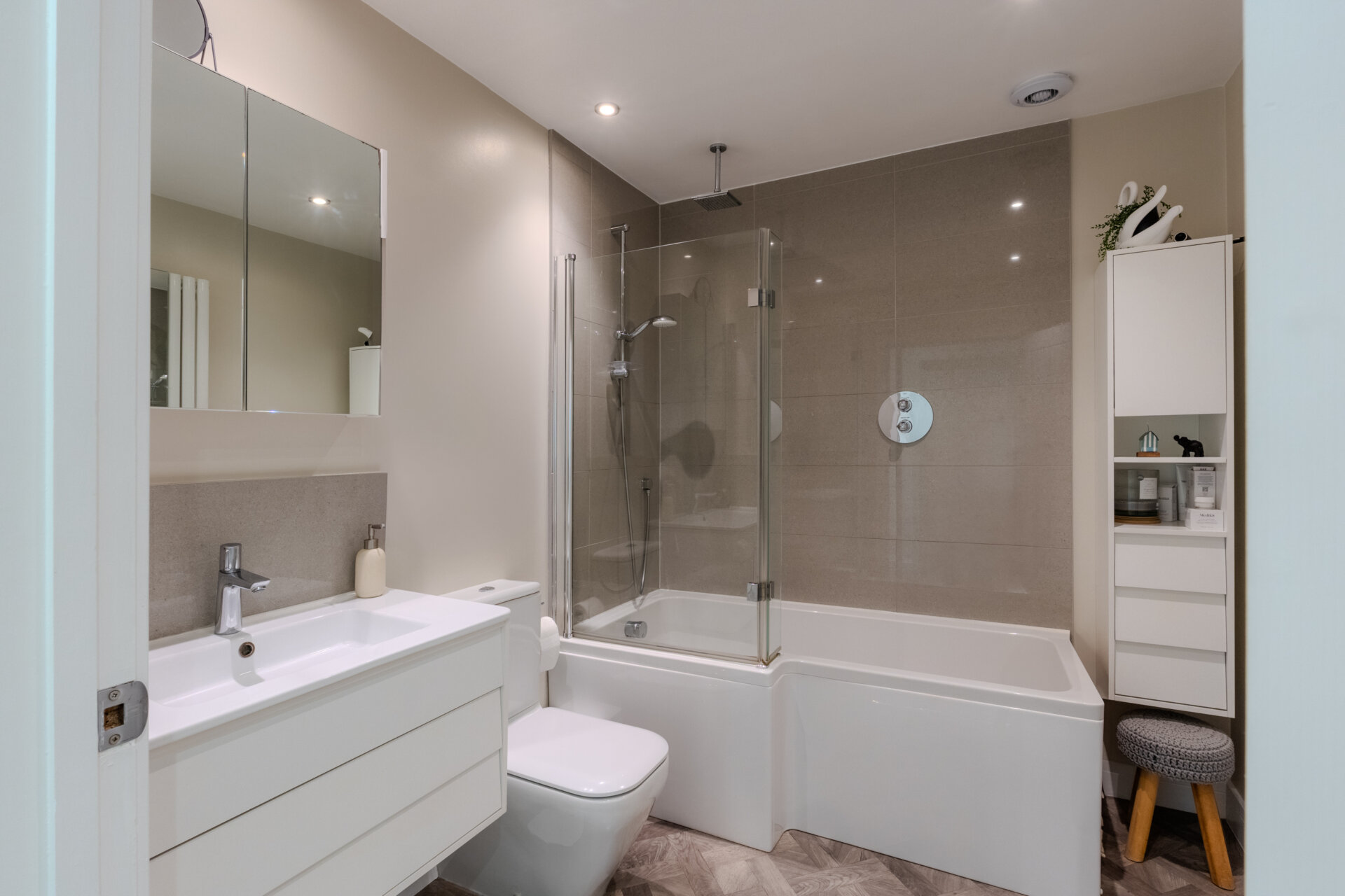 Having matching handwash basin with vanity unit and splashback, low level wc, bath with shower over and screen, having part tiled walls, radiator, spotlights to ceiling and extractor.