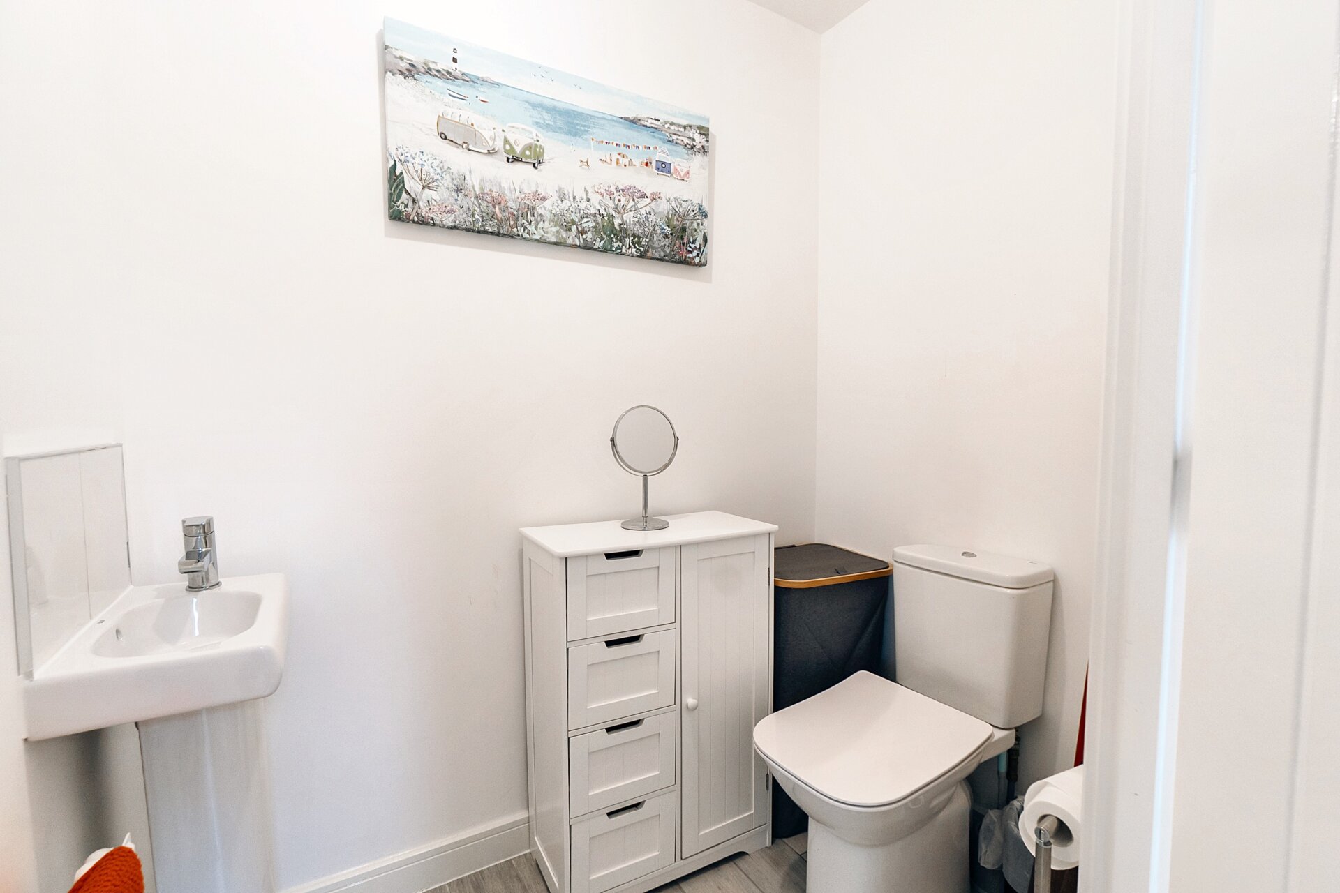 A convenient space for guests, fitted with a low-level WC and a pedestal wash hand basin with chrome mixer tap and tiled splashback. Additional features include a radiator, with the wood-effect tiled flooring continuing through from the utility room.