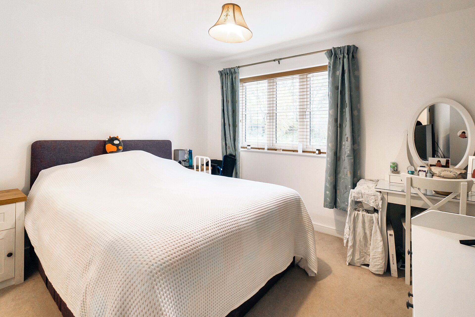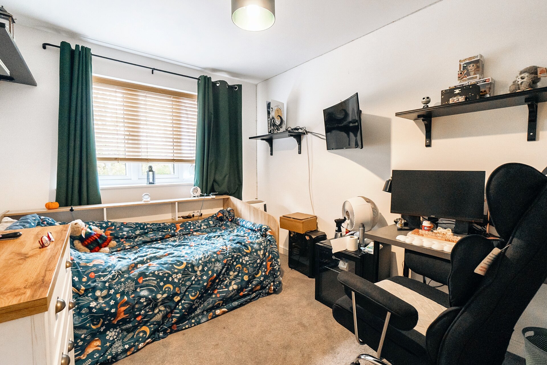 A versatile L-shaped bedroom at the rear of the property, enjoying views over the garden. The layout provides extra space for wardrobes or a desk, and the room is finished with a radiator and fitted carpet.