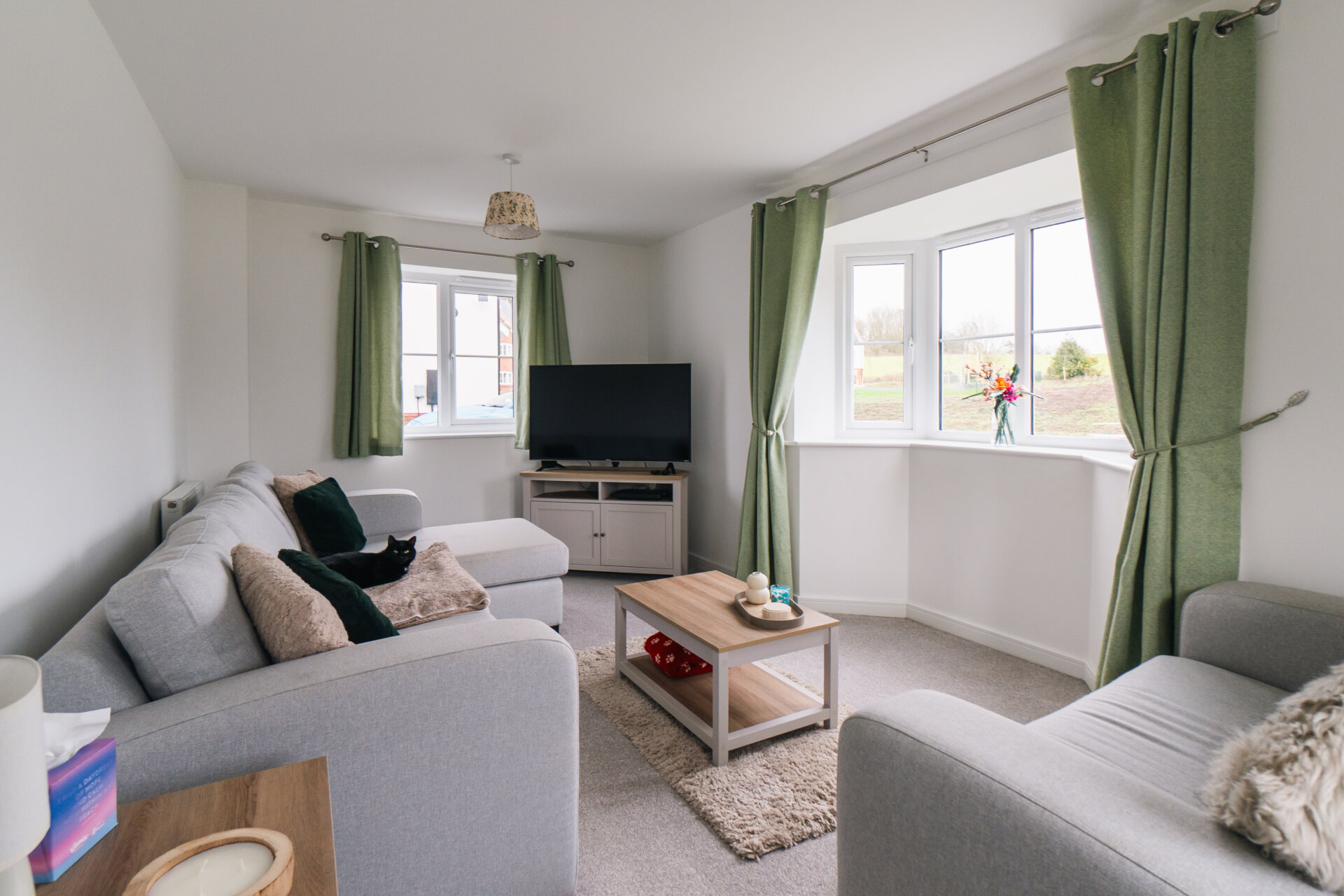 The lounge features a bay window to the side elevation overlooking the pond and park, with dual-aspect windows to the front and rear providing abundant natural light. Fitted with neutral carpet and two radiators, the room offers a bright and versatile living space.