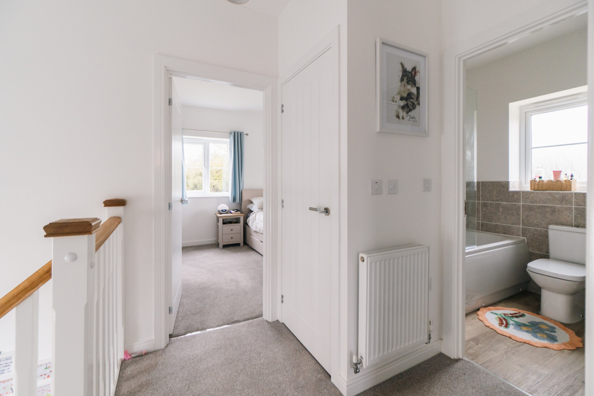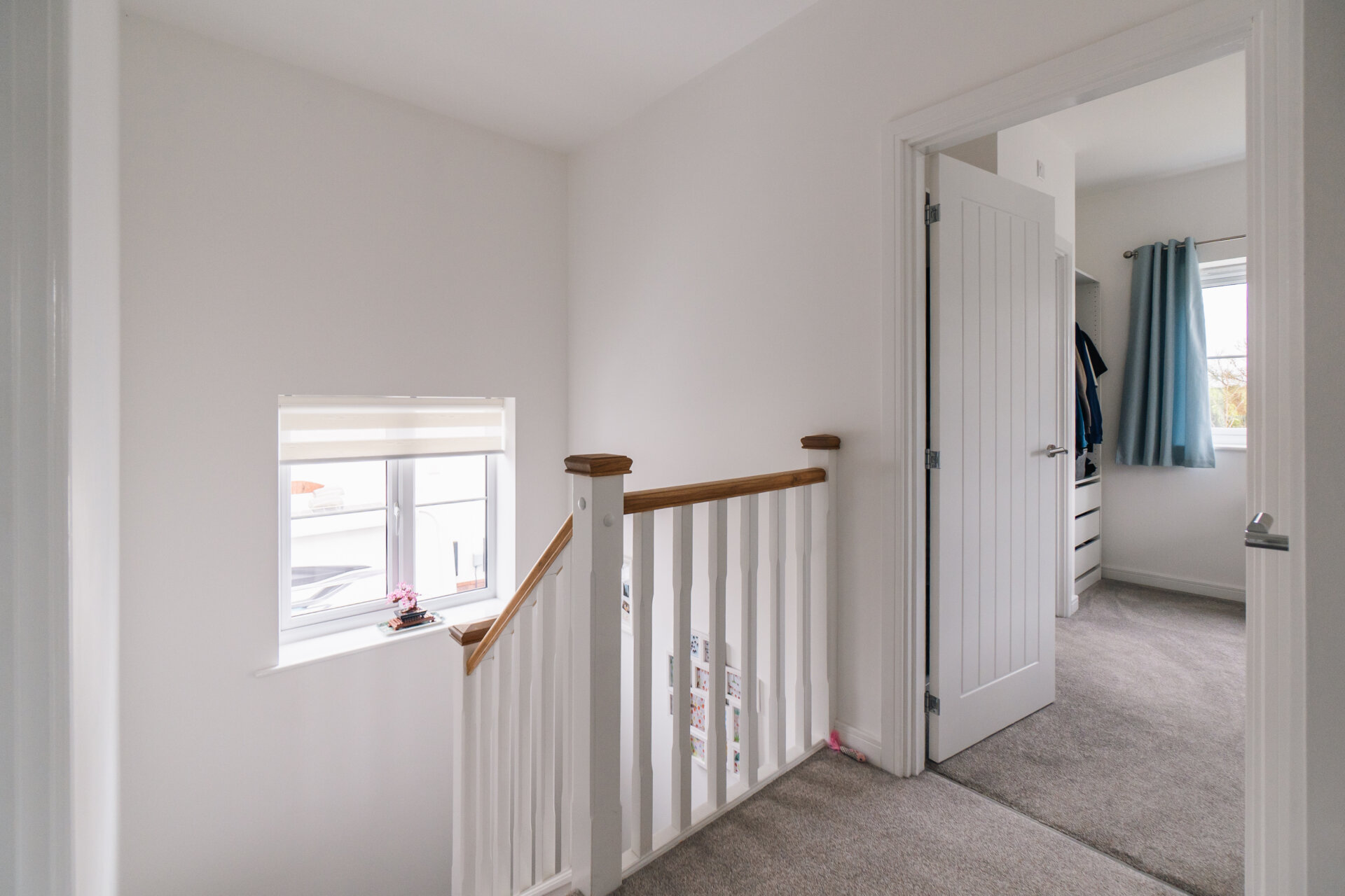 The light and spacious galleried landing features a window to the rear elevation providing natural light, a spindle handrail, neutral carpet, and radiator. With loft access and a storage cupboard, the landing provides a practical and elegant connection to the three bedrooms and family bathroom.