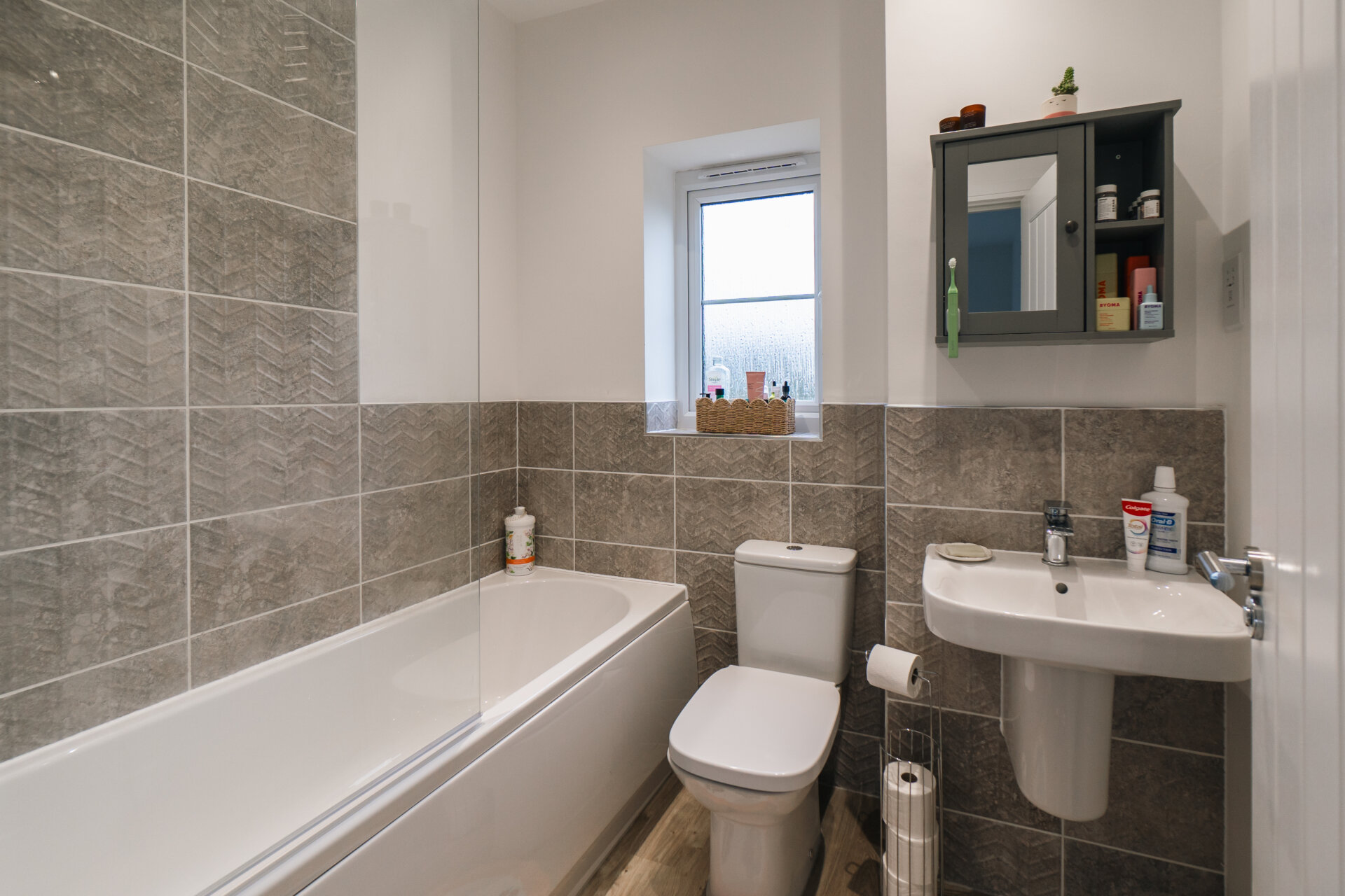 The ground-floor WC is fitted with a modern white suite, comprising a low-level WC and floating wash hand basin with chrome mixer tap and tiled splashback. Finished with a radiator and luxury vinyl tiled flooring, the space is both stylish and practical.