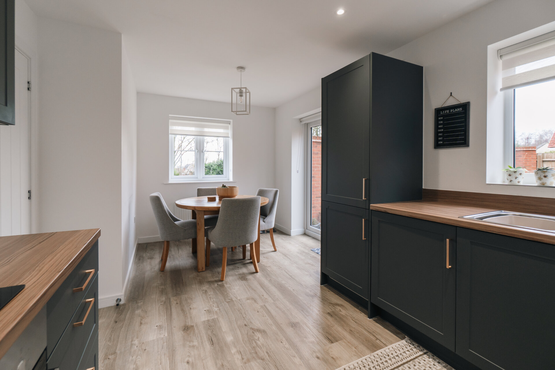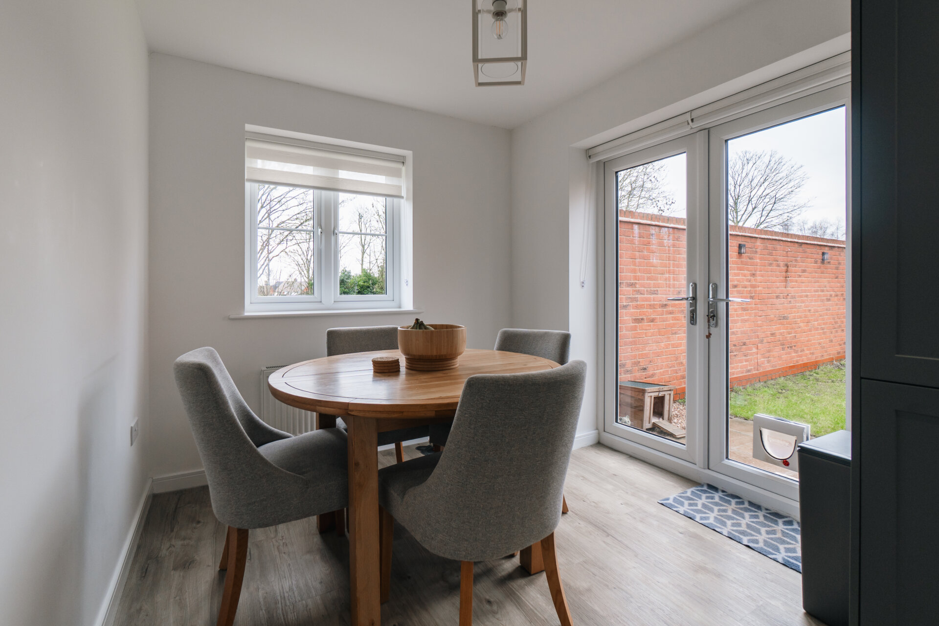 The kitchen flows seamlessly into the bright dining area, positioned near French doors overlooking the garden. Three windows—one over the sink to the side and dual-aspect windows to the front and rear—allow natural light to flood the space. The room is finished with spotlighting and luxury vinyl tiled flooring, creating a contemporary and welcoming heart to the home.