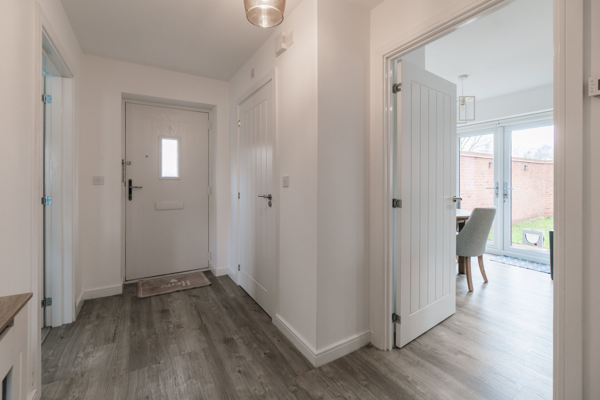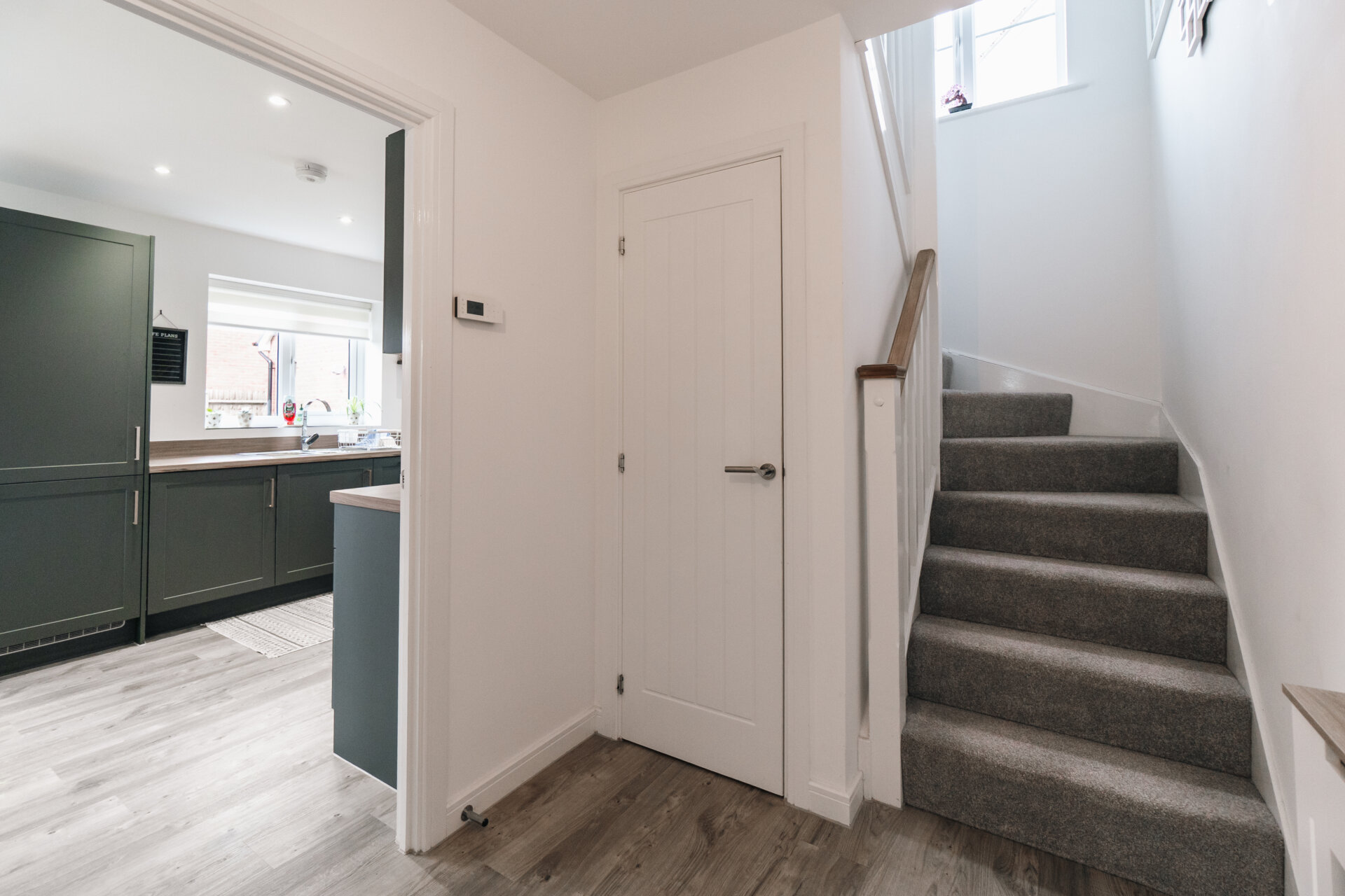 Upon entering, the entrance hall features whitewashed walls and light wood-effect luxury vinyl flooring. The composite front door with decorative distorted glass provides light while maintaining privacy, and a radiator with modern cover completes the space. The hall gives access to the lounge, kitchen/diner, WC, and understairs storage with fuse board, while stairs lead to the first-floor accommodation.