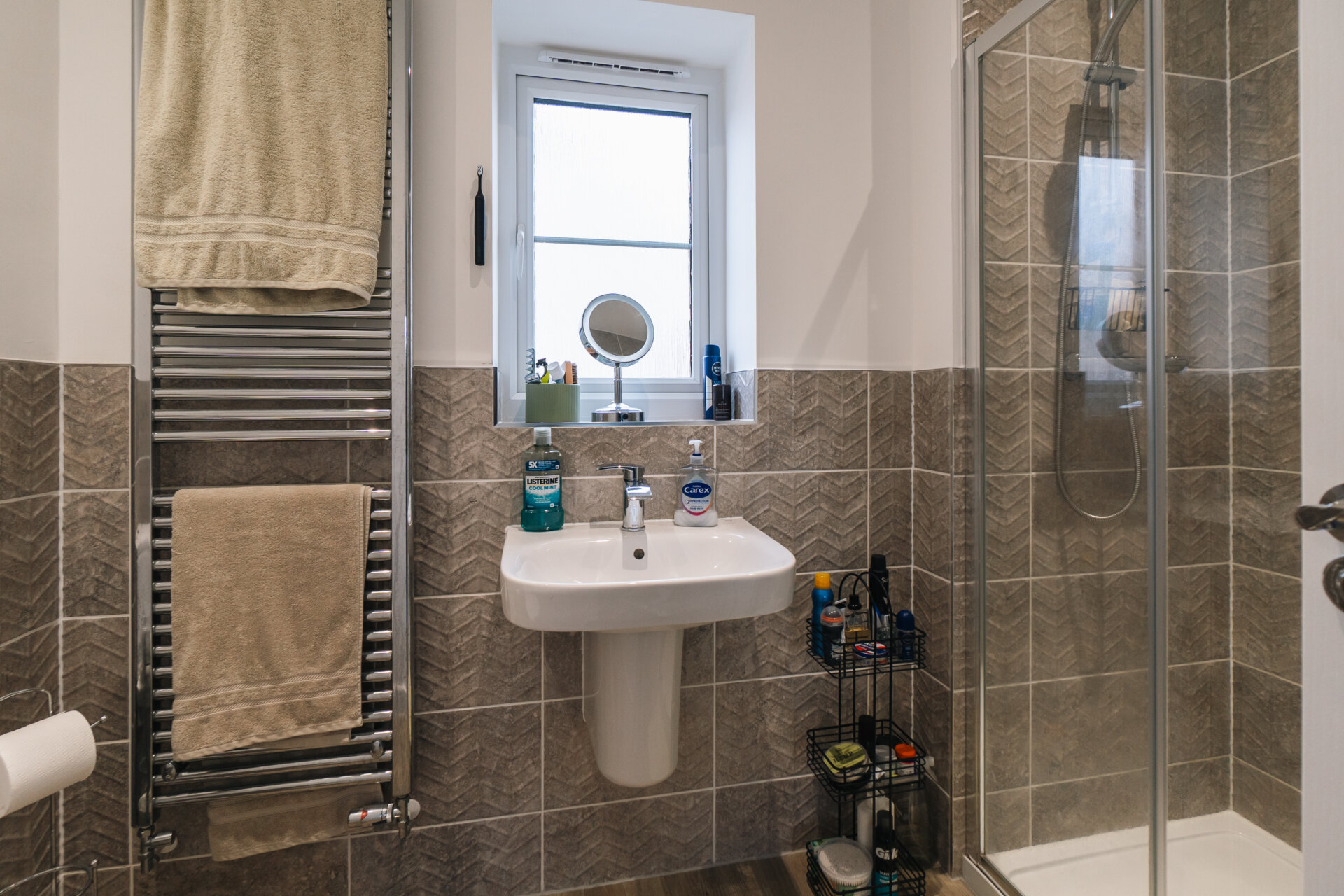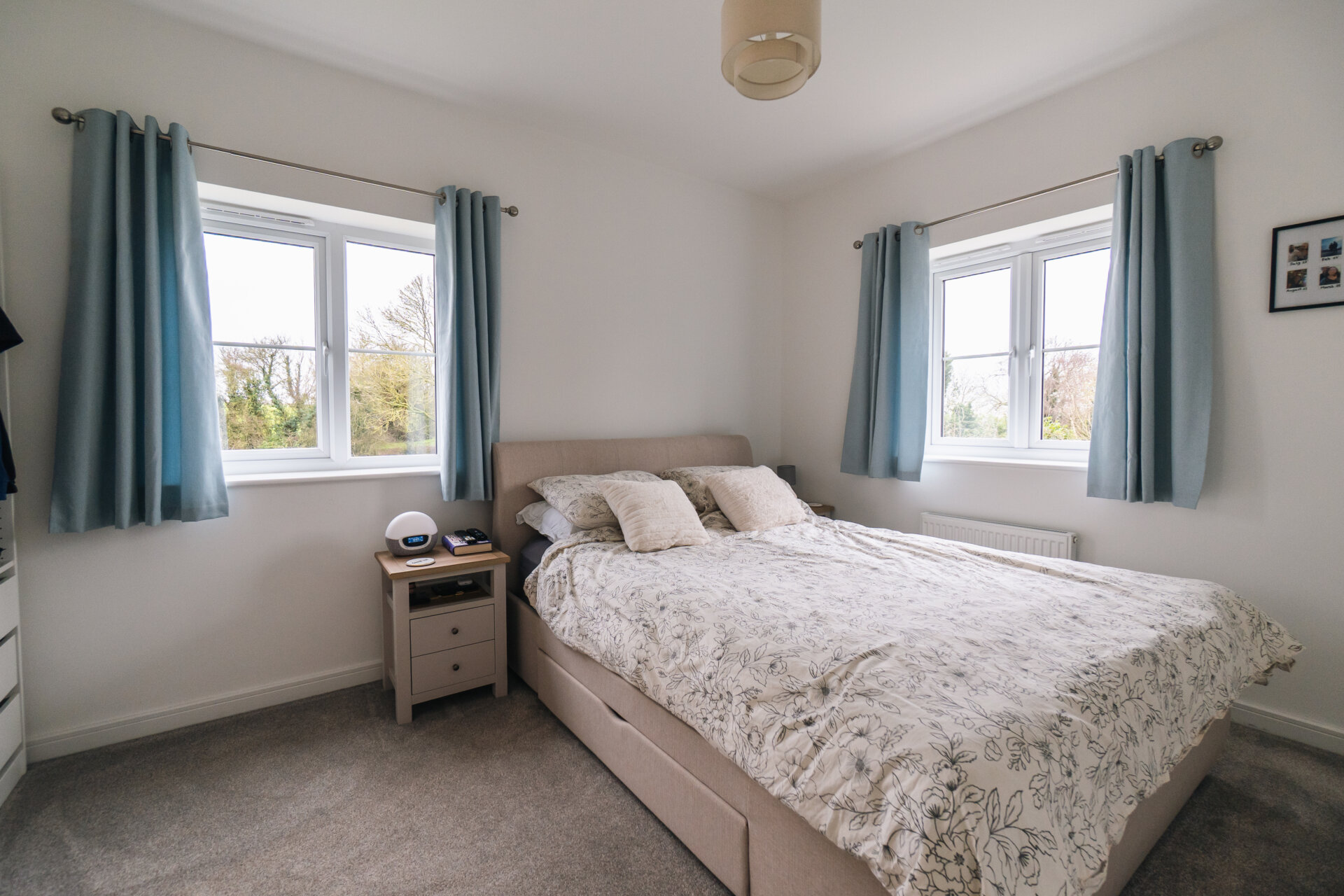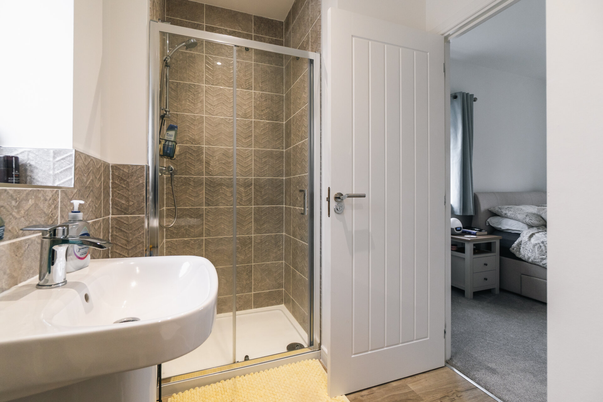 The master bedroom is a generous, modern room with windows to the front and side elevations, flooding the space with natural light. Fitted with neutral carpet and a radiator, the room also features inset walls either side of the en-suite entrance, ideal for fitted wardrobes or additional storage. The bedroom leads to a contemporary en-suite shower room