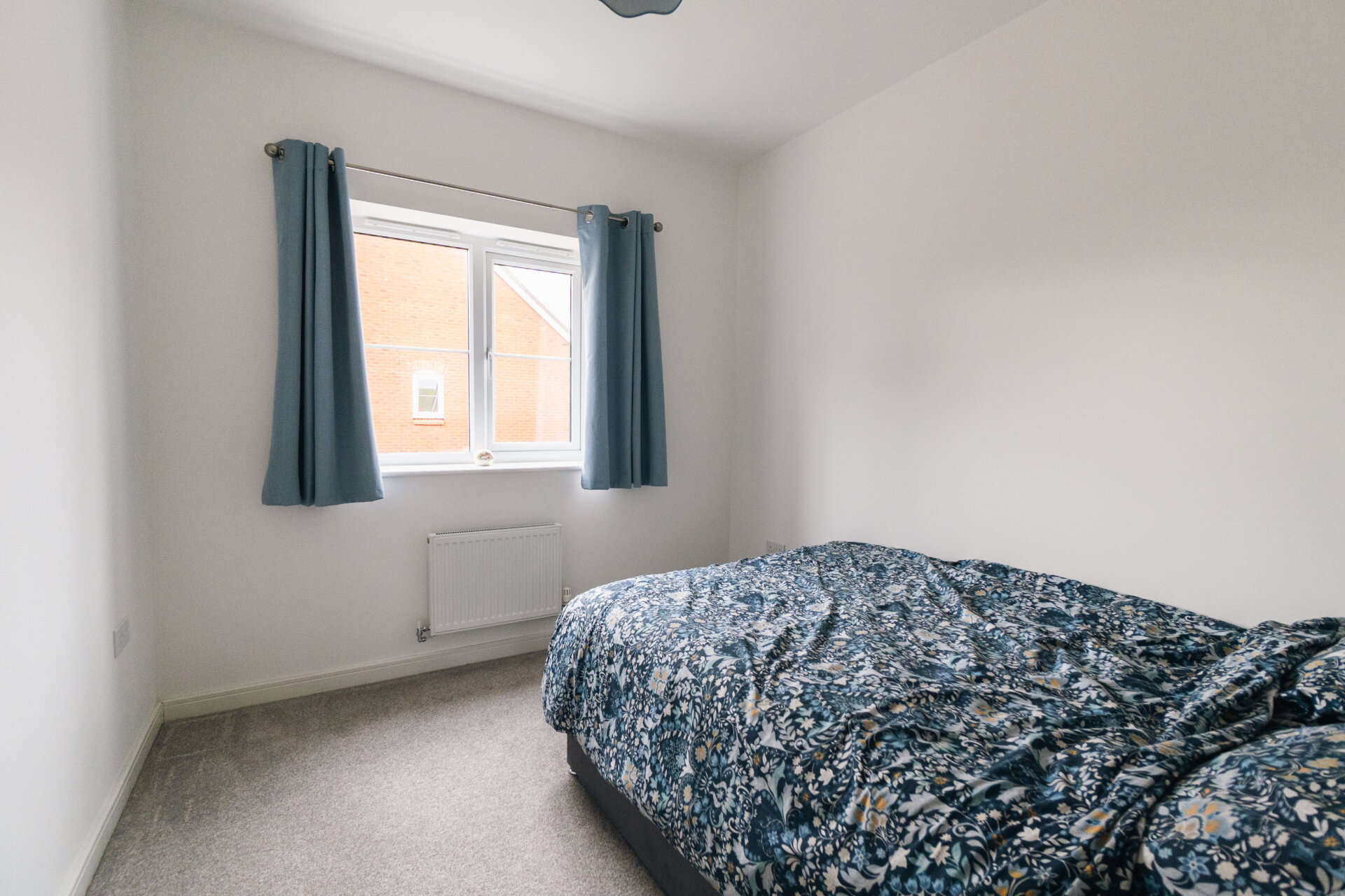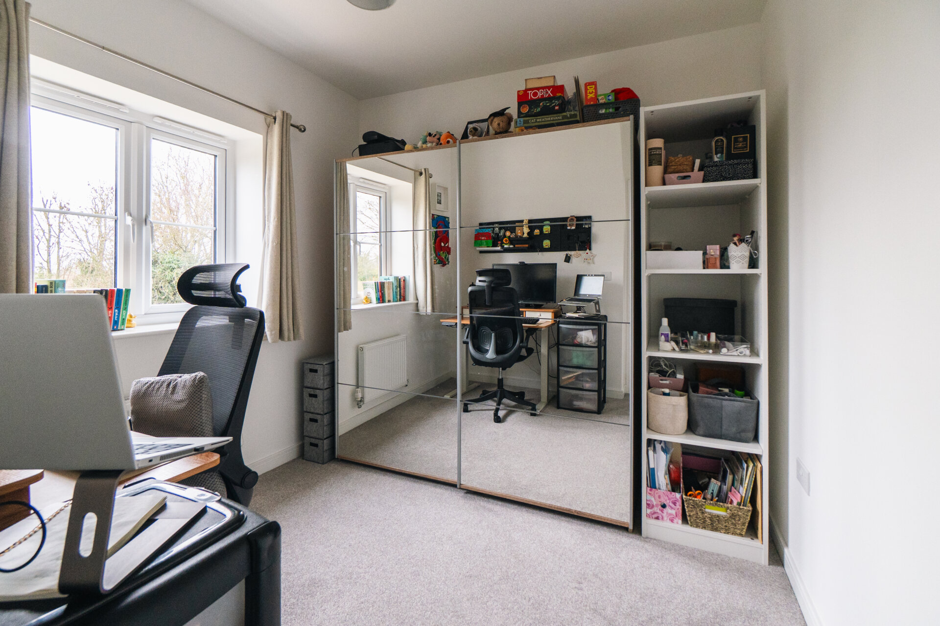 Bedroom three is currently utilised as a home office, yet offers sufficient space for a small double bed. The room features neutral carpet, a radiator, and a window to the front elevation, providing natural light.