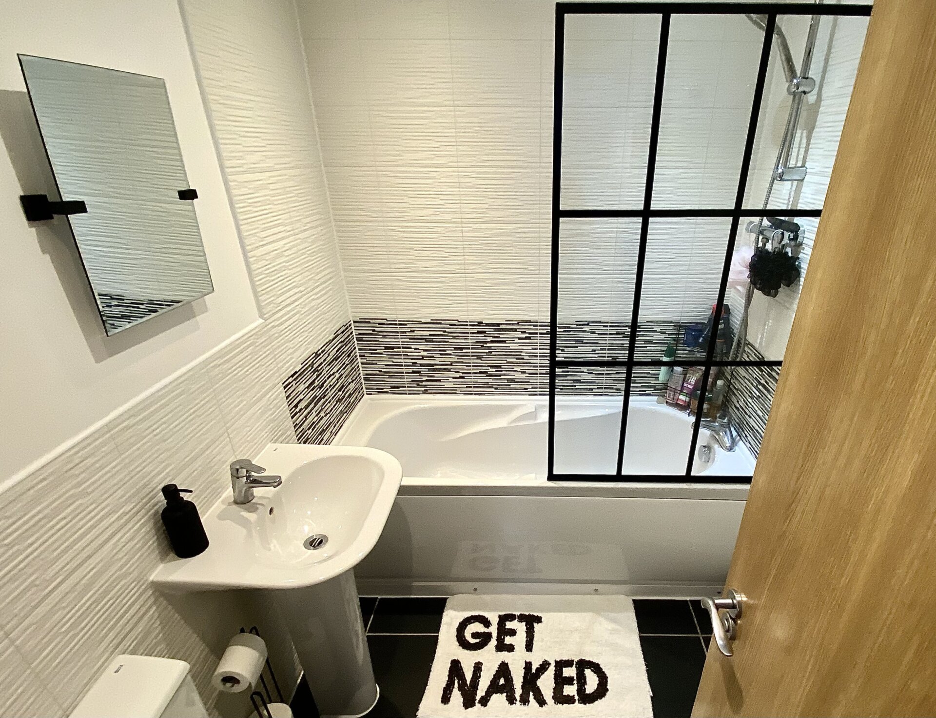Bathroom - This sleek and contemporary bathroom offers a perfect blend of style and functionality. The room features elegant textured wall tiles, complemented by a chic mosaic tile border that adds a touch of sophistication to the space. The modern design is further enhanced by the striking black-framed glass shower screen, giving the room a distinctive and luxurious feel.