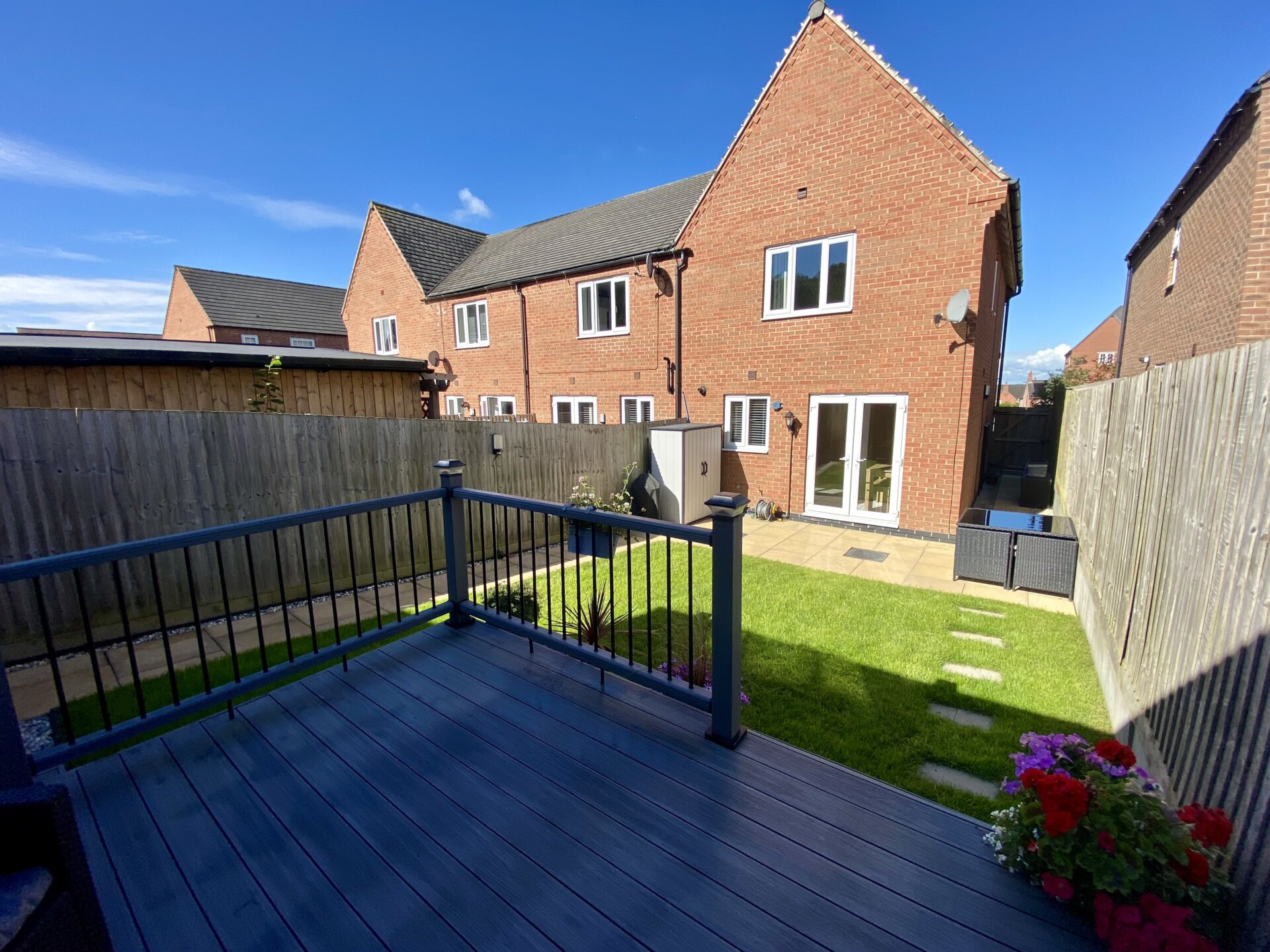Exterior - Step into this beautifully landscaped garden, designed for both relaxation and entertainment. The garden features a spacious, elevated deck area perfect for outdoor dining or lounging, surrounded by modern railings for added safety and style. The lush, green lawn is meticulously cared for and provides a soft, inviting space for family activities or simply basking in the sunshine. There is also two dedicated parking spaces to the rear of the property.