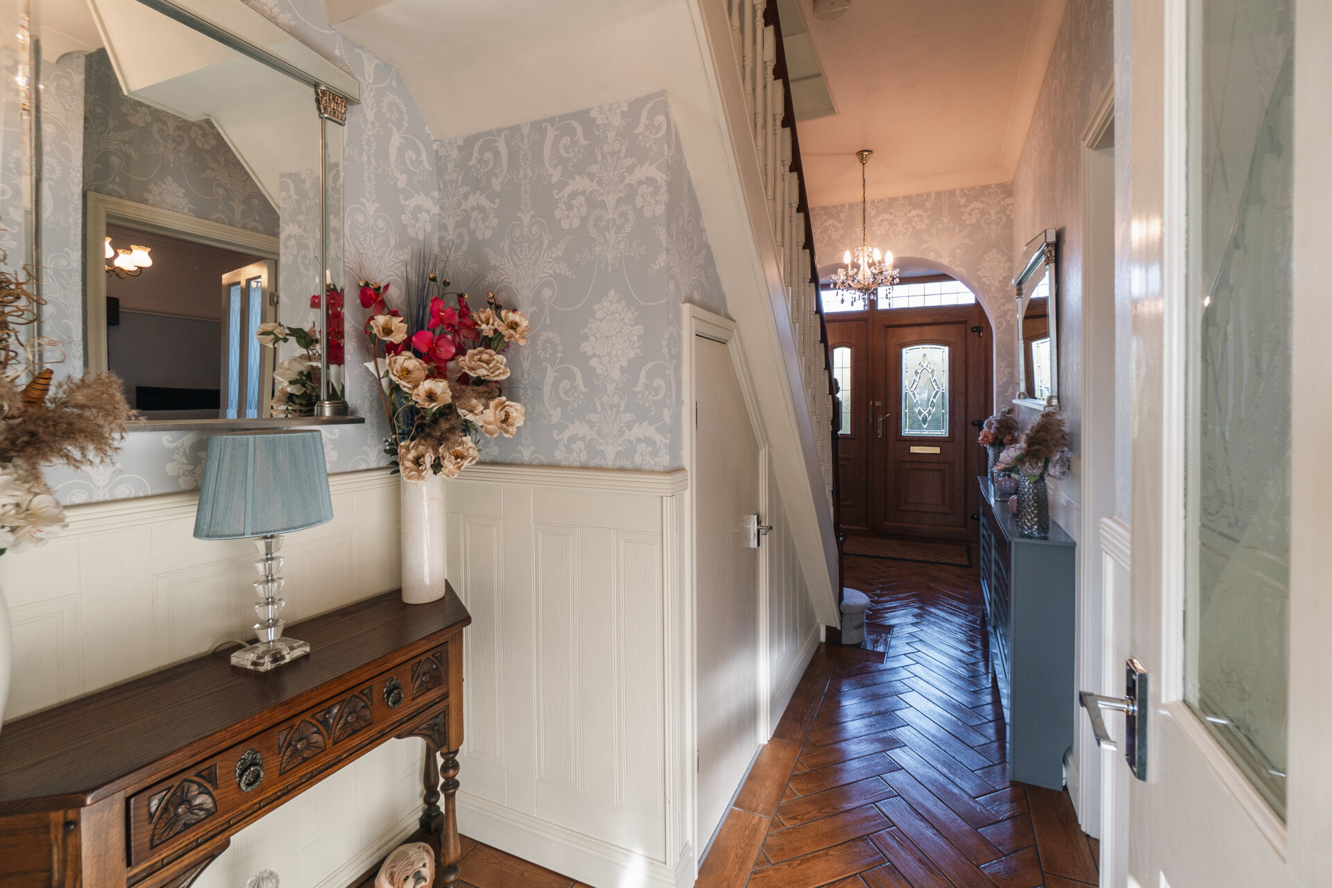 Having tiled flooring, radiator under that stair storage, doors giving access to lounge, kitchen and dining room, carpeted stairs to the first floor, light fittings to the walls and ceiling.
