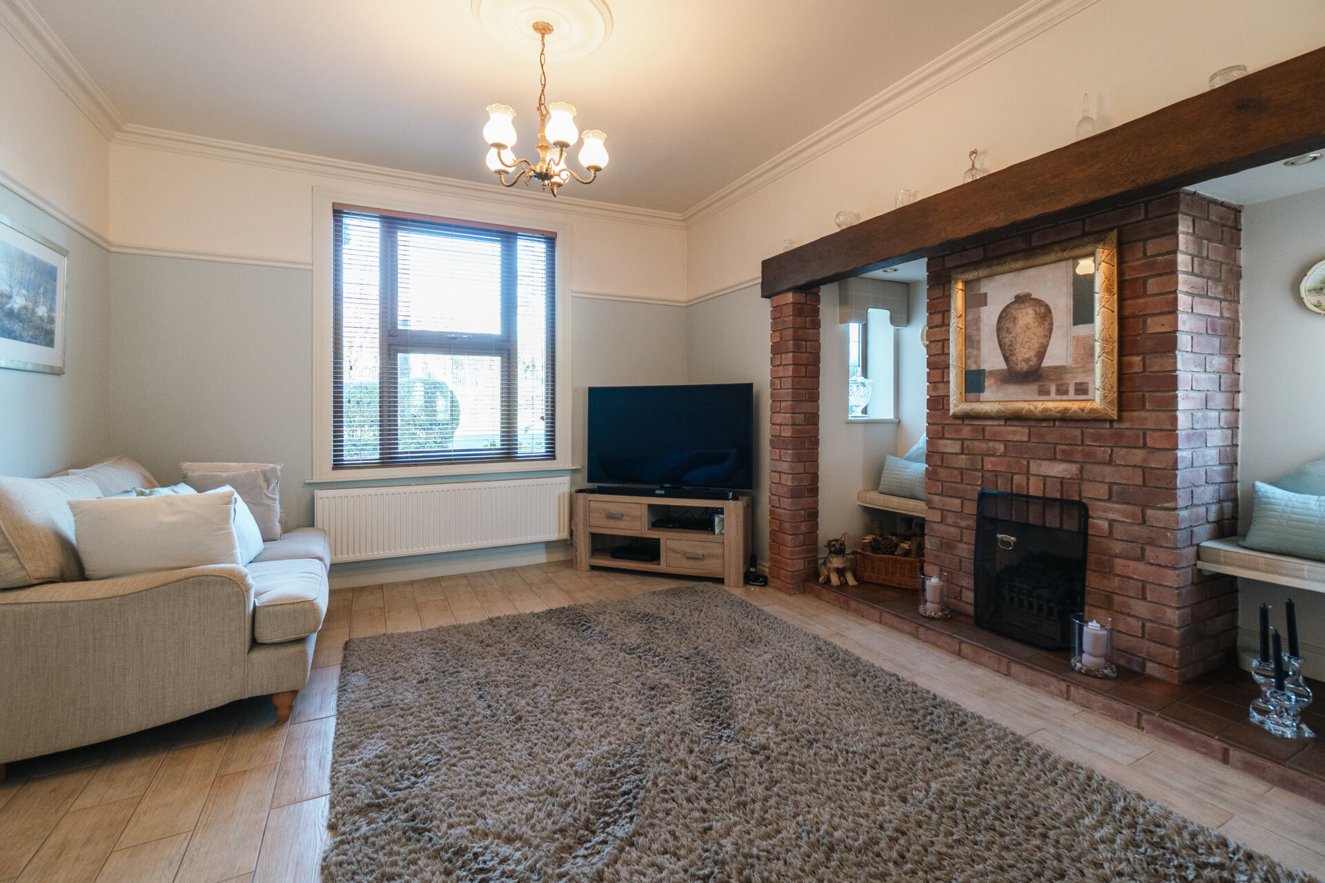 Spacious lounge, with a feature brick fire place with surround, two radiators, window over looking the front aspect, doors to the rear giving access to the sun room, and light fittings to the ceiling.