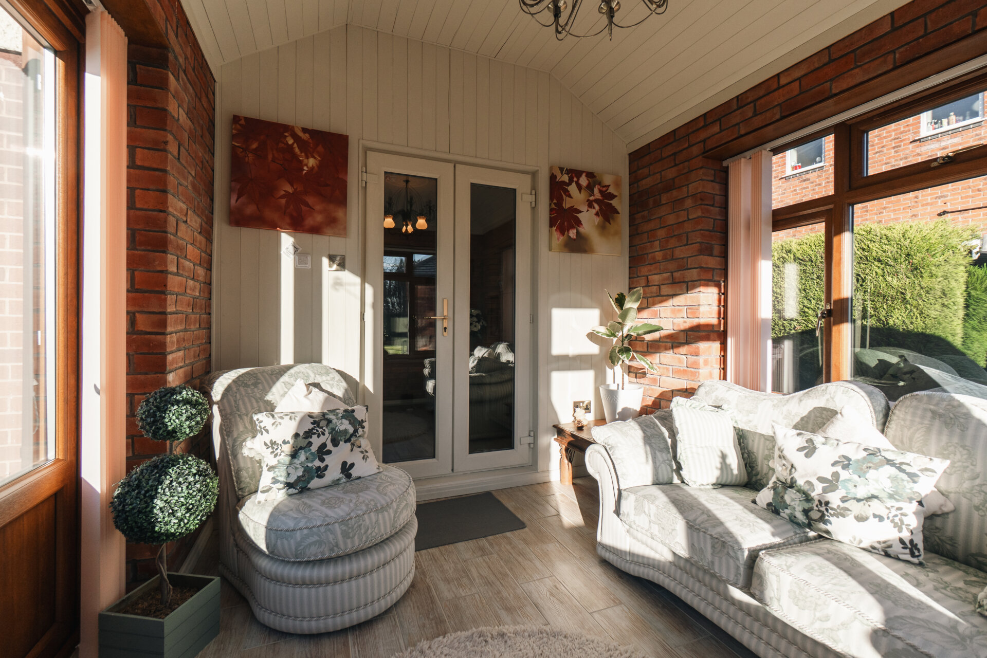 Having windows to the rear and side giving views of the garden, patio doors to the side giving access and light fitting to the ceiling.