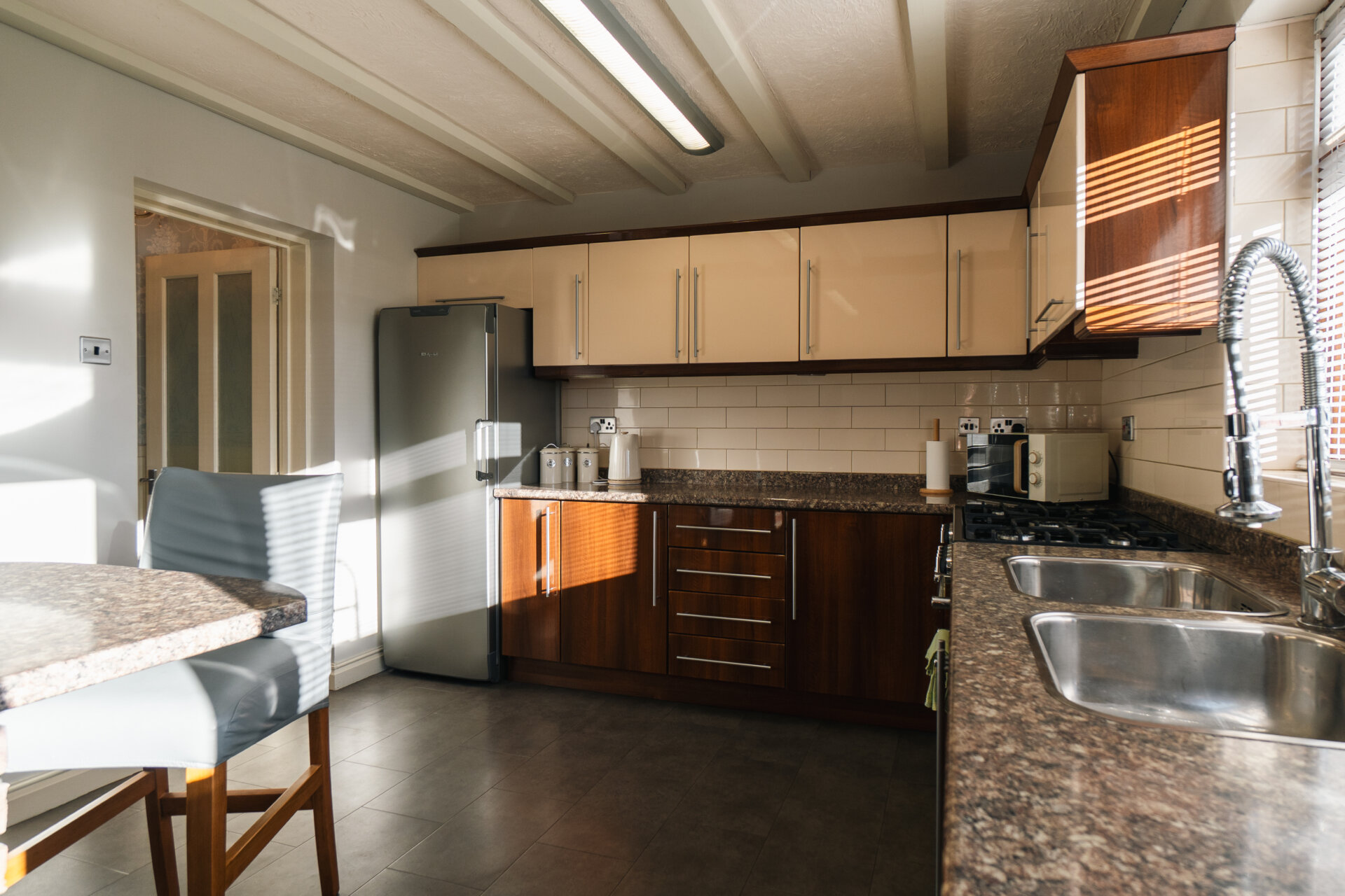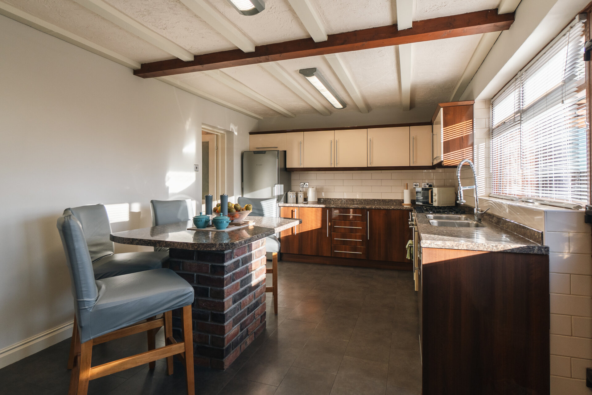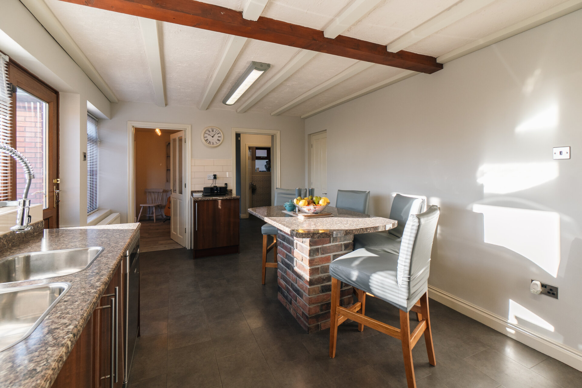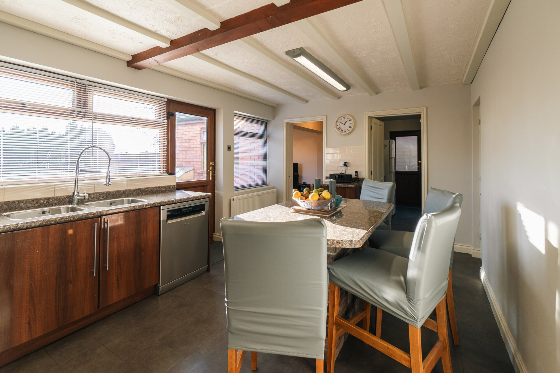 Having tiled flooring, a range of wall and base units with work surface over, radiator, double stainless steel sink with mixer tap over ,tiled splashback, space for white goods, windows overlooking the rear aspect, convenient island/breakfast bar, light fittings to the ceiling, door to the rear giving access to the garden and doors giving access to family room, utility and back to the hall.