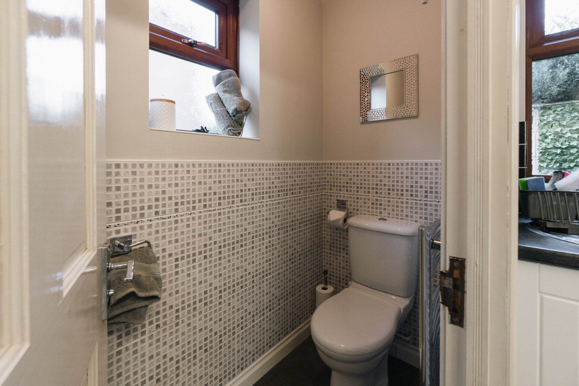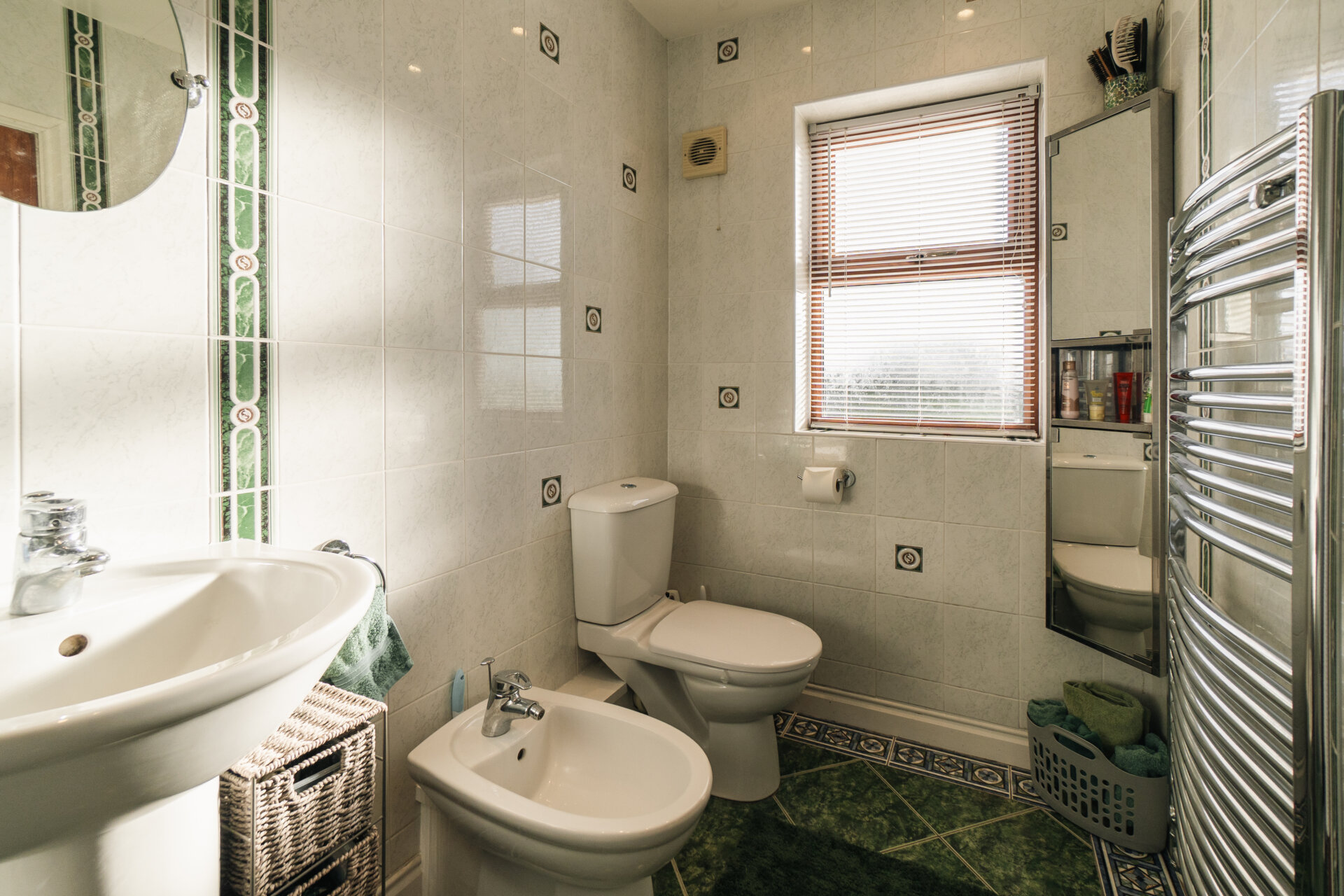 Having tiled flooring and part tiled walls, hand wash basin, opaque window to the side, light fitting to the ceiling and heated ladder style radiator.