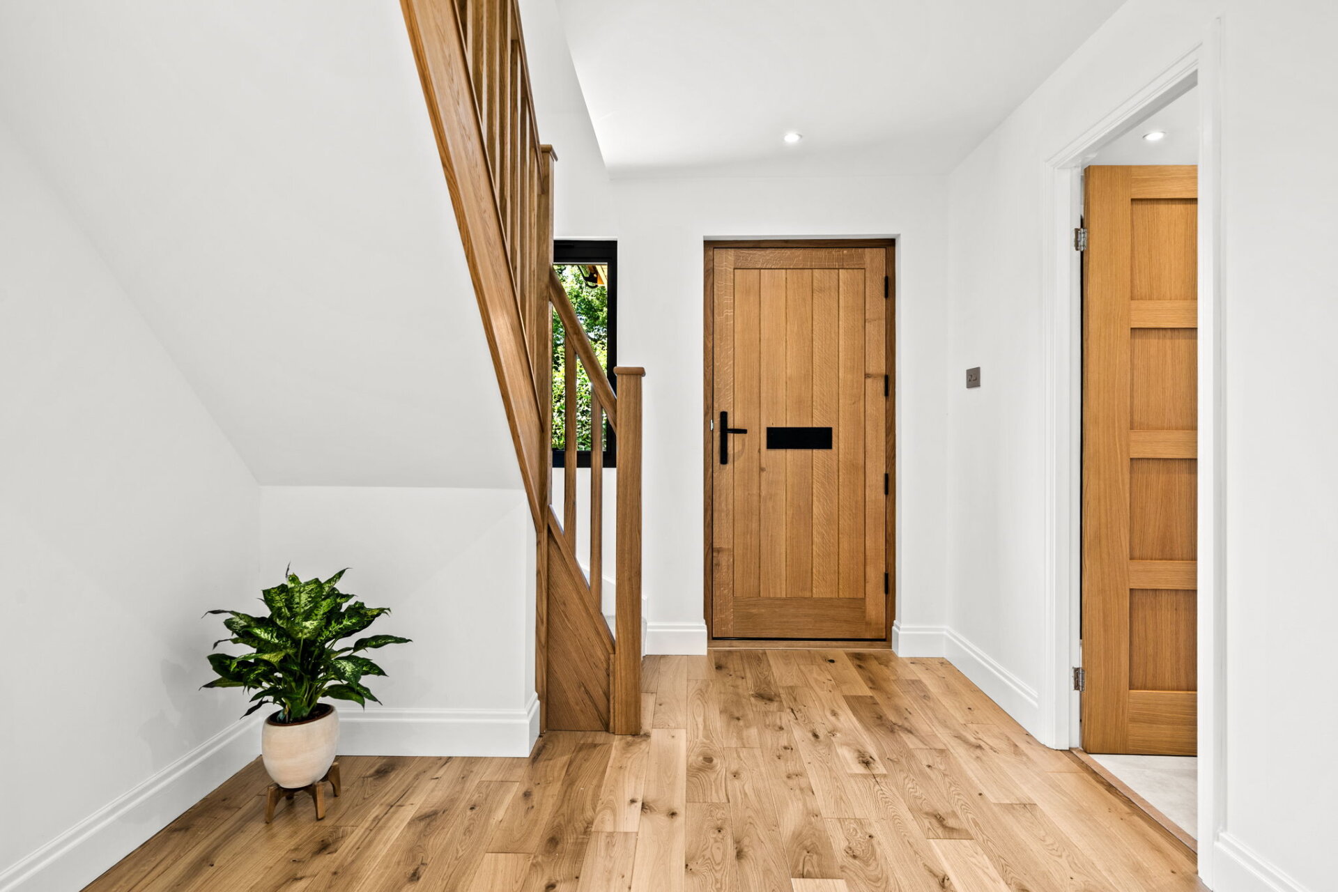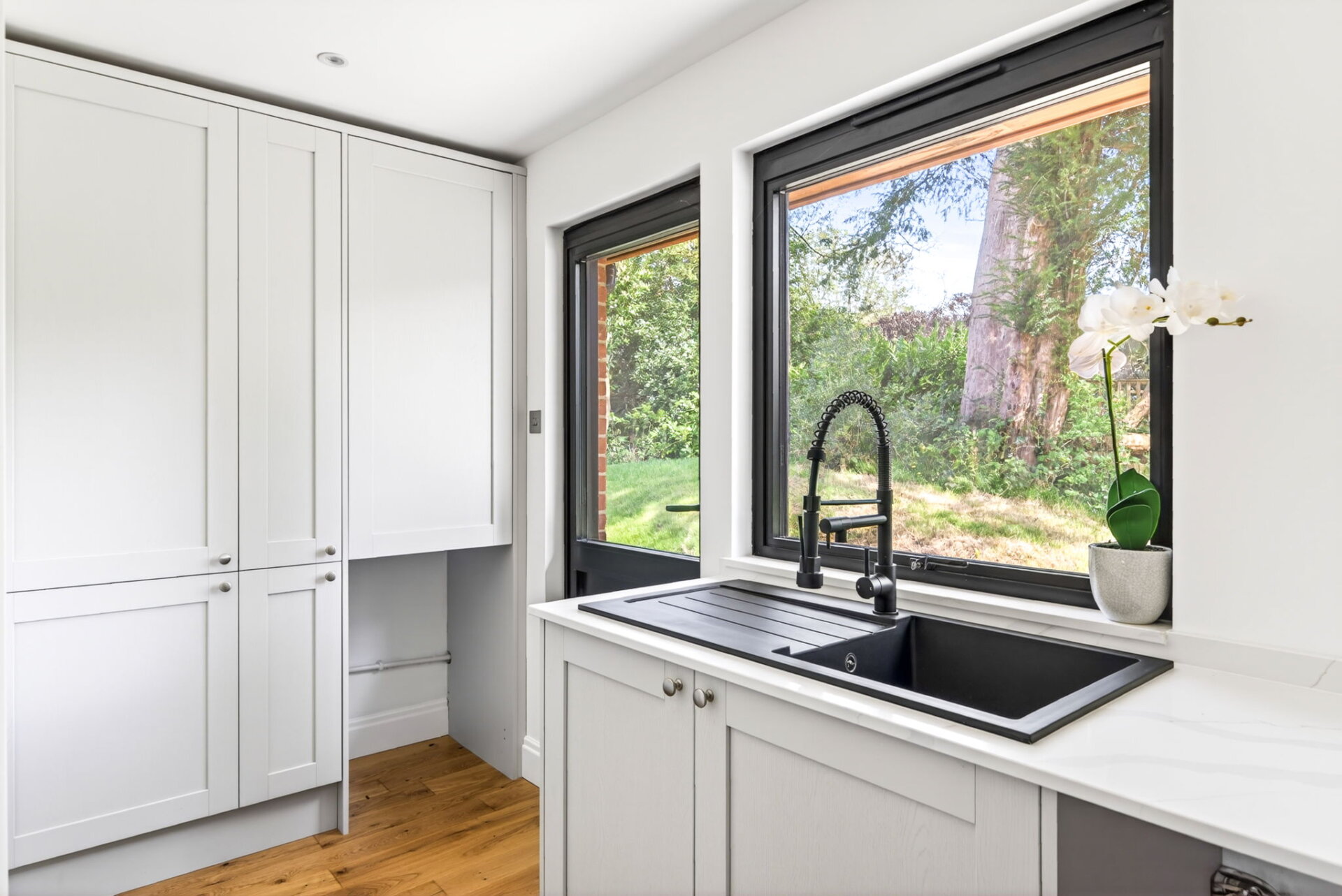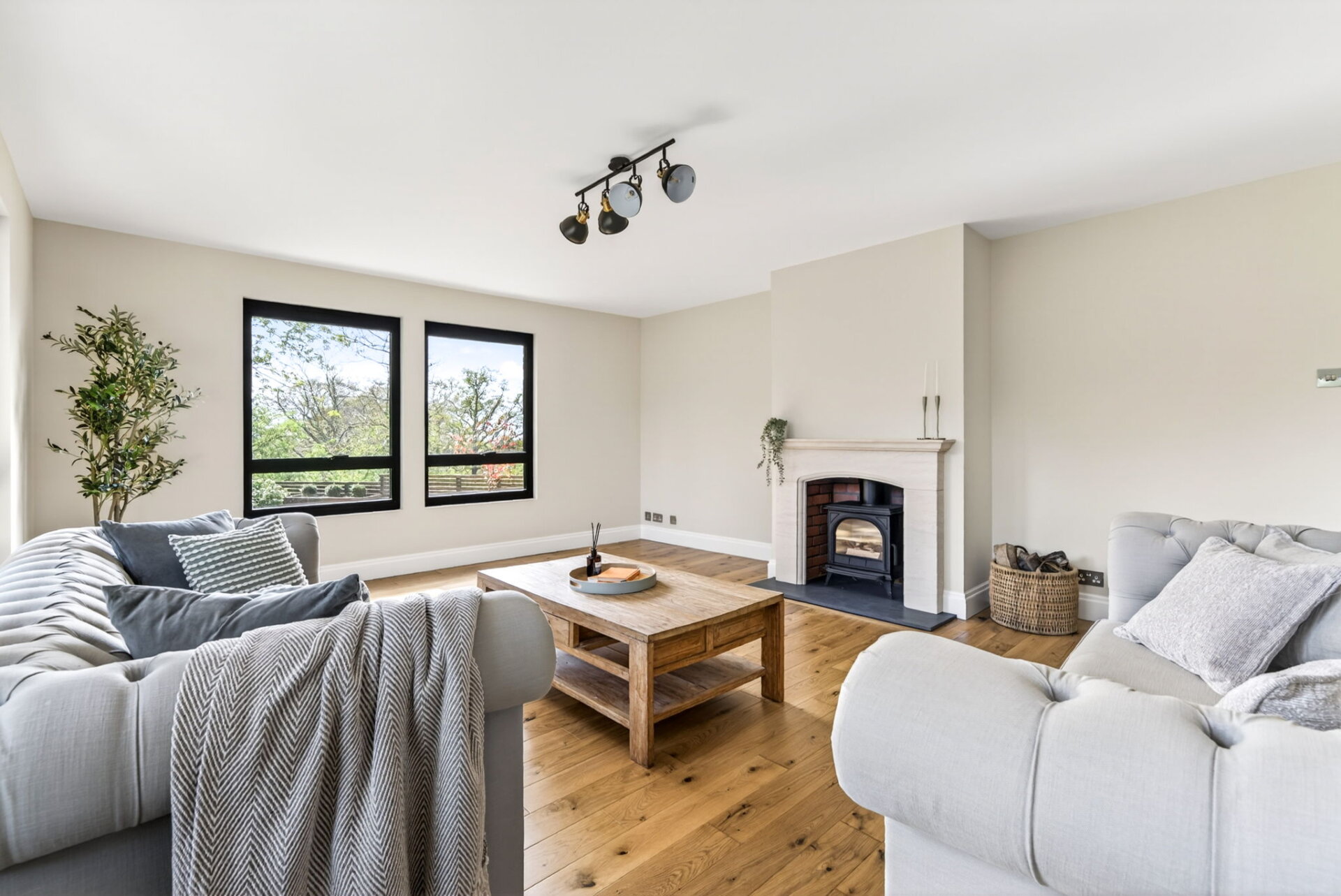 Deer Leap is ready to welcome its next family. The ground floor welcomes you with a light and airy hallway, where engineered hardwood flooring flows through to the reception spaces. Large windows throughout frame views of the wraparound garden, creating an immediate sense of light and openness.