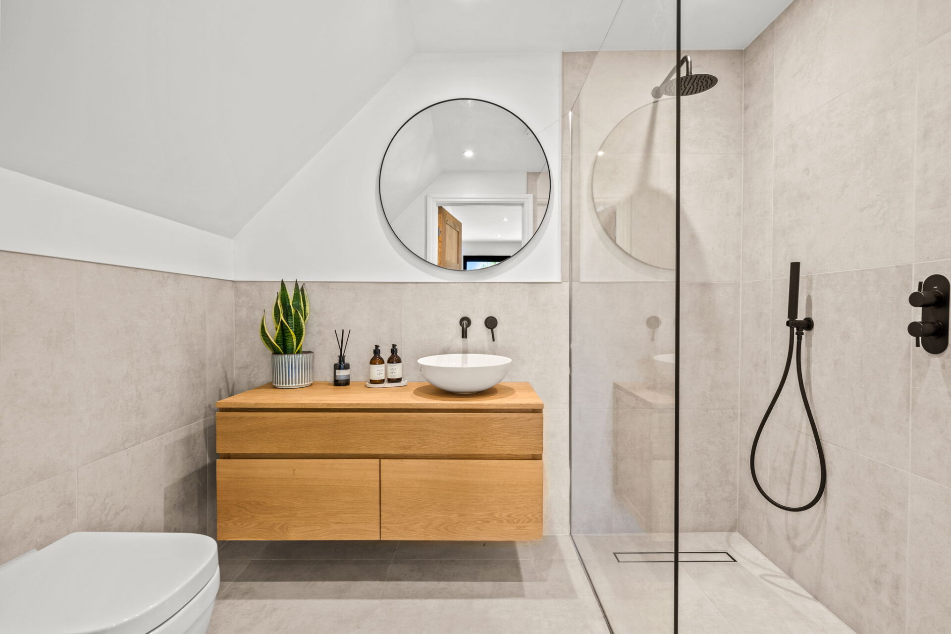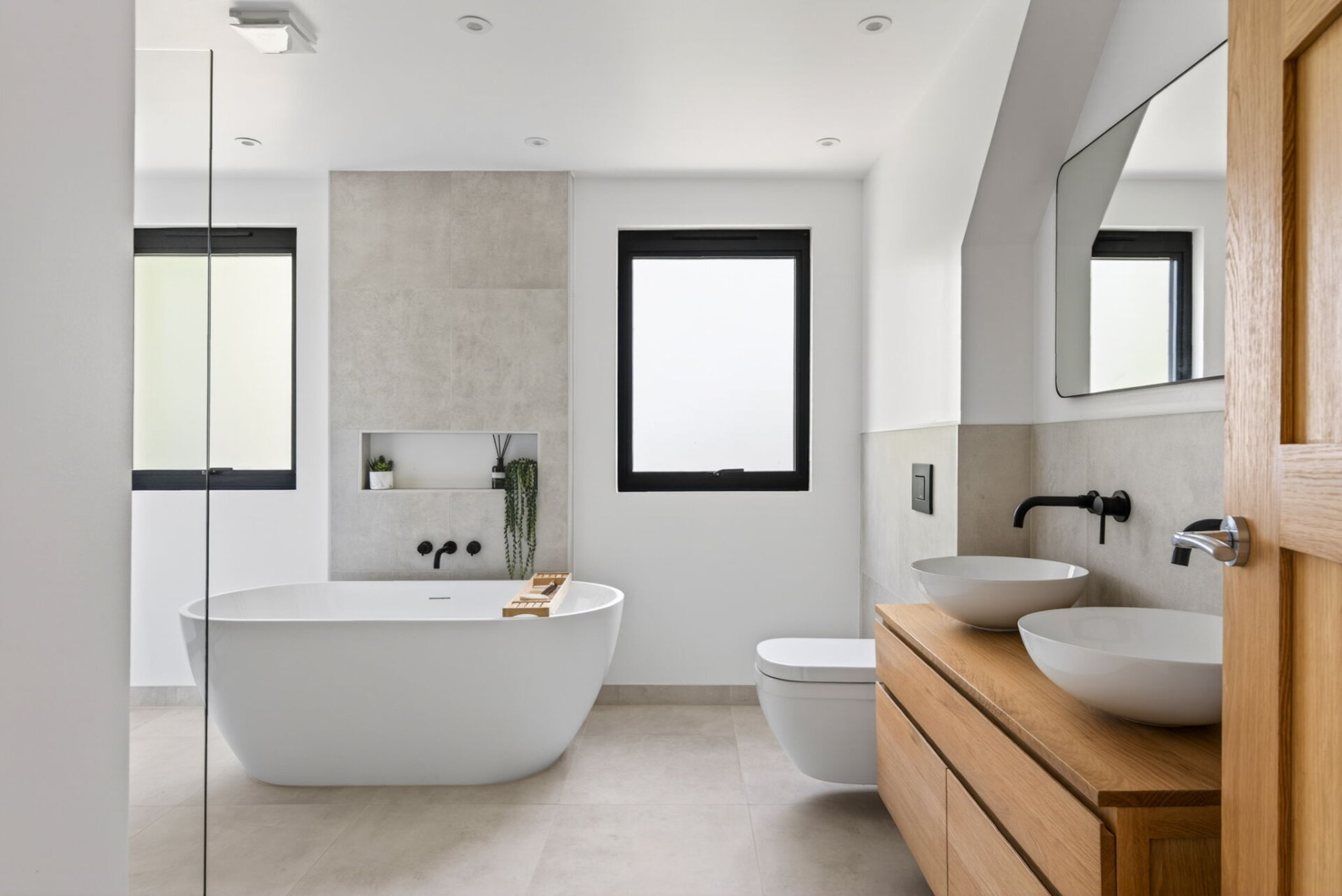 The family bathroom has been beautifully finished, featuring a stunning freestanding bath alongside a separate shower.