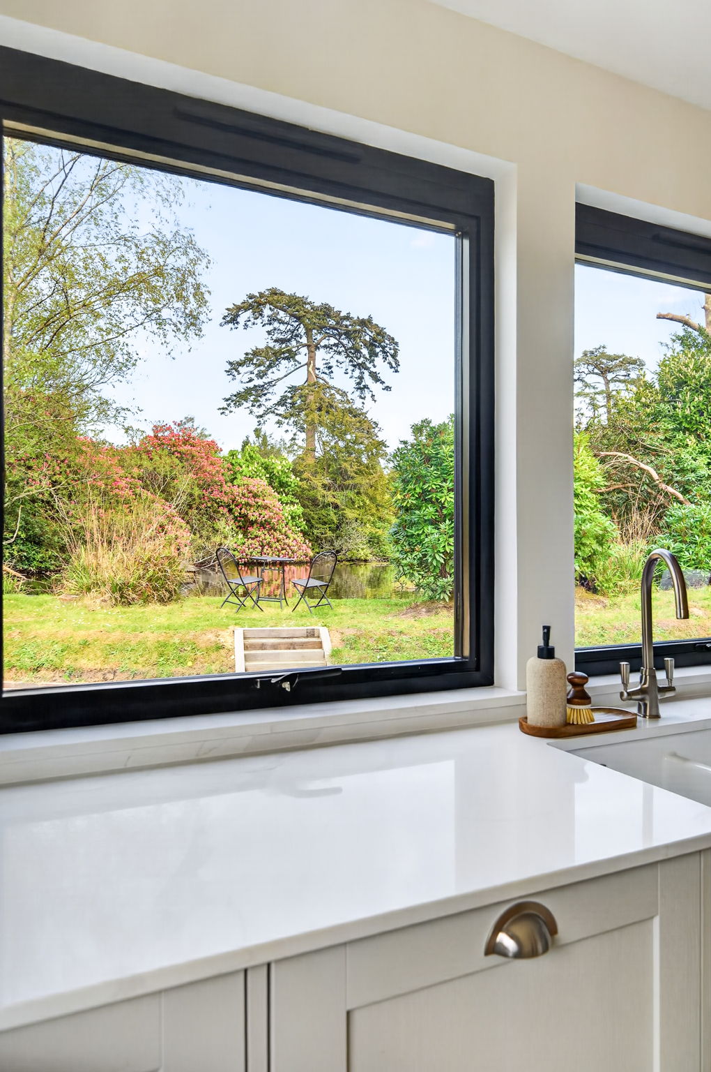 From the moment you arrive, the scene is set; the front of the home looks out across a charming pond, where Rhododendrons shift in colour through the summer months, creating a picturesque setting and the perfect spot to enjoy a morning coffee.
