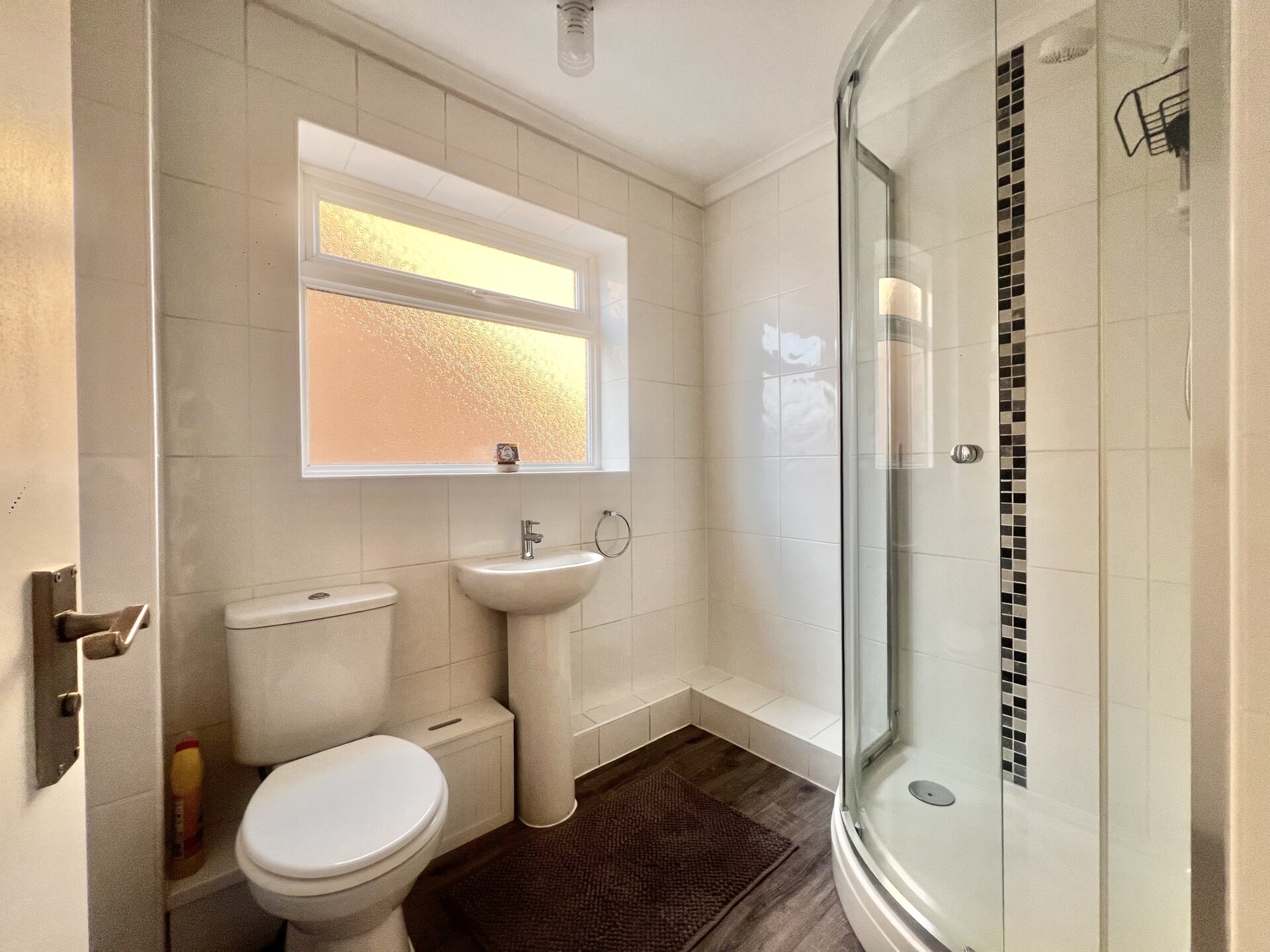 Walk-in shower cubicle with electric shower over, low flush w.c, pedestal wash hand basin, fully tiled walls and splashbacks, laminate floor, UPVC double glazed window, chrome heated towel rail.
