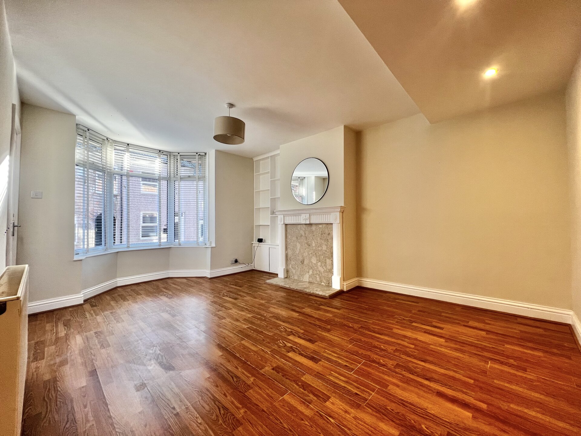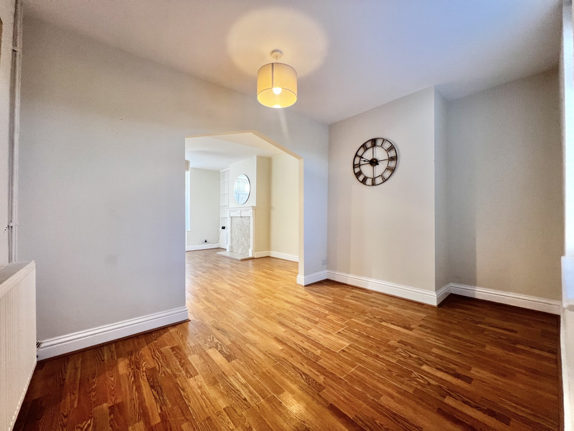 Double glazed bay window to the front elevation, laminate flooring, chimney breast with surround, , recess alcoves to either side, radiator and open arch to dining room