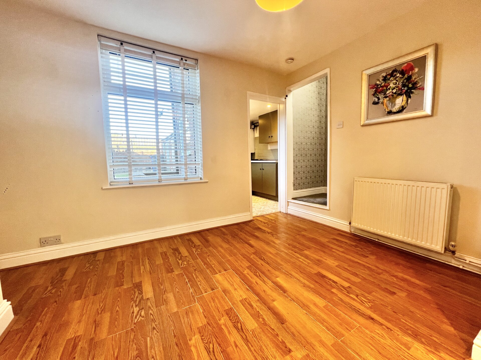 With continued laminate flooring, radiator, recess and double glazed window to the rear elevation, opening to staircases ascending to the first floor and door to kitchen.