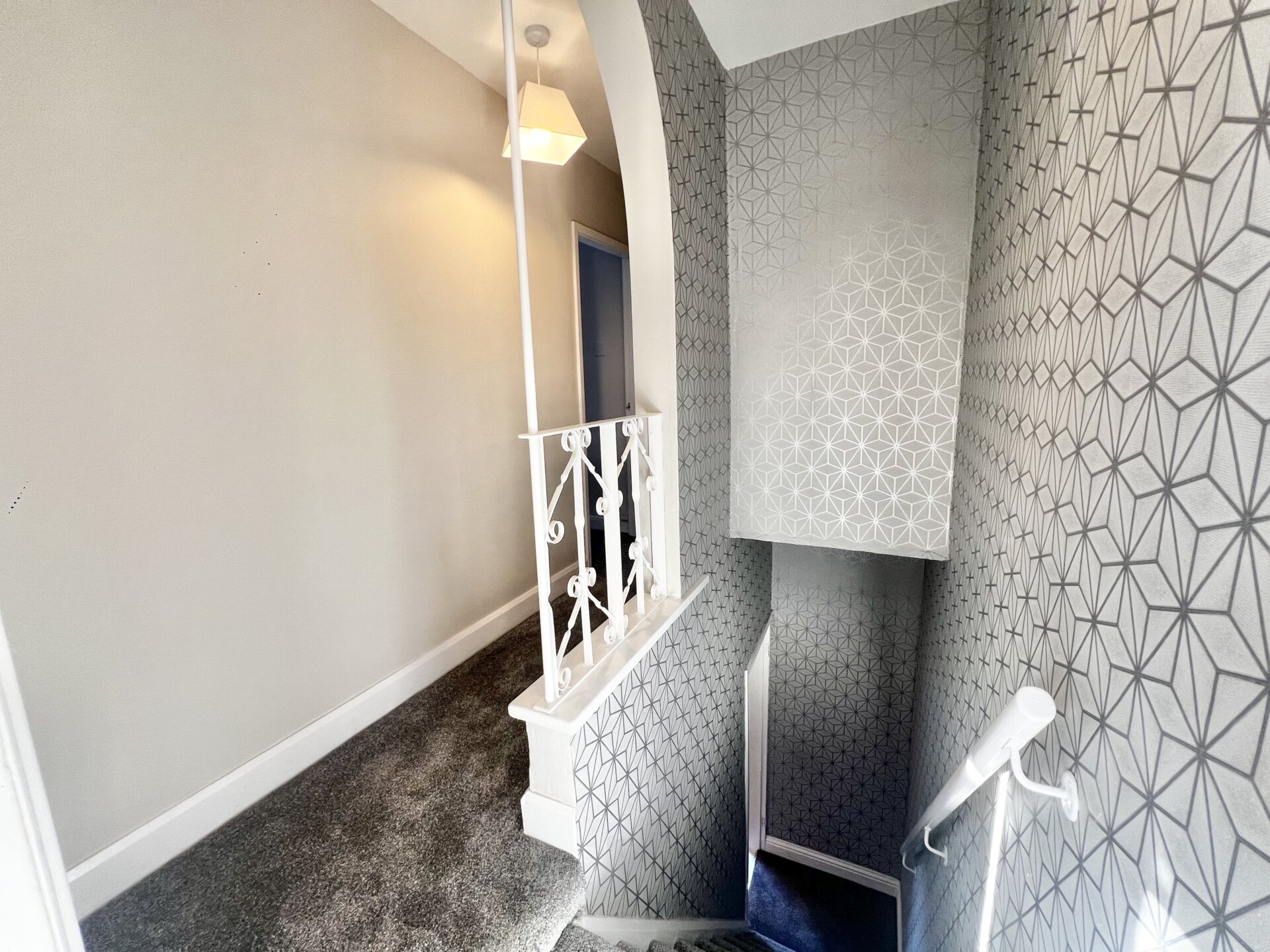 Stars and Landing with carpet flooring, over stairs cupboard, feature iron railing, and doors two bedrooms and bathroom.