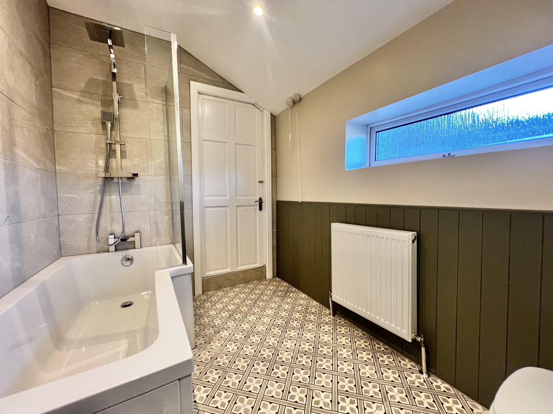 A white three-piece bathroom suite comprising P-shape panelled Bath with shower from the mains having a waterfall shower head and a hand held shower head, pedestal wash hand Basin, low flush WC , tiled walls and splahbacks, spotlights, extractor fan, double glazed window to the left elevation.
